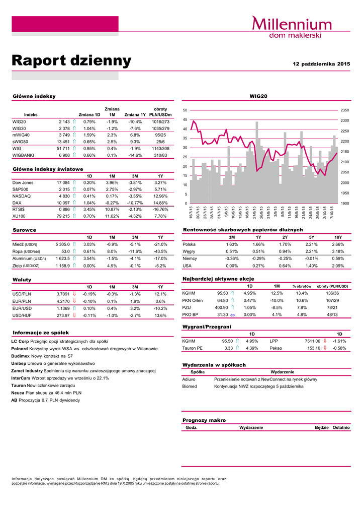 Raport dzienny 12 października 2015 Gł•wne indeksy WIG20 Indeks Zmiana 1D Zmiana 1M obroty Zmiana 1Y PLN/USDm 50 2350 45 2300 WIG20 2 143 0.79% -1.9% -10.4% 1016/273 WIG30 2 378 3 749 1.04% -1.2% -7.6% 1035/279 mWIG40 1.59% 2.3% 6.8% 95/25 sWIG80 13 451 0.65% 2.5% 9.3% 25/6 WIG 51 711 0.95% 0.4% -1.9% 1143/308 30 6 908 0.66% 0.1% -14.6% 310/83 25 WIGBANKI 40 2250 35 2200 2150 2100 20 Gł•wne indeksy światowe 1M 3M 1Y 15 10 2050 17 084 0.20% 3.96% -3.81% 3.27% S&P500 2 015 0.07% 2.75% -2.97% 5.71% NASDAQ 4 830 0.41% 0.17% -3.35% 12.96% 5 1950 DAX 10 097 1.04% -0.27% -10.77% 14.88% 0 1900 RTSI$ 0 886 79 215 3.45% 10.87% -2.13% -16.76% 0.70% 11.02% -4.32% 7.78% 1D 1M 3M 1Y 5 305.0 3.03% -0.9% -5.1% -21.0% Polska 7/10/15 2/10/15 29/9/15 24/9/15 21/9/15 16/9/15 8/9/15 11/9/15 3/9/15 31/8/15 26/8/15 21/8/15 18/8/15 13/8/15 5/8/15 10/8/15 31/7/15 28/7/15 23/7/15 Rentowność skarbowych papier•w dłużnych Surowce Miedź (USD/t) 20/7/15 XU100 2000 15/7/15 Dow Jones 1D 3M 1Y 2Y 5Y 10Y 1.63% 1.66% 1.70% 2.21% 2.66% 53.0 0.61% 8.0% -11.6% -43.5% Węgry 0.51% 0.51% 0.94% 2.21% 3.18% Aluminium (USD/t) 1 623.5 3.54% -1.5% -4.1% -17.0% Niemcy -0.36% -0.29% -0.25% -0.01% 0.59% Złoto (USD/OZ) 1 158.9 0.00% 4.9% -0.1% -5.2% USA 0.00% 0.27% 0.64% 1.40% 2.09% 1D 1M 3M 1Y Ropa (USD/bbl) Najbardziej aktywne akcje Waluty 1D 1M % obrot€w obroty (PLN/USD) USD/PLN 3.7091 -0.19% -0.3% -1.3% 12.1% KGHM 95.50 4.95% 12.5% 13.4% 136/36 EUR/PLN 4.2170 -0.10% 0.1% 1.9% 0.6% PKN Orlen 64.80 0.47% -10.0% 10.6% 107/29 EUR/USD 1.1369 0.10% 0.4% 3.2% -10.2% PZU 400.90 1.05% -8.5% 7.8% 78/21 USD/HUF 273.97 -0.11% -1.0% -2.7% 13.6% PKO BP 31.30 0.00% 4.1% 4.8% 48/13 Wygrani/Przegrani Informacje ze sp•łek 1D LC Corp Przegląd opcji strategicznych dla sp‚łki KGHM Polnord Korzystny wyrok WSA ws. odszkodowań drogowych w Wilanowie Tauron PE 1D 95.50 4.95% LPP 3.33 4.39% Pekao 7511.00 -1.61% 153.10 -0.58% Budimex Nowy kontrakt na S7 Unibep Umowa o generalne wykonawstwo Zamet Industry Spełnieniu się warunku zawieszającego umowy znaczącej Wydarzenia w sp•łkach Sp€łka Wydarzenie InterCars Wzrost sprzedaży we wrześniu o 22.1% Adiuvo Przeniesienie notowań z NewConnect na rynek gł‚wny Tauron Nowi członkowie zarządu Biomed Kontynuacja NWZ rozpoczętego 5 października Neuca Plan skupu za 46.4 mln PLN AB Propozycja 0.7 PLN dywidendy Prognozy makro Godz. Informacje dotyczące powiązań Millennium DM ze sp‚łką, będącą przedmiotem niniejszego raportu oraz pozostałe informacje, wymagane przez Rozporządzenie RM z dnia 19.X.2005 roku umieszczone zostały na ostatniej stronie raportu. Wydarzenie Będzie Ostatnio Informacje ze sp•łek LC Corp Przegląd opcji strategicznych dla sp€łki Zarząd sp‚łki rozpoczął przegląd opcji strategicznych, nie wyklucza poszukiwań inwestora strategicznego (w tym branżowego lub finansowego). Przy przeprowadzeniu przeglądu sp‚łkę wspierać będzie J.P. Morgan, jako wyłączny doradca finansowy. Sp‚łka zastrzegła, że żadne decyzje związane z wyborem konkretnej opcji nie zostały dotąd podjęte i nie ma pewności, czy taka decyzja zostanie podjęta w przyszłości. Zarząd rozpoczął przygotowanie raportu due diligence sp‚łki i jej sp‚łek zależnych, w celu ewentualnego p‚źniejszego udostępnienia go potencjalnym inwestorom. Polnord Korzystny wyrok WSA ws. odszkodowań drogowych w Wilanowie Sp‚łka podała, że Wojew‚dzki Sąd Administracyjny wydał korzystne dla niej wyroki w kwestii odszkodowań drogowych w Wilanowie. WSA przesądził o istnieniu odpowiedzialności odszkodowawczej Miasta Stołecznego Warszawy w stosunku do sp‚łki z tytułu wygaśnięcia prawa użytkowania wieczystego działek przeznaczonych pod drogi, uchylając tym samym wcześniejsze decyzje prezydenta m.st. Warszawy oraz wojewody mazowieckiego (kt‚re odmawiały sp‚łce odszkodowania z tytułu wygaśnięcia prawa użytkowania wieczystego działek o łącznej powierzchni ok. 10 ha, kt‚re zgodnie z obowiązującym planem miejscowym przeznaczone są pod drogi publiczne). Wyroki z dnia 9 października dotyczą odszkodowania za działki gruntu o łącznej powierzchni 8.5 ha, zaś w dniu 12 października ogłoszone zostaną wyroki w sprawach o analogicznym stanie faktycznym i dotyczące odszkodowania za działki o łącznej powierzchni 1.5 ha. Wyroki nie są prawomocne, przysługuje od nich skarga kasacyjna do Naczelnego Sądu Administracyjnego. Budimex Nowy kontrakt na S7 Sp‚łka podpisała w dniu 9 października z Generalną Dyrekcją Dr‚g Krajowych i Autostrad Oddział w Gdańsku umowę na budowę drogi S7 Gdańsk (A1) - Elbląg (S22) odc. Koszwały (DK nr 7, w Koszwały) - Elbląg (z węzłem Kazimierzowo). Wartość umowy wynosi 1.28 mld PLN netto, zaś termin zakończenia rob‚t wynosi 27 miesięcy od daty zawarcia umowy. Unibep Umowa o generalne wykonawstwo Sp‚łka zawarła w dniu 8 października z Smart City umowę o wykonanie rob‚t budowlanych w systemie generalnego wykonawstwa: wybudowanie osiedla mieszkaniowego pod nazwą URSA - Smart City (budowa w dw‚ch etapach czterech nowoczesnych i specjalnie zaprojektowanych pod względem funkcjonalności budynk‚w mieszkalnych, wraz z garażem podziemnym, zagospodarowaniem terenu oraz niezbędnymi robotami towarzyszącymi przy ul. Hennela w Warszawie, Dzielnica Ursus). Pierwszy etap obejmuje realizację za 43.7 mln PLN netto w okresie październik 2015 - luty 2017 jednego budynku mieszkalnego obejmującego 181 mieszkań i 13 lokali usługowych, a także 359 miejsc postojowych. Termin ewentualnej realizacji drugiego etapu został określony na 59 tygodni od dnia rozpoczęcia rob‚t w ramach tego etapu, a wynagrodzenie to 23.8 mln PLN. Smart City sp. z o.o. sp. k. (Zamawiający) została utworzona jako wsp‚lne przedsięwzięcie przez sp‚łki z grup kapitałowych UNIBEP S.A. i CPD S.A. Zamet Industry Spełnieniu się warunku zawieszającego umowy znaczącej Sp‚łka poinformowała o otrzymaniu od