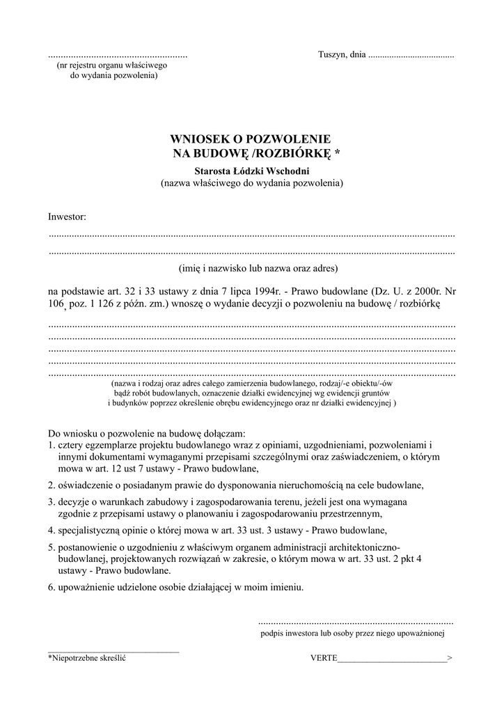 ....................................................... Tuszyn, dnia ..................................... (nr rejestru organu właściwego do wydania pozwolenia) WNIOSEK O POZWOLENIE NA BUDOWĘ /ROZBIÓRKĘ * Starosta Łódzki Wschodni (nazwa właściwego do wydania pozwolenia) Inwestor: ................................................................................................................................................................ ................................................................................................................................................................ (imię i nazwisko lub nazwa oraz adres) na podstawie art. 32 i 33 ustawy z dnia 7 lipca 1994r. - Prawo budowlane (Dz. U. z 2000r. Nr 106, poz. 1 126 z późn. zm.) wnoszę o wydanie decyzji o pozwoleniu na budowę / rozbiórkę .......................................................................................................................................................... .......................................................................................................................................................... .......................................................................................................................................................... .......................................................................................................................................................... .......................................................................................................................................................... (nazwa i rodzaj oraz adres całego zamierzenia budowlanego, rodzaj/-e obiektu/-ów bądź robót budowlanych, oznaczenie działki ewidencyjnej wg ewidencji gruntów i budynków poprzez określenie obrębu ewidencyjnego oraz nr działki ewidencyjnej ) Do wniosku o pozwolenie na budowę dołączam: 1. cztery egzemplarze projektu budowlanego wraz z opiniami, uzgodnieniami, pozwoleniami i innymi dokumentami wymaganymi przepisami szczególnymi oraz zaświadczeniem, o którym mowa w art. 12 ust 7 ustawy - Prawo budowlane, 2. oświadczenie o posiadanym prawie do dysponowania nieruchomością na cele budowlane, 3. decyzje o warunkach zabudowy i zagospodarowania terenu, jeżeli jest ona wymagana zgodnie z przepisami ustawy o planowaniu i zagospodarowaniu przestrzennym, 4. specjalistyczną opinie o której mowa w art. 33 ust. 3 ustawy - Prawo budowlane, 5. postanowienie o uzgodnieniu z właściwym organem administracji architektonicznobudowlanej, projektowanych rozwiązań w zakresie, o którym mowa w art. 33 ust. 2 pkt 4 ustawy - Prawo budowlane. 6. upoważnienie udzielone osobie działającej w moim imieniu. ............................................................................. podpis inwestora lub osoby przez niego upoważnionej _______________________________ *Niepotrzebne skreślić VERTE__________________________> Do wniosku o pozwolenie na rozbiórkę dołączam1: 1. zgodę właściciela obiektu, 2. szkic usytuowania obiektu budowlanego, 3. opis zakresu i sposobu prowadzenia robót rozbiórkowych, 4. opis sposobu zapewnienia bezpieczeństwa ludzi i mienia, 5. pozwolenia, uzgodnienia lub opinie innych organów, a także inne dokumenty., wymagane przepisami szczególnymi, 6. w zależności od potrzeb, projekt rozbiórki obiektu, 7. upoważnienie udzielone osobie działającej w moim imieniu. ......................................................................................... (podpis inwestora lub osoby przez niego upoważnionej) _______________________________ *Niepotrzebne skreślić