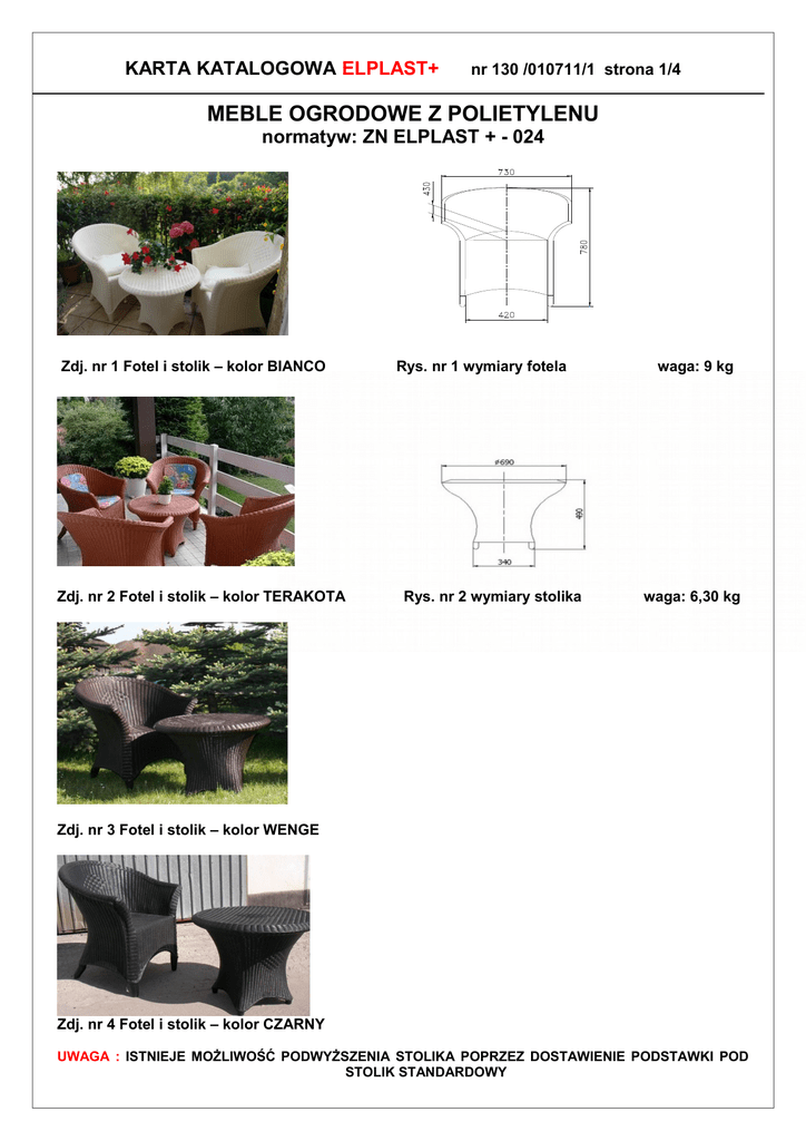 KARTA KATALOGOWA ELPLAST+ nr 130 /010711/1 strona 1/4 MEBLE OGRODOWE Z POLIETYLENU normatyw: ZN ELPLAST + - 024 Zdj. nr 1 Fotel i stolik – kolor BIANCO Zdj. nr 2 Fotel i stolik – kolor TERAKOTA Rys. nr 1 wymiary fotela Rys. nr 2 wymiary stolika waga: 9 kg waga: 6,30 kg Zdj. nr 3 Fotel i stolik – kolor WENGE Zdj. nr 4 Fotel i stolik – kolor CZARNY UWAGA : ISTNIEJE MOŻLIWOŚĆ PODWYŻSZENIA STOLIKA POPRZEZ DOSTAWIENIE PODSTAWKI POD STOLIK STANDARDOWY KARTA KATALOGOWA ELPLAST+ nr 130 /010711/1 strona 2/4 Rys. nr 3 wymiary stolika podwyższonego Rys. nr 4 wymiary podstawki pod stolik waga: 8,80 kg waga: 2,50 kg Opis techniczny „ELPLAST+” Sp. z o.o. produkuje polietylenowe meble ogrodowe imitujące ratan. Zastosowane tworzywo oraz wykonanie mebli techniką odlewania rotacyjnego powoduje że meble charakteryzują się wysokimi i walorami użytkowymi – długa żywotność i zachowany pierwotny wygląd przez wiele lat. Standardowo meble produkowane są w czterech kolorach : BIANCO – ECRI ,TERAKOTA, WENGE, CZARNY). Na życzenie klienta istnieje możliwość wykonania większej partii mebli w dowolnie wybranym kolorze. Zalety trwałe bezpieczne estetyczne łatwe w utrzymaniu czystości odporne na działanie słońca, deszczu, wiatru, śniegu i mrozu Załączniki Zdjęcia realizacji Cennik Norma ZN ELPLAST + - 024 ( kłódka) Deklaracja Zgodności (kłódka) KARTA KATALOGOWA ELPLAST+ nr 130 /010711/1 strona 3/4 NAKŁADKA NA BLAT STOLIKA Nakładka na blat stołu wykonana może być z czterech różnych rodzajów tworzywa. Zapewnia ona komfort użytkowania, tworzy płaską powierzchnię oraz zabezpiecza blat stołu przed zarysowaniem i uszkodzeniem. Firma Elplast + Sp z o.o. ma w ofercie następujące rodzaje nakładek: 1. Nakładka z tworzywa PWC 2 mm 2. Nakładka z folii PP 0,8 mm(matowa) KARTA KATALOGOWA ELPLAST+ 3. Nakładka z folii miękkiej PCV 0,75 mm (transparentna) 4. Nakładka z folii miękkiej PCV 2 mm (transparentna) nr 130 /010711/1 strona 4/4