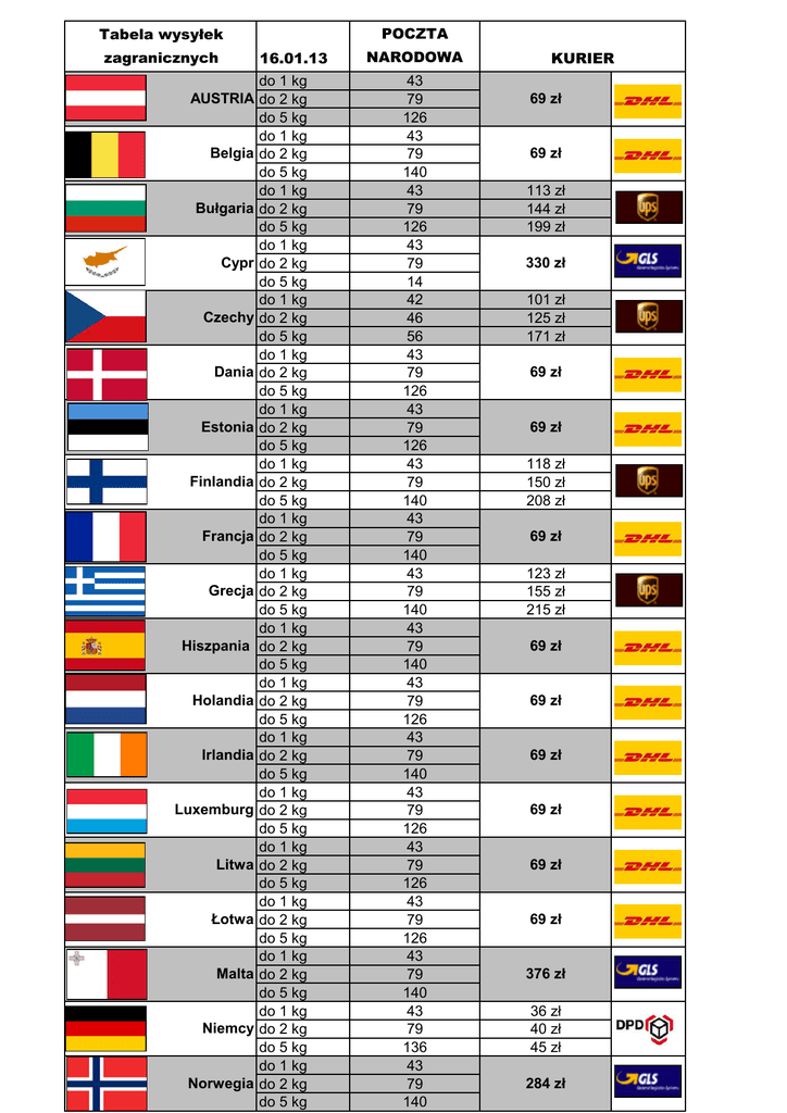 POCZTA Tabela wysyłek zagranicznych 16.01.13 do 1 kg AUSTRIA do 2 kg do 5 kg do 1 kg Belgia do 2 kg do 5 kg do 1 kg Bułgaria do 2 kg do 5 kg do 1 kg Cypr do 2 kg do 5 kg do 1 kg Czechy do 2 kg do 5 kg do 1 kg Dania do 2 kg do 5 kg do 1 kg Estonia do 2 kg do 5 kg do 1 kg Finlandia do 2 kg do 5 kg do 1 kg Francja do 2 kg do 5 kg do 1 kg Grecja do 2 kg do 5 kg do 1 kg Hiszpania do 2 kg do 5 kg do 1 kg Holandia do 2 kg do 5 kg do 1 kg Irlandia do 2 kg do 5 kg do 1 kg Luxemburg do 2 kg do 5 kg do 1 kg Litwa do 2 kg do 5 kg do 1 kg Łotwa do 2 kg do 5 kg do 1 kg Malta do 2 kg do 5 kg do 1 kg Niemcy do 2 kg do 5 kg do 1 kg Norwegia do 2 kg do 5 kg NARODOWA 43 79 126 43 79 140 43 79 126 43 79 14 42 46 56 43 79 126 43 79 126 43 79 140 43 79 140 43 79 140 43 79 140 43 79 126 43 79 140 43 79 126 43 79 126 43 79 126 43 79 140 43 79 136 43 79 140 KURIER 69 zł 69 zł 113 zł 144 zł 199 zł 330 zł 101 zł 125 zł 171 zł 69 zł 69 zł 118 zł 150 zł 208 zł 69 zł 123 zł 155 zł 215 zł 69 zł 69 zł 69 zł 69 zł 69 zł 69 zł 376 zł 36 zł 40 zł 45 zł 284 zł do 1 kg Portugalia do 2 kg do 5 kg do 1 kg Rumunia do 2 kg do 5 kg do 1 kg Słowacja do 2 kg do 5 kg do 1 kg Szwecja do 2 kg do 5 kg do 1 kg Szwajcaria do 2 kg do 5 kg do 1 kg Turcja do 2 kg do 5 kg do 1 kg Węgry do 2 kg do 5 kg do 1 kg Wielka Brytania do 2 kg do 5 kg do 1 kg Włochy do 2 kg do 5 kg do 1 kg USA do 2 kg do 5 kg do 1 kg do 2 kg Białoruś do 5 kg do 10 kg do 1 kg Ukraina do 2 kg do 5 kg do 1 kg Rosja do 2 kg do 5 kg do 1 kg Kazachstan do 2 kg do 5 kg 43 79 140 43 79 140 42 46 56 43 79 140 43 79 126 43 79 140 43 79 126 43 79 140 43 79 140 54 102 212 43 79 126 154 43 79 126 43 79 140 62 124 253 69 zł 113 zł 144 zł 199 zł 101 zł 125 zł 171 zł 69 zł 112 zł 347 zł 108 zł 136 zł 183 zł 69 zł 69 zł 446 zł 556 zł 790 zł - - - -