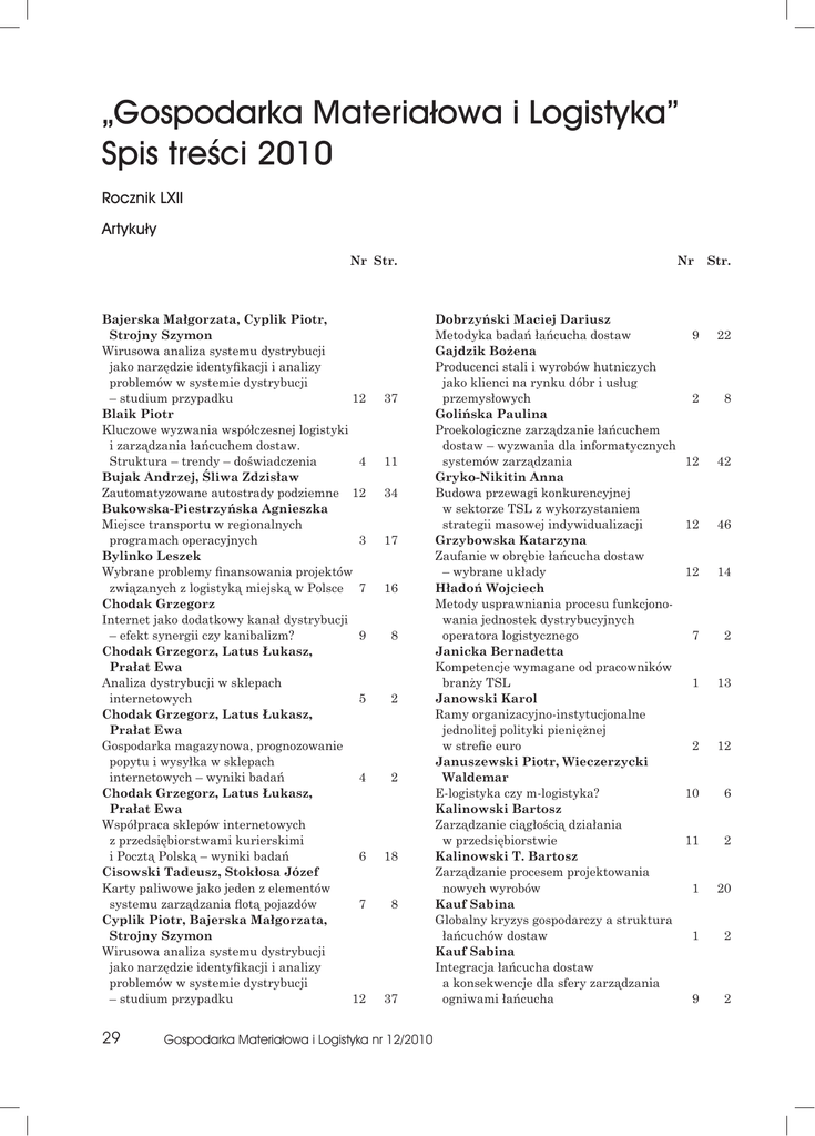„Gospodarka Materiałowa i Logistyka” Spis treści 2010