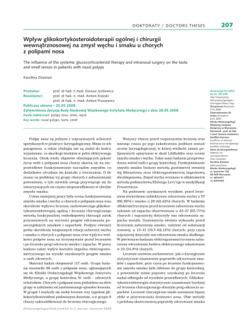 DOKTORATY / DOCTORS THESES 207 Wpływ glikokortykosteroidoterapii ogólnej i chirurgii wewnątrznosowej na zmysł węchu i smaku u chorych z polipami nosa The influence of the systemic glucocorticosteroid therapy and intranasal surgery on the taste and smell senses in patients with nasal polyps Karolina Dżaman prof. dr hab. n med. Dariusz Jurkiewicz prof. dr hab. n. med. Antoni Krzeski prof. dr hab. n. med. Antoni Pruszewicz Publiczna obrona – 20.05.2008 Zatwierdzona decyzją Rady Naukowej Wojskowego Instytutu Medycznego z dnia 28.05.2008 Promotor: Recenzenci: Hasła indeksowe: polipy nosa, smak, węch Key words: nasal polyps, taste, smell Polipy nosa są jednym z najczęstszych schorzeń spotykanych w praktyce laryngologicznej. Mimo to ich patogeneza, a także etiologia nie są nadal do końca wyjaśnione, co skutkuje brakiem w pełni efektywnego leczenia. Obok wielu objawów obniżających jakość życia osób z polipami nosa chorzy skarżą się na nieprawidłowe funkcjonowanie narządów zmysłów, co dodatkowo utrudnia im kontakt z otoczeniem. O ile znane są problemy tej grupy chorych z zaburzeniami powonienia, o tyle niewiele uwagi przywiązuje się do towarzyszących im często nieprawidłowości w obrębie zmysłu smaku. Celem niniejszej pracy była ocena funkcjonowania zmysłu smaku i węchu u chorych z polipami nosa oraz określenie wpływu leczenia zachowawczego glikokortykosteroidoterapią ogólną i leczenia chirurgicznego metodą funkcjonalnej endoskopowej chirurgii zatok przynosowych na wartości progów odczuwania poszczególnych smaków i zapachów. Podjęto również próbę określenia wzajemnych relacji zaburzeń węchu i smaku u chorych z polipami nosa oraz wpływu wielkości polipów nosa na otrzymywane przed leczeniem i po leczeniu progi odczucia smaku i zapachu. W pracy badano także wpływ kształtu impulsu elektrogustometrycznego na wyniki uzyskanych progów smaku u osób zdrowych. Materiał badań obejmował 117 osób. Grupę badaną stanowiło 66 osób z polipami nosa, zgłaszających się do Kliniki Otolaryngologii Wojskowego Instytutu Medycznego, a grupę kontrolną 51 osób – zdrowych ochotników. Chorych z polipami nosa podzielono na dwie grupy w zależności od zastosowanego sposobu leczenia. W grupie I znalazły się osoby leczone trzy tygodnie glikokortykosteroidem podawanym doustnie, a w grupie II chorzy zakwalifikowani do leczenia chirurgicznego. Otolar yngologia Polska tom 63, nr 2, mar zec – k wiecień 20 0 9 Wszyscy chorzy przed rozpoczęciem leczenia oraz miesiąc czasu po jego zakończeniu poddani zostali ocenie laryngologicznej, w której wielkość zmian polipowatych opisywano w skali Lildholdta oraz ocenie zmysłu smaku i węchu. Takie same badania przeprowadzono wśród osób z grupy kontrolnej. Funkcjonowanie zmysłu smaku badano metodą gustometrii swoistej wg Börnsteina oraz elektrogustometrią impulsową dwubiegunową. Zmysł węchu oceniano w olfaktometrii metodą podmuchową Elsberga-Levy’ego w modyfikacji Pruszewicza. Na podstawie uzyskanych wyników, przed leczeniem stwierdzono subiektywne zaburzenia węchu u 57 (86,36%) i smaku u 28 (42,42%) chorych. W badaniu olfaktometrycznym przed leczeniem zaburzenia węchu zależnie od zapachu obserwowano u 43-47 (65–71%) chorych i najczęściej dotyczyły one odczuwania zapachu wanilii. Gustometria swoista wykazała przed leczeniem zaburzenia smaku, zależnie od substancji testowej, u 13–41 (19,7–62,12%) chorych, przy czym najczęściej dotyczyły one odczuwania smaku słodkiego. W pierwszym badaniu elektrogustometrycznym zaburzenia odczuwania bodźca elektrycznego odnotowano w 23 (34,8%) chorych. Leczenie zarówno zachowawcze, jak i chirurgicznie statystycznie znamiennie poprawiło odczuwanie smaków i zapachów, przy czym po leczeniu funkcjonowanie zmysłu smaku było zbliżone do grupy kontrolnej, a powonienie mimo poprawy uzyskanej po leczeniu nadal odbiegało od wyników prawidłowych. Glikokortykosteroidoterapia statystycznie znamiennie bardziej od leczenia chirurgicznego obniżyła próg odczucia zapachów. Leczenie chirurgiczne miało natomiast lepszy efekt w przywracaniu drożności nosa. Obie metody z podobną skutecznością poprawiły odczuwanie smaku Otolaryngol Pol 2009; 63 (2): 207-208 ©by Towarzystwo Otorynolaryngologów – Chirurgów Głowy i Szyi Otrzymano/Received: 5.01.2009 Zaakceptowano do druku/Accepted: 8.01.2009 Klinika Otolaryngologii Wojskowy Instytut Medyczny w Warszawie Kierownik : prof. dr hab. n med. Dariusz Jurkiewicz Konflikt interesu/ Conflicts of interest: Autorzy pracy nie zgłaszają konfliktu interesów. Adres do korespondencji/ Address for correspondence: imię i nazwisko: Karolina Dżaman adres pocztowy: Klinika Otolaryngologii ul. Szaserów 128 00-909 Warszawa tel. 6816471 fax 6816462 208 DOKTORATY / DOCTORS THESES przez chorych. Powrót prawidłowego funkcjonowania węchu i smaku po leczeniu nie zależał od wielkości zmian polipowatych stwierdzanych u chorych przed leczeniem. Przeprowadzona analiza statystyczna wykazała, że przed leczeniem subiektywna ocena zmysłu smaku przez chorych korelowała z oceną zmysłu węchu. Natomiast w badaniu przeprowadzonym po leczeniu tylko u osób leczonych zachowawczo poprawa węchu wiązała się z poprawą smaku. Na podstawie obserwacji przeprowadzonych w grupie kontrolnej stwierdzono, że kształt impulsu wykorzystywanego w elektrogustometrii nie miał statystycznie znamiennego wpływu na wyniki uzyskanych progów smaku. Otolar yngologia Polska tom 63, nr 2, mar zec – k wiecień 20 0 9