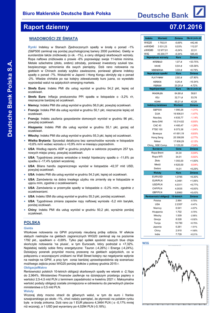 Biuro Maklerskie Deutsche Bank Polska 07.01.2016 Raport dzienny WIADOMOŚCI ZE ŚWIATA Rynki Indeksy w Stanach Zjednoczonych spadły w środę o ponad -1% Deutsche Bank Polska S.A. (S&P500 zamknął się poniżej psychologicznej bariery 2000 punktów). Giełdy w eurolandzie także zniżkowały (o ok. -1%), a ceny obligacji skarbowych wzrosły. Ropa naftowa zniżkowała o prawie -6% poprawiając swoje 11-letnie minima. Metale szlachetne (złoto, srebro) zdrożały, ponieważ inwestorzy szukali tzw. bezpiecznego schronienia dla swych pieniędzy. Dziś rano notowania na giełdach w Chinach zostały szybko zawieszone, ponieważ główne indeksy spadły o ponad -7%. Wskaźniki w Japonii i Hong Kongu obniżyły się o ponad -2%. Władze chińskie po raz kolejny zdewaluowały kurs juana, co wywołało wyprzedaż walut na azjatyckich emerging markets. Indeks Wartość Zmiana Obrót (m ln zł) WIG20 mWIG40 sWIG80 WIG 1 792,01 -0,69% 442,46 3 531,23 0,53% 112,07 12 977,01 -0,24% 22,31 45 200,77 Największe wzrosty -0,34% Kurs 585,45 Zmiana INTERBUD 1,07 zł +33.75% HAWE 0,54 zł +25.58% MDIENERGIA Największe spadki 3,59 zł Kurs +8.79% Zmiana PLATYNINW 2,92 zł -27.90% KERDOS 0,26 zł -10.34% FEERUM Najaktywniejsi 20,20 zł Kurs Obrót (m ln zł) PKNORLEN 64,68 zł 58,61 PZU 32,71 zł 53,76 KGHM 60,21 zł Wartość 42,26 Zmiana S&P500 1 990,26 -1,31% DJIA 16 906,51 -1,47% Nasdaq 4 835,77 -1,14% Xetra DAX 10 214,02 -0,93% CAC 40 4 480,47 -1,26% FTSE 100 6 073,38 -1,04% Bovespa 41 691,19 -0,83% Hang Seng 20 398,99 -2,77% Nikkei 17 806,29 -2,12% Chiny_ SSE Comp. 3 125,00 -7,04% Surowce Cena Zmiana Ropa Brent 34,34 -5,94% Ropa WTI 34,01 -5,92% Złoto 1 093,00 +1,50% Miedź 4 620,00 -0,54% Srebro 14,01 +0,29% Strefa Euro: Indeks PMI dla usług wyniósł w grudniu 54,2 pkt, lepiej od oczekiwań. Strefa Euro: Inflacja producencka PPI spadła w listopadzie o -3,2% r/r, nieznacznie bardziej od oczekiwań. Niemcy: Indeks PMI dla usług wyniósł w grudniu 56,0 pkt, powyżej oczekiwań. Francja: Indeks PMI dla usług wyniósł w grudniu 50,1 pkt, nieznacznie lepiej od Indeksy światowe oczekiwań. Francja: Indeks zaufania gospodarstw domowych wyniósł w grudniu 96 pkt., powyżej oczekiwań. Hiszpania: Indeks PMI dla usług wyniósł w grudniu 55,1 pkt, gorzej od oczekiwań. Włochy: Indeks PMI dla usług wyniósł w grudniu 55,3 pkt, lepiej od oczekiwań. Wielka Brytania: Sprzedaż detaliczna bez samochodów wzrosła w listopadzie a +0,6% m/m wobec wzrostu o +0,9% m/m w miesiącu poprzednim. USA: Według raportu ADP w grudniu przybyło w sektorze prywatnym 257 tys. nowych miejsc pracy, powyżej oczekiwań. USA: Tygodniowa zmiana wniosków o kredyt hipoteczny spadła o -11,6% po spadku o -17,4% tydzień wcześniej. USA: Bilans handlu zagranicznego wyniósł w listopadzie -42,37 mld USD, powyżej oczekiwań. Waluty Kurs Zmiana EUR/USD 1,0785 +0,30% EUR/PLN 4,3481 +1,06% USD/PLN 4,0311 +0,77% CHF/PLN 4,0035 +0,93% GBP/PLN 5,8960 +0,43% Rentowności obligacji 10-letnich Zmiana USA: Indeks PMI dla usług wyniósł w grudniu 54,3 pkt, lepiej od oczekiwań. USA: Zamówienia na dobra trwałego użytku nie zmieniły się w listopadzie w ujęciu m/m, zgodnie z oczekiwaniami. USA: Zamówienia w przemyśle spadły w listopadzie o -0,2% m/m, zgodnie z oczekiwaniami. USA: Indeks ISM dla usług wyniósł w grudniu 55,3 pkt, poniżej oczekiwań. USA: Tygodniowa zmiana zapasów ropy naftowej wyniosła -5,2 mln baryłek, Polska 2.964 -0.70% USA 2.2357 -0.47% Niemcy 0.541 -4.57% Hiszpania 1.702 -0.70% Włochy 1.509 -2.95% Grecja 8.528 +3.92% +0.75% poniżej oczkiwań. Chiny: Indeks PMI dla usług wyniósł w grudniu 50,2 pkt, wyraźnie poniżej oczekiwań. POLSKA Giełda Wtorkowe notowania na GPW przyniosły nieudaną próbę odbicia. W efekcie słabych nastrojów na giełdach zagranicznych WIG20 zamknął się na poziomie 1792 pkt., spadkiem o -0,69%. Tylko pięć spółek spośród naszych blue chips skończyło notowania ‘na plusie’, w tym Eurocash, który podrożał o +7,32%. Najsłabiej radziły sobie firmy energetyczne: Tauron (-4,26%) i Energa (-4,24%). Dzisiejszy poranek przyniósł mocną przecenę na giełdach azjatyckich, co w połączeniu z wczorajszymi zniżkami na Wall Street kolejny raz negatywnie wpłynie na nastroje na GPW, a przy tym coraz bardziej uprawdopodobnia się scenariusz możliwego zejścia przez WIG20 poniżej dołków z połowy grudnia 2015 r. Obligacje/Makro Rentowności polskich 10-letnich obligacji skarbowych spadły we wtorek o -2,1bps do 2,964%. Ministerstwo Finansów zaoferuje na dzisiejszym przetargu papiery o wartości 2,5-4,5 mld PLN z terminem zapadalności w kwietniu 2021 r. Maksymalna wartość podaży obligacji została zmniejszona w odniesieniu do pierwotnych planów ministerstwa o 0,5 mld PLN. Waluty Wczoraj złoty mocno stracił do głównych walut, w tym do euro i franka szwajcarskiego po około -1%, choć należy pamiętać, że płynność na polskim rynku była w środę znikoma. Dziś rano za 1 EUR płacono 4,3464 PLN ( o -0,17% mniej niż wczoraj), a 1 USD jest wyceniany po 4,0294 PLN (-0,18%). -4.72% Turcja 10.790 Japonia 0.261 -1.51% Chiny 2.910 +1.68% Indie 7.739 +0.21% WIG WIG (47,101.11, 47,165.44, 46,426.75, 46,467.38, -574.770) 58500 58000 57500 57000 56500 56000 55500 55000 54500 54000 53500 53000 52500 52000 51500 51000 50500 50000 49500 49000 48500 48000 47500 47000 46500 46000 45500 45000 44500 44000 43500 43000 42500 5 12 2015 19 26 2 9 16 February 23 2 9 March 16 23 30 7 13 April 20 27 4 11 May 18 25 1 8 June 15 22 29 6 July 13 20 27 3 10 August 17 24 31 7 14 September 21 28 5 12 October 19 26 2 9 16 November 23 30 7 14 December 21 4 11 2016 INFORMACJE Z POLSKICH SPÓŁEK PKO BP– przygotowuje strategię na lata 2016-2020, ogłosi ją na przełomie I i II S&P500 SP500 (2,077.34, 2,077.34, 2,061.97, 2,063.36, -15.0000) 2155 2150 2145 2140 2135 2130 2125 2120 2115 2110 2105 2100 2095 2090 2085 2080 2075 2070 2065 2060 2055 2050 2045 2040 2035 2030 2025 2020 2