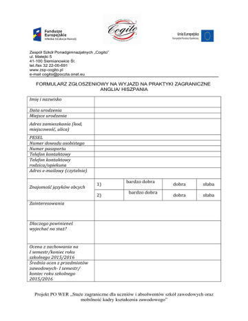 Zespół Szkół Ponadgimnazjalnych „Cogito” ul. Matejki 5 41-100 Siemianowice Śl. tel./fax 32 22-00-691 www.zsp-cogito.pl e-mail [email protected] FORMULARZ ZGŁOSZENIOWY NA WYJAZD NA PRAKTYKI ZAGRANICZNE ANGLIA/ HISZPANIA Imię i nazwisko Data urodzenia Miejsce urodzenia Adres zamieszkania (kod, miejscowość, ulica) PESEL Numer dowodu osobistego Numer paszportu Telefon kontaktowy Telefon kontaktowy rodzica/opiekuna Adres e-mailowy (czytelnie) Znajomość języków obcych 1) 2) bardzo dobra bardzo dobra dobra słaba dobra słaba Zainteresowania Dlaczego powinieneś wyjechać na staż? Ocena z zachowania na I semestr/koniec roku szkolnego 2015/2016 Średnia ocen z przedmiotów zawodowych- I semestr/ koniec roku szkolnego 2015/2016 Projekt PO WER „Staże zagraniczne dla uczniów i absolwentów szkół zawodowych oraz mobilność kadry kształcenia zawodowego”