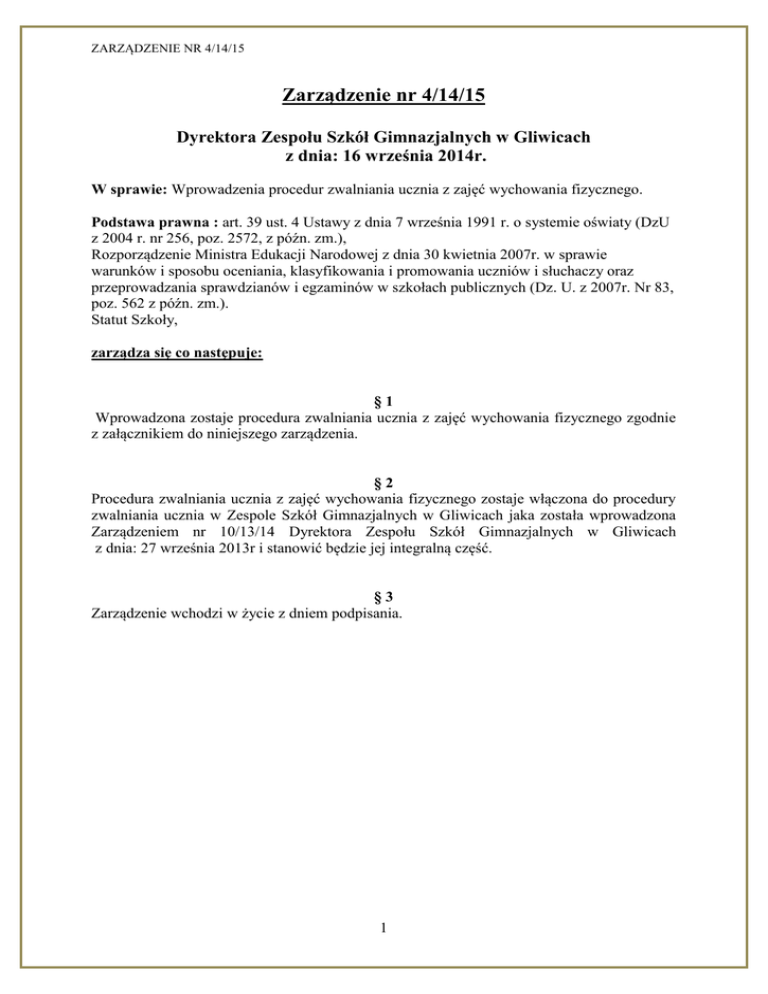 ZARZĄDZENIE NR 4/14/15 Zarządzenie nr 4/14/15 Dyrektora Zespołu Szkół Gimnazjalnych w Gliwicach z dnia: 16 września 2014r. W sprawie: Wprowadzenia procedur zwalniania ucznia z zajęć wychowania fizycznego. Podstawa prawna : art. 39 ust. 4 Ustawy z dnia 7 września 1991 r. o systemie oświaty (DzU z 2004 r. nr 256, poz. 2572, z późn. zm.), Rozporządzenie Ministra Edukacji Narodowej z dnia 30 kwietnia 2007r. w sprawie warunków i sposobu oceniania, klasyfikowania i promowania uczniów i słuchaczy oraz przeprowadzania sprawdzianów i egzaminów w szkołach publicznych (Dz. U. z 2007r. Nr 83, poz. 562 z późn. zm.). Statut Szkoły, zarządza się co następuje: §1 Wprowadzona zostaje procedura zwalniania ucznia z zajęć wychowania fizycznego zgodnie z załącznikiem do niniejszego zarządzenia. §2 Procedura zwalniania ucznia z zajęć wychowania fizycznego zostaje włączona do procedury zwalniania ucznia w Zespole Szkół Gimnazjalnych w Gliwicach jaka została wprowadzona Zarządzeniem nr 10/13/14 Dyrektora Zespołu Szkół Gimnazjalnych w Gliwicach z dnia: 27 września 2013r i stanowić będzie jej integralną część. §3 Zarządzenie wchodzi w życie z dniem podpisania. 1 ZARZĄDZENIE NR 4/14/15 1. Rodzice (opiekunowie prawni) w wyjątkowych sytuacjach mogą zwolnić ucznia z uczestnictwa w zajęciach wychowania fizycznego poprzez dokonanie umotywowanego wpisu w zeszycie zwolnień. Łączna długość tego typu zwolnień nie może przekraczać trzech tygodni w semestrze, a jednorazowo nie mogą obejmować okresu dłuższego niż 7 dni. 2. W szczególnych (uzasadnionych) przypadkach nauczyciel prowadzący zajęcia wychowania fizycznego zwalnia ucznia zgłaszającego dolegliwości zdrowotne z czynnego uczestnictwa w zajęciach i odnotowuje ten fakt w swoim dzienniku zajęć. 3. Niedyspozycja dziewcząt nie zwalnia ich z udziału w lekcjach są zobligowane przebierać się w strój sportowy. 4. Dłuższe niż tygodniowe zwolnienie ucznia z zajęć wychowania fizycznego musi być poparte odpowiednim zaświadczeniem wystawionym przez lekarza. na okres nie dłuższy niż 1 miesiąc zwolnienie należy przekazać nauczycielowi wychowania fizycznego, który obowiązany jest przechowywać je do końca danego roku szkolnego. Na okres dłuższy niż jeden miesiąc dyrektor szkoły zwalnia ucznia z zajęć wychowania fizycznego na podstawie opinii lekarza na czas określony w tej opinii. Pisemne podanie o zwolnienie z zajęć wychowania fizycznego wraz z załączoną do niego opinią lekarską składa rodzic/prawny opiekun do dyrektora szkoły w sekretariacie uczniowskim. W oparciu o przedłożoną opinie lekarza dyrektor szkoły wydaje decyzję o zwolnieniu ucznia z zajęć wychowania fizycznego licząc od dnia złożenia podania w szkole, a nie od dnia wystawienia opinii przez lekarza. Zważywszy na powyższe rodzic powinien podanie złożyć niezwłocznie po uzyskaniu ww. opinii. O decyzji dyrektora zostaje poinformowany rodzic/prawny opiekun ,nauczyciel wychowania fizycznego oraz wychowawca. Uczeń zwolniony z zajęć wychowania fizycznego ma obowiązek być obecny na tych zajęciach. W szczególnych przypadkach, gdy zajęcia te są umieszczone w planie lekcji na pierwszej lub ostatniej godzinie, uczeń może być na nich nieobecny tylko wtedy, gdy rodzice/prawni opiekunowie złożą wychowawcy pisemne oświadczenie o odpowiedzialności za dziecko w tym czasie . Wówczas uczeń zwolniony przez rodziców/prawnych opiekunów z obowiązku przebywania na zajęciach wychowania fizycznego ma zaznaczaną w dzienniku lekcyjnym nieobecności usprawiedliwioną. Jeżeli uczeń został zwolniony z zajęć wychowania fizycznego w trakcie roku szkolnego, a jego nieobecności na zajęciach wychowania fizycznego nie przekroczyły połowy wymaganego czasu i są podstawy do wystawienia pozytywnej oceny, to uczeń podlega klasyfikacji z wychowania fizycznego. Jeżeli okres zwolnienia ucznia z zajęć wychowania fizycznego uniemożliwia ustalenie semestralnej lub rocznej oceny klasyfikacyjnej w dokumentacji przebiegu nauczania wpisuje się "zwolniony" lub "zwolniona". Zawarte w opinii lekarskiej ewentualne ograniczenia, skutkujące zwolnieniem ucznia z wykonywania wybranej grupy ćwiczeń, nie są podstawą do zwolnienia ucznia z zajęć wychowania fizycznego. Taką opinię rodzic składa nauczycielowi wychowania fizycznego poprzez sekretariat uczniowski. Nauczyciel wówczas jest zobowiązany uwzględnić zalecenia lekarza w pracy z uczniem. 2