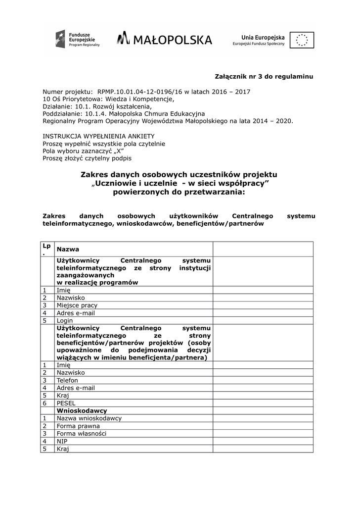 Załącznik nr 3 do regulaminu Numer projektu: RPMP.10.01.04-12-0196/16 w latach 2016 – 2017 10 Oś Priorytetowa: Wiedza i Kompetencje, Działanie: 10.1. Rozwój kształcenia, Poddziałanie: 10.1.4. Małopolska Chmura Edukacyjna Regionalny Program Operacyjny Województwa Małopolskiego na lata 2014 – 2020. INSTRUKCJA WYPEŁNIENIA ANKIETY Proszę wypełnić wszystkie pola czytelnie Pola wyboru zaznaczyć „X” Proszę złożyć czytelny podpis Zakres danych osobowych uczestników projektu „Uczniowie i uczelnie - w sieci współpracy” powierzonych do przetwarzania: Zakres danych osobowych użytkowników Centralnego teleinformatycznego, wnioskodawców, beneficjentów/partnerów Lp . 1 2 3 4 5 1 2 3 4 5 6 1 2 3 4 5 Nazwa Użytkownicy Centralnego systemu teleinformatycznego ze strony instytucji zaangażowanych w realizację programów Imię Nazwisko Miejsce pracy Adres e-mail Login Użytkownicy Centralnego systemu teleinformatycznego ze strony beneficjentów/partnerów projektów (osoby upoważnione do podejmowania decyzji wiążących w imieniu beneficjenta/partnera) Imię Nazwisko Telefon Adres e-mail Kraj PESEL Wnioskodawcy Nazwa wnioskodawcy Forma prawna Forma własności NIP Kraj systemu 6 1 2 3 4 5 6 7 8 Adres: Ulica Nr budynku Nr lokalu Kod pocztowy Miejscowość Telefon Fax Adres e-mail Beneficjenci/Partnerzy Nazwa beneficjenta/partnera Forma prawna beneficjenta/partnera Forma własności NIP REGON Adres: Ulica Nr budynku Nr lokalu Kod pocztowy Miejscowość Telefon Fax Adres e-mail Kraj Numer rachunku beneficjenta/odbiorcy Dane uczestników instytucjonalnych jednoosobową działalność gospodarczą) Lp . 1 2 3 4 5 6 7 8 9 10 11 12 13 14 15 16 17 18 19 20 21 (osób Nazwa Kraj Nazwa instytucji NIP Typ instytucji Województwo Powiat Gmina Miejscowość Ulica Nr budynku Nr lokalu Kod pocztowy Obszar wg stopnia urbanizacji (DEGURBA) Telefon kontaktowy Adres e-mail Data rozpoczęcia udziału w projekcie Data zakończenia udziału w projekcie Czy wsparciem zostali objęci pracownicy instytucji Rodzaj przyznanego wsparcia Data rozpoczęcia udziału we wsparciu Data zakończenia udziału we wsparciu fizycznych prowadzących Dane uczestników indywidualnych Lp . 1 2 3 4 5 6 7 8 9 10 11 12 13 14 15 16 17 18 19 20 21 22 23 24 25 26 27 28 29 30 31 32 33 34 35 36 37 38 39 40 Nazwa Kraj Rodzaj uczestnika Nazwa instytucji Imię Nazwisko PESEL Płeć Wiek w chwili przystępowania do projektu Wykształcenie Województwo Powiat Gmina Miejscowość Ulica Nr budynku Nr lokalu Kod pocztowy Obszar wg stopnia urbanizacji (DEGURBA) Telefon kontaktowy Adres e-mail Data rozpoczęcia udziału w projekcie Data zakończenia udziału w projekcie Status osoby na rynku pracy w chwili przystąpienia do projektu Wykonywany zawód Zatrudniony w (miejsce zatrudnienia) Sytuacja osoby w momencie zakończenia udziału w projekcie Inne rezultaty dotyczące osób młodych (dotyczy IZM Inicjatywy na rzecz Zatrudnienia Młodych) Zakończenie udziału osoby w projekcie zgodnie z zaplanowaną dla niej ścieżką uczestnictwa Rodzaj przyznanego wsparcia Data rozpoczęcia udziału we wsparciu Data zakończenia udziału we wsparciu Data założenia działalności gospodarczej Kwota przyznanych środków na założenie działalności gospodarczej PKD założonej działalności gospodarczej Osoba należąca do mniejszości narodowej lub etnicznej, migrant, osoba obcego pochodzenia Osoba bezdomna lub dotknięta wykluczeniem z dostępu do mieszkań Osoba z niepełno sprawnościami Osoba przebywająca w gospodarstwie domowym bez osób pracujących W tym: w gospodarstwie domowym z dziećmi pozostającymi na utrzymaniu Osoba żyjąca w gospodarstwie składającym się z jednej osoby dorosłej i dzieci pozostających na utrzymaniu 41 Osoba w innej niekorzystnej sytuacji społecznej (innej niż wymienione powyżej) Dane dotyczące personelu projektu Lp . 1 2 3 4 5 6 7 8 Nazwa Imię Nazwisko Kraj PESEL Forma zaangażowania Okres zaangażowania w projekcie Wymiar czasu pracy Stanowisko Wykonawcy realizujący umowy o zamówienia publiczne, których dane przetwarzane będą w związku z badaniem kwalifikowalności środków w projekcie (osoby fizyczne prowadzące działalność gospodarczą) Lp . 1 2 3 Nazwa Nazwa wykonawcy Kraj NIP wykonawcy