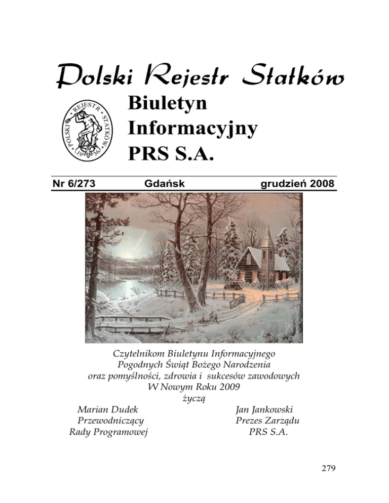 R S EJE T R PO LSKI T KÓ W STA 19 36 Nr 6/273 Gdańsk grudzień 2008 Czytelnikom Biuletynu Informacyjnego Pogodnych Świąt Bożego Narodzenia oraz pomyślności, zdrowia i sukcesów zawodowych W Nowym Roku 2009 życzą Marian Dudek Jan Jankowski Przewodniczący Prezes Zarządu Rady Programowej PRS S.A. 279 Odbudowa jachtu "Generał Zaruski" Od wielu lat Polski Rejestr Statków prowadzi nieodpłatnie nadzór klasyfikacyjny nad sławną fregatą Dar Pomorza. "Biała fregata", od 70 lat nieodłącznie związaną z Gdynią, została zbudowana w roku 1909. Od 1930 r. była statkiem szkolnym Państwowej Szkoły Morskiej. Dwukrotnie wygrała Operation Sail. W roku 1980 zdobyła Puchar "Cutty Sark Trophy". Czołowe pozycje w regatach zajmowała w latach 1974, 1976 i 1978. Obecnie żaglowiec zacumowany przy Nabrzeżu Pomorskim w porcie gdyńskim służy jako statek-muzeum. W grudniu Polski Rejestr Statków objął swoim mecenatem nadzór nad kolejnym historycznym żaglowcem. Generał Zaruski to 30 osobowy, drewniany 25 metrowy kecz gaflowy, zbudowany w 1939 r. Miał być pierwszym z serii 10 bliźniaczych jednostek, na pokładach których Liga Morska i Kolonialna zamierzała realizować program masowego wychowania morskiego polskiej młodzieży. W latach czterdziestych, po likwidacji Ligi Morskiej jacht został przejęty przez LPŻ, późniejszy LOK. W czasach stalinowskich nosił nazwę Młoda Gwardia. Kecz został zakupiony przez miasto Gdańsk w grudniu br. Po kapitalnym remoncie jednostka zostanie oddana do użytku zarówno jako promująca miasto jak i jacht do szkolenia młodzieży. 11 grudnia, w siedzibie MOSiR w Gdańsku, kapitan Jan Ludwig, wieloletni kierownik Inspektoratu Jachtów i Łodzi Polskiego Rejestru Statków, wręczył dyrektorowi Leszkowi Paszkowskiemu pismo od Zarządu firmy. Informuje ono o decyzji objęcia odbudowy jachtu Generał Zaruski bezpłatnym nadzorem klasyfikacyjnym. PRS zdecydował się na nadzorowanie prac nad rewitalizacją Generała Zaruskiego, zarówno w zakresie uzgadniania i zatwierdzania dokumentacji technicznej, jak i bezpośredniego nadzoru w stoczni. Po przywróceniu klasy jacht ten będzie najdłużej klasyfikowanym przez PRS tego typu statkiem. 280 Sympozjum "Ocena ryzyka i niezawodności infrastruktury technicznej" Sympozjum na temat oceny ryzyka i niezawodności infrastruktury technicznej, które zostało zorganizowane przez Polski Rejestr Statków S.A. i odbyło się w piątek 21 listopada br. w sali konferencyjnej Centrali PRS, wzbudziło znaczne zainteresowanie. W sympozjum wzięło udział liczne grono przedstawicieli polskiego przemysłu. Na coraz częstsze decyzje o stosowaniu w praktyce metod oceny ryzyka i niezawodności wpływ ma również postęp w tej dziedzinie oraz znaczna unifikacja metod. Statystyki wskazują, że zwykle tylko ok. 20% zaistniałych przypadków niezdatności elementu obiektu do pełnienia jego funkcji wynika z procesu normalnego zużycia, a pozostałe przypadki niezdatności wynikają z błędów montażowych i eksploatacyjnych. Większość przypadków niezdatności należy do kategorii niezdatności losowych. Jest to jeden z argumentów przemawiających za celowością stosowania metod probabilistycznych podczas projektowania i eksploatacji infrastruktury przemysłowej. Metody analizy niezawodności i ryzyka są narzędziami, które mogą pomóc w wyborze środków zaradczych i podejmowaniu decyzji. Program spotkania obejmował 4 referaty 281 oraz dyskusję. Wystąpienia prelegentów przybliżyły tematykę oceny ryzyka i niezawodności infrastruktury technicznej. Panowie Piotr Jędrysik i Maciej Ziółkowski z PRS przedstawili referat pt. "Ocena ryzyka i niezawodności obiektu przemysłowego". Kolejną prezentację, przygotowaną przez Jamesa Phippsa z ABS Consulting, pt. "The Application of 'Bow-Tie' Techniques in Understanding and Managing the Risks of Major Hazards (Zastosowanie metody 'Bow-Tie' do rozpoznania i kontrolowania ryzyka w przypadkach poważnych zagrożeń) przedstawił Benjamin Matellini z ABS. Następnie referat pt. "Metoda oceny ryzyka projektów inwestycyjnych" wygłosił Jacek Winiarski z Uniwersytetu Gdańskiego. Referat zamykający pt. "Ocena bezpieczeństwa konstrukcji statku przy pomocy modelu ryzyka" przedstawił Prezes Zarządu PRS S.A. Jan Jankowski. Sympozjum stworzyło możliwość poszerzenia wiedzy na temat metod oceny ryzyka i niezawodności infrastruktury technicznej, dało też okazję do wymiany opinii i doświadczeń związanych ze stosowaniem tych metod w praktyce. Wyróżnienie za dbałość o bezpieczeństwo żeglugi Zapewnienie bezpiecznej żeglugi i ochrony środowiska morskiego wymaga współpracy kilku stron: administracji morskiej, towarzystwa klasyfikacyjnego, ubezpieczyciela, armatora i załogi statku. 12 grudnia 2008 w szczecińskim hotelu Novotel odbyło się spotkanie przedstawicieli polskiego środowiska żeglugowego. Jest to pierwsze spotkanie zorganizowane przez Polski Rejestr Statków w celu integracji środowiska, dla wypracowania coraz lepszej współpracy i ciągłego podnoszenia poziomu bezpieczeństwa na morzu. Specjalną rolę w tych wspólnych działaniach odgrywa armator oraz załoga statku, która z problemem bezpieczeństwa styka się bezpośrednio. Spotkanie stało się okazją do wyróżnienia polskich armatorów za dbałość o bezpieczeństwo żeglugi i ochronę środowiska morskiego. 282 Nagrodę Neptuna 2008 Polski Rejestr Statków przyznał Polskiej Żegludze Morskiej, także w uznaniu doskonałej, długoletniej wzajemnej współpracy. Najważniejszą linią styku i współpracy między PRS i armatorem jest statek, gdzie podczas przeglądu spotykają się inspektor PRS, załoga statku i przedstawiciel armatora. Podejmowane są tam decyzje dotyczące naprawy oraz konserwacji statku, tak aby spełnione były standardy bezpieczeństwa. Trudniejsze do rozwiązania problemy pojawiają się w przypadku awarii statku, kolizji czy wejścia na mieliznę. 