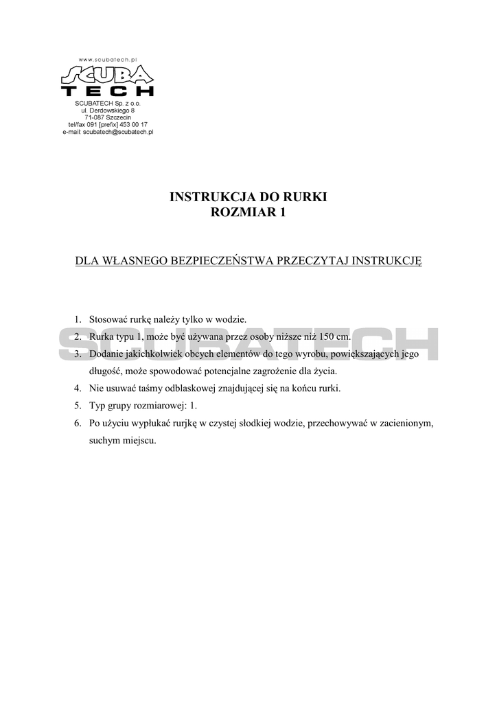 INSTRUKCJA DO RURKI ROZMIAR 1 DLA WŁASNEGO BEZPIECZEŃSTWA PRZECZYTAJ INSTRUKCJĘ 1. Stosować rurkę należy tylko w wodzie. 2. Rurka typu 1, może być używana przez osoby niższe niż 150 cm. 3. Dodanie jakichkolwiek obcych elementów do tego wyrobu, powiększających jego długość, może spowodować potencjalne zagrożenie dla życia. 4. Nie usuwać taśmy odblaskowej znajdującej się na końcu rurki. 5. Typ grupy rozmiarowej: 1. 6. Po użyciu wypłukać rurjkę w czystej słodkiej wodzie, przechowywać w zacienionym, suchym miejscu.
