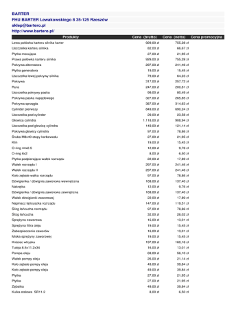 BARTER FHU BARTER Lewakowskiego 8 35-125 Rzeszów [email protected] http://www.bartero.pl/ Produkty Lewa połówka karteru silnika karter Uszczelka karteru silnika Płytka mocująca Cena (brutto) Cena (netto) 929,00 zł 755,28 zł 82,00 zł 66,67 zł 27,00 zł 21,95 zł Prawa połówka karteru silnika 929,00 zł 755,28 zł Pokrywa alternatora 297,00 zł 241,46 zł Płytka generatora 19,00 zł 15,45 zł Uszczelka lewej pokrywy silnika 79,00 zł 64,23 zł Pokrywa 317,00 zł 257,72 zł Rura 247,00 zł 200,81 zł 99,00 zł 80,49 zł Pokrywa paska napędowego 327,00 zł 265,85 zł Pokrywa sprzęgła 387,00 zł 314,63 zł Cylinder pierwszy 849,00 zł 690,24 zł Uszczelka pokrywy paska Uszczelka pod cylinder 29,00 zł 23,58 zł 1.118,00 zł 908,94 zł 149,00 zł 121,14 zł Pokrywa głowicy cylindra 97,00 zł 78,86 zł Śruba M8x40 stopy korbowodu 27,00 zł 21,95 zł Klin 19,00 zł 15,45 zł O-ring 44x2.5 12,00 zł 9,76 zł 8,00 zł 6,50 zł Głowica cylindra Uszczelka pod głowicę cylindra O-ring 6x2 Płytka podpierająca wałek rozrządu 22,00 zł 17,89 zł Wałek rozrządu I 297,00 zł 241,46 zł Wałek rozrządu II 297,00 zł 241,46 zł Koło zębate wałka rozrządu Dźwigienka / dźwignia zaworowa wewnętrzna Nakrętka Dźwigienka / dźwignia zaworowa zewnętrzna 97,00 zł 78,86 zł 169,00 zł 137,40 zł 12,00 zł 9,76 zł 169,00 zł 137,40 zł Wałek dźwigienki zaworowej 22,00 zł 17,89 zł Napinacz łąńcuszka rozrządu 147,00 zł 119,51 zł Ślizg łańcucha rozrządu 97,00 zł 78,86 zł Ślizg łańcucha 32,00 zł 26,02 zł Sprężyna zaworowa 16,00 zł 13,01 zł Sprężyna filtra oleju 19,00 zł 15,45 zł Zabezpieczenie zaworów 16,00 zł 13,01 zł Miska sprężyny zaworowej 19,00 zł 15,45 zł 197,00 zł 160,16 zł Tuleja 8.5x11.2x34 16,00 zł 13,01 zł Pompa oleju 69,00 zł 56,10 zł Wałek pompy oleju 26,00 zł 21,14 zł Koło zębate pompy oleju 49,00 zł 39,84 zł Koło zębate pompy oleju 49,00 zł 39,84 zł Płytka 27,00 zł 21,95 zł Płytka 27,00 zł 21,95 zł Zębatka 49,00 zł 39,84 zł 8,00 zł 6,50 zł Króciec wtrysku Kulka stalowa SR11.2 Cena promocyjna Przepustnica 1.117,00 zł 908,13 zł Mocowanie wtrysku 49,00 zł 39,84 zł Przewód 42,00 zł 34,15 zł Przewód powietrzny 67,00 zł 54,47 zł Przewód cieczy 67,00 zł 54,47 zł Pokrywa termostatu 39,00 zł 31,71 zł Łącznik przewodu cieczy 39,00 zł 31,71 zł Koło zębate pompy oleju 49,00 zł 39,84 zł Pompa wody 399,00 zł 324,39 zł Wałek 10x171 47,00 zł 38,21 zł Sworzeń 4x21 pompy wody 27,00 zł 21,95 zł Koło zębate pompy wody 39,00 zł 31,71 zł Wirnik pompy wody 87,00 zł 70,73 zł 247,00 zł 200,81 zł Wałek 12x56 39,00 zł 31,71 zł Mocowanie osłony sprzęgła 87,00 zł 70,73 zł Łożyskowanie wału napędowego 77,00 zł 62,60 zł Płytka łożyskująca 64,00 zł 52,03 zł Tuleja 39,00 zł 31,71 zł 237,00 zł 192,68 zł 22,00 zł 17,89 zł Wałek główny przekładni 287,00 zł 233,33 zł Koło zębate biegu h 267,00 zł 217,07 zł Koło zębate biegu l 267,00 zł 217,07 zł Wałek 347,00 zł 282,11 zł Koło zębate biegu h 517,00 zł 420,33 zł Koło zębate biegu l 297,00 zł 241,46 zł Koło zębate biegu r 297,00 zł 241,46 zł Zabezpieczenie seger 27x32x2 12,00 zł 9,76 zł Podkładka 17.3x34x1.5 12,00 zł 9,76 zł Podkładka 25.4x33x1 12,00 zł 9,76 zł Wałek biegu jałowego 62,00 zł 50,41 zł 127,00 zł 103,25 zł Uszczelka skrzyni biegów 46,00 zł 37,40 zł Przewód łączący i 32,00 zł 26,02 zł Zabezpieczenie blacha 37,00 zł 30,08 zł Obudowa wyjścia wału 337,00 zł 273,98 zł 27,00 zł 21,95 zł Wodzik pazur zmiany biegów 107,00 zł 86,99 zł Wodzik pazur zmiany biegów Pokrywa pompy wody Przekładnia kątowa Sprężyna Koło zębate biegu jałowego Sworzeń 2x18 107,00 zł 86,99 zł Wałek 12x112.5 32,00 zł 26,02 zł Sprężyna dociskająca wodzik 12,00 zł 9,76 zł Sprężyna dociskająca wodzik 12,00 zł 9,76 zł Tuleja wodzika zamiany biegów 39,00 zł 31,71 zł Bębenek zmiany biegów beczka 197,00 zł 160,16 zł 8,00 zł 6,50 zł Sprężyna 24,00 zł 19,51 zł Pokrywa wodzika zmiany biegów 49,00 zł 39,84 zł Uszczelka pokrywy wodzika 26,00 zł 21,14 zł Zębatka zmiany biegów 87,00 zł 70,73 zł Zębatka zmiany biegów 87,00 zł 70,73 zł Kulka stalowa SR9.5 Tuleja 7x15x6.5 wtrysk 16,00 zł 13,01 zł Pasek napędowy 946x31.2x26 14.5 499,00 zł 405,69 zł Wałek zębaty 197,00 zł 160,16 zł Tuleja łącząca 117,00 zł 95,12 zł Łożysko 1010 19,00 zł 15,45 zł Łożysko 6005 P6 49,00 zł 39,84 zł Łożysko 6200RS 36,00 zł 29,27 zł Łożysko 6204 39,00 zł 31,71 zł Łożysko 6206 77,00 zł 62,60 zł Łożysko 6305 C3 97,00 zł 78,86 zł Łożysko 6305 297,00 zł 241,46 zł Łożysko 6403 297,00 zł 241,46 zł Łożysko 6906 87,00 zł 70,73 zł Łożysko igiełkowe 15x27x16 36,00 zł 29,27 zł Koło magnesowe 497,00 zł 404,07 zł Koło zębate pośrednie 117,00 zł 95,12 zł Koło zębate 167,00 zł 135,77 zł Wałek 10x50 22,00 zł 17,89 zł 297,00 zł 241,46 zł Czujnik zmiany biegów 69,00 zł 56,10 zł Czujnik biegu wstecznego 59,00 zł 47,97 zł Śruba M6x12 4,00 zł 3,25 zł Śruba M6x22 3,00 zł 2,44 zł Śruba M6x30 3,00 zł 2,44 zł Śruba M10x30x1.25 8,00 zł 6,50 zł Śruba M16x35 22,00 zł 17,89 zł Śruba M12x15x1.25 27,00 zł 21,95 zł Śruba M6x35 3,00 zł 2,44 zł Śruba M6x80 3,00 zł 2,44 zł Śruba M6x85 3,00 zł 2,44 zł Koło zębate bendix Śruba M8x25 6,00 zł 4,88 zł Szpilka M10x1.25-145 śruba głowicy 27,00 zł 21,95 zł Szpilka M10x1.25-175 śruba głowicy 27,00 zł 21,95 zł Śruba M14x20x1.5 27,00 zł 21,95 zł Opaska obejma 50-70 15,00 zł 12,20 zł Przewód olejowy 69,00 zł 56,10 zł Opaska obejma 12,00 zł 9,76 zł Podkładka 10.3x17x1 8,00 zł 6,50 zł Podkładka 17.2x30x3 12,00 zł 9,76 zł Podkładka 10x20x2 8,00 zł 6,50 zł 12,00 zł 9,76 zł 8,00 zł 6,50 zł Podkładka 12.5x37x4.5 12,00 zł 9,76 zł Podkładka 12.5x39x0.5 12,00 zł 9,76 zł Podkładka 20.5x30x1 Podkładka 10.3x40x3 Podkładka 10x32x5 12,00 zł 9,76 z