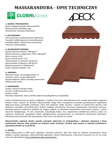 MASSARANDUBA - OPIS TECHNICZNY 1. NAZWA I POCHODZENIE: Nazwa międzynarodowa: Massaranduba Nazwa łacińska: Manilkara spp Pochodzenie: Ameryka Południowa 2. OPIS DREWNA: Biel: jasnoszary, niezbyt wyraźnie oddzielony Twardziel: żółtobrązowa do ciemnobrązowej Przebieg włókien: układ prosty lub pasiasty Tekstura: średnio gładka 3. WŁAŚCIWOŚCI DREWNA: Gęstość (drewno świeże): 1300 kg/m3 Gęstość (drewno o wilgotności 12%): 1100 kg/m3 Skurcz styczny: 9,4% Skurcz promieniowy: 7,1% Wytrzymałość na ściskanie: 90 N/mm2 Wytrzymałość na zginanie: 190 N/mm2 Moduł sprężystości: 19600 N/mm2 Punkt nasycenia włókien: 27% 4. OBRÓBKA: Piłowanie: łatwe, ale wymaga dużych sił Suszenie: wolne, ryzyko odkształceń Łączenie/zbijanie: dobre, wymaga nawiercania Wykończanie: dobre 5. ODPORNOŚĆ: Grzyby: trwałe do bardzo trwałe Termity: trwałe do bardzo trwałe Owady: trwałe Naturalna odporność: klasa 1 bardzo odporne (według Normy Europejskiej) Cechą charakterystyczną są otwory szpilkowe o średnicy 0,5-1,5mm powodowane przez owady penetrujące wyłącznie drewno drzew żywych. W drewnie Massaranduba mogą także występować przewody gumożywiczne wypełnione półprzezroczystą, jasnożółtą wydzieliną, która pod wpływem ciepła wycieka i zasycha na powierzchni drewna. Pod wpływem czynników atmosferycznych drewno podlega naturalnemu procesowi patynowania wierzchniej warstwy. Powstaje wówczas srebrzysta powłoka nie mająca wpływu na obniżenie parametrów technicznych drewna i proces starzenia biologicznego. W celu utrzymania naturalnego koloru oraz zapewnieniu dodatkowej ochrony zaleca się regularne stosowanie specjalnych olejów pielęgnacyjnych przeznaczonych na zewnętrzne konstrukcje drewniane. Renowacja tarasu powinna być wykonywana dwa razy w roku (przed i po zimie). Massaranduba wykazuje bardzo wysoką naturalną odporność na biodegradację i obejmuje najwyższą 5 klasę użytkowania (drewno stale narażone na działanie wody morskiej). Trwałość tego drewna w odkrytej architekturze ogrodowej określa się na 30-50 lat. 6. UWAGI: Wady dopuszczalne w 10% partii: pęknięcia, kieszenie żywiczne, sęki, biel, ślady po obróbce mechanicznej. Skręt włókien, czołowe pęknięcia, powierzchniowe pęknięcia, różnice kolorystyczne, nieznaczna krzywizna (1,5 cm na 1mb) oraz inne odkształcenia nie są traktowane jako wada drewna. Deska tarasowa Massaranduba jest produktem w 100% naturalnym i higroskopijnym. Drewno pobiera wodę z otoczenia i rozszerza się podczas deszczowej pogody oraz oddaje wodę i kurczy się w czasie gorących letnich dni. Rzeczywista szerokość i grubość deski może różnić się do około 6% od wymiarów z faktury. Drewno stosowane na zewnątrz narażone jest na skrajne warunki atmosferyczne w wyniku czego może patynować, odkształcać się, pękać oraz zmieniać swoje wymiary - są to naturalne procesy drewna i nie mogą podlegać reklamacji. Drewno nie jest materiałem jednolitym i każda deska posiada indywidualne cechy, w zależności od warunków, w jakich dane drzewo rosło. Nawet w drewnie pochodzącym z tego samego źródła mogą występować różne usłojenia oraz kolorystyka. 7. PRZECHOWYWANIE DESEK I PRZYGOTOWANIE DO MONTAŻU Deski powinny być przechowywane w oryginalnych opakowaniach a jeżeli nie jest to możliwe, należy je ścisnąć pasami i/lub równomiernie obciążyć. Nie wolno desek przechowywać luzem. Może to skutkować ich wypaczeniem i wykręceniem. Montaż desek tarasowych należy przeprowadzać zgodnie ze sztuką budowlaną. Materiał należy sprawdzić przed montażem. Wszelkie uszkodzenia i niezgodności należy zgłosić Sprzedawcy. Rozpoczęcie prac oznacza akceptację stanu technicznego materiału. Wskazane jest aby montaż został przeprowadzony przez specjalistyczną ekipę monterską. 8. MONTAŻ Taras można montować na: - wylewce betonowej, - na konstrukcji stalowej, drewnianej lub aluminiowej - na wspornikach regulowanych z tworzyw sztucznych. Podłoże musi być płaskie i stabilne z zachowanym spadkiem 1cm na 1m w kierunku przeciwnym do ścian budynku. Takie ułożenie deski zapewnia optymalny odpływ wody z tarasu – woda nie zalega ani na deskach ani pod nimi. Legarów nie można zagłębiać w betonie. Należy zachować identyczną odległość między legarami. Desek nie wolno mocować ani kleić bezpośrednio do powierzchni. Pod deskami i wokół desek należy zostawić szczeliny wentylacyjne. Podłoże należy wykonać z ogólnie przyjętymi prze-pisami budowlanymi i sztuką budowlaną Deskę tarasową z drewna egzotycznego należy montować na legarach o gęstości zbliżonej do gęstości deski. Legary konstrukcyjne muszą być zamocowane do podłoża w sposób stabilny. Rozstaw legarów jest uzależniony od grubości deski. Przy desce o przekroju 21x145 rozstaw osi legarów powinien wynosić 40-45cm natomiast przy desce 25x145 rozstaw powinien wynosić 45-50cm. Należy pamiętać o naturalnym procesie zmiany objętości drewna narażonego na warunki atmosferyczne. Dylatacje pomiędzy deskami powinna wynosić (w zależności od wilgotności przez ostatnie 14 dni) 4-7mm. Jeśli przez kilkanaście dni przed montażem panowała sucha pogoda należy zachować mniejsze dylatacje. Jeśli przez kilkanaście dni przed montażem panowała wilgotna pogoda. Należy zachować mniejsze dylatacje. Na każdym połączeniu deski i legara należy użyć dwóch wkrętów o długości przynajmniej dwukrotnie większej od grubości deski. Przed przykręceniem deski należy wywiercić otwory prowadzące wkręt. 9. OCHRONA I PIELĘGNACJA Stała pielęgnacja polega na usuwaniu zanieczyszczeń przy użyciu delikatnej szczotki. W sezonie zimowym należy na bieżąco usuwać śnieg żeby nie dopuszczając do powstania warstwy lodu. Pod wpływem czynników atmosferycznych drewniane deski tarasowe podlegają naturalnemu procesowi patynowania wierzchniej warstwy. Powstaje wówcza