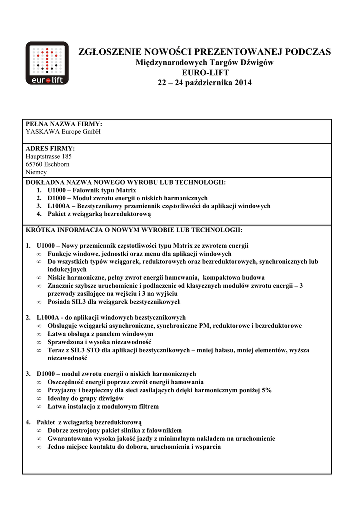 ZGŁOSZENIE NOWOŚCI PREZENTOWANEJ PODCZAS Międzynarodowych Targów Dźwigów EURO-LIFT 22 – 24 października 2014 PEŁNA NAZWA FIRMY: YASKAWA Europe GmbH ADRES FIRMY: Hauptstrasse 185 65760 Eschborn Niemcy DOKŁADNA NAZWA NOWEGO WYROBU LUB TECHNOLOGII: 1. U1000 – Falownik typu Matrix 2. D1000 – Moduł zwrotu energii o niskich harmonicznych 3. L1000A – Bezstycznikowy przemiennik częstotliwości do aplikacji windowych 4. Pakiet z wciągarką bezreduktorową KRÓTKA INFORMACJA O NOWYM WYROBIE LUB TECHNOLOGII: 1. U1000 – Nowy przemiennik częstotliwości typu Matrix ze zwrotem energii • Funkcje windowe, jednostki oraz menu dla aplikacji windowych • Do wszystkich typów wciągarek, reduktorowych oraz bezreduktorowych, synchronicznych lub indukcyjnych • Niskie harmoniczne, pełny zwrot energii hamowania, kompaktowa budowa • Znacznie szybsze uruchomienie i podłaczenie od klasycznych modułów zwrotu energii – 3 przewody zasilające na wejściu i 3 na wyjściu • Posiada SIL3 dla wciągarek bezstycznikowych 2. L1000A - do aplikacji windowych bezstycznikowych • Obsługuje wciągarki asynchroniczne, synchroniczne PM, reduktorowe i bezreduktorowe • Łatwa obsługa z panelem windowym • Sprawdzona i wysoka niezawodność • Teraz z SIL3 STO dla aplikacji bezstycznikowych – mniej hałasu, mniej elementów, wyższa niezawodność 3. D1000 – moduł zwrotu energii o niskich harmonicznych • Oszczędność energii poprzez zwrót energii hamowania • Przyjazny i bezpieczny dla sieci zasilających dzięki harmonicznym poniżej 5% • Idealny do grupy dźwigów • Łatwa instalacja z modułowym filtrem 4. Pakiet z wciągarką bezreduktorową • Dobrze zestrojony pakiet silnika z falownikiem • Gwarantowana wysoka jakość jazdy z minimalnym nakładem na uruchomienie • Jedno miejsce kontaktu do doboru, uruchomienia i wsparcia TRADE FAIRS NEWS presented during 3rd International Lifts Exhibition EURO-LIFT 22 – 24 October 2014 FULL COMPANY NAME: YASKAWA Europe GmbH COMPANY ADDRESS: Hauptstr. 185 D-65760 Eschborn Germany PRECISE NAME OF PRODUCT OR TECHNOLOGY: 1. U1000 – Matrix converter 2. D1000 – Low harmonic regenerative converter 3. L1000A – Elevator drive for contactor less operation 4. Gearless Motors Package BRIEF INFORMATION ABOUT PRODUCT OR TECHNOLOGY: 1. U1000 – New energy saving regenerative drive with Matrix Converter technology • Elevator functions, language and units • Any motor drive, MRL or geared, PM or induction motor • Low harmonics, fully regenerative and extremely compact • Much simpler and faster commissioning than traditional regen solution – 3 wires in, 3 wires out • With SIL3 for motor contactor less operation 2. L1000A - Lift drive for contactorless operation • Elevator drive for IM and PM, geared and gearless lifts • Easy setup in lift language • Proven, outstanding reliability • Now with SIL3 STO for contactor less operation – less noise, less parts, higher reliability • DCP3 Interface for easy serial connection with lift controller • Brake monitoring according to A3 • Can Lift & DCP4 coming soon 3. D1000 – low harmonics regenerative converter • Energy saving by feeding back braking energy • Power grid friendly operation by less than 5% harmonics • Ideal for elevator groups • Easy installation with one piece filter module 4. Gearless Motor Packages • Well fitted packages of Motor and Drive • Guaranteed ride quality with minimum setup effort • One contact for selection, procurement and support Matrix Converter D1000 L1000A Gearless Motor Packages
