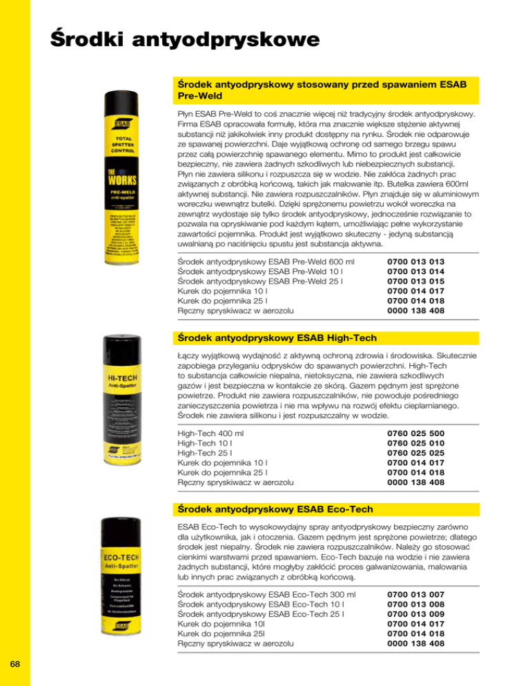 Środki antyodpryskowe Środek antyodpryskowy stosowany przed spawaniem ESAB Pre-Weld Płyn ESAB Pre-Weld to coś znacznie więcej niż tradycyjny środek antyodpryskowy. Firma ESAB opracowała formułę, która ma znacznie większe stężenie aktywnej substancji niż jakikolwiek inny produkt dostępny na rynku. Środek nie odparowuje ze spawanej powierzchni. Daje wyjątkową ochronę od samego brzegu spawu przez całą powierzchnię spawanego elementu. Mimo to produkt jest całkowicie bezpieczny, nie zawiera żadnych szkodliwych lub niebezpiecznych substancji. Płyn nie zawiera silikonu i rozpuszcza się w wodzie. Nie zakłóca żadnych prac związanych z obróbką końcową, takich jak malowanie itp. Butelka zawiera 600ml aktywnej substancji. Nie zawiera rozpuszczalników. Płyn znajduje się w aluminiowym woreczku wewnątrz butelki. Dzięki sprężonemu powietrzu wokół woreczka na zewnątrz wydostaje się tylko środek antyodpryskowy, jednocześnie rozwiązanie to pozwala na opryskiwanie pod każdym kątem, umożliwiając pełne wykorzystanie zawartości pojemnika. Produkt jest wyjątkowo skuteczny - jedyną substancją uwalnianą po naciśnięciu spustu jest substancja aktywna. Środek antyodpryskowy ESAB Pre-Weld 600 ml Środek antyodpryskowy ESAB Pre-Weld 10 l Środek antyodpryskowy ESAB Pre-Weld 25 l Kurek do pojemnika 10 l Kurek do pojemnika 25 l Ręczny spryskiwacz w aerozolu 0700 0700 0700 0700 0700 0000 013 013 013 014 014 138 013 014 015 017 018 408 Środek antyodpryskowy ESAB High-Tech Łączy wyjątkową wydajność z aktywną ochroną zdrowia i środowiska. Skutecznie zapobiega przyleganiu odprysków do spawanych powierzchni. High-Tech to substancja całkowicie niepalna, nietoksyczna, nie zawiera szkodliwych gazów i jest bezpieczna w kontakcie ze skórą. Gazem pędnym jest sprężone powietrze. Produkt nie zawiera rozpuszczalników, nie powoduje pośredniego zanieczyszczenia powietrza i nie ma wpływu na rozwój efektu cieplarnianego. Środek nie zawiera silikonu i jest rozpuszczalny w wodzie. High-Tech 400 ml High-Tech 10 l High-Tech 25 l Kurek do pojemnika 10 l Kurek do pojemnika 25 l Ręczny spryskiwacz w aerozolu 0760 0760 0760 0700 0700 0000 025 025 025 014 014 138 500 010 025 017 018 408 Środek antyodpryskowy ESAB Eco-Tech ESAB Eco-Tech to wysokowydajny spray antyodpryskowy bezpieczny zarówno dla użytkownika, jak i otoczenia. Gazem pędnym jest sprężone powietrze; dlatego środek jest niepalny. Środek nie zawiera rozpuszczalników. Należy go stosować cienkimi warstwami przed spawaniem. Eco-Tech bazuje na wodzie i nie zawiera żadnych substancji, które mogłyby zakłócić proces galwanizowania, malowania lub innych prac związanych z obróbką końcową. Środek antyodpryskowy ESAB Eco-Tech 300 ml Środek antyodpryskowy ESAB Eco-Tech 10 l Środek antyodpryskowy ESAB Eco-Tech 25 l Kurek do pojemnika 10l Kurek do pojemnika 25l Ręczny spryskiwacz w aerozolu 68 0700 0700 0700 0700 0700 0000 013 013 013 014 014 138 007 008 009 017 018 408