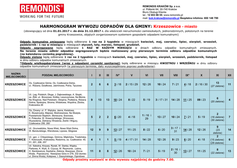 HARMONOGRAM WYWOZU ODPADÓW DLA GMINY: Krzeszowice - miasto
