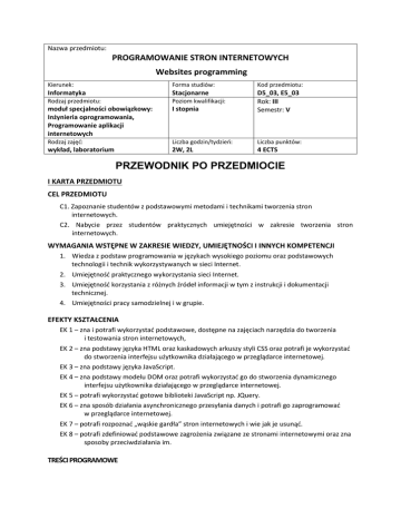 Nazwa przedmiotu: PROGRAMOWANIE STRON INTERNETOWYCH Websites programming Kierunek: Forma studiów: Kod przedmiotu: Informatyka Stacjonarne Rodzaj przedmiotu: Poziom kwalifikacji: moduł specjalności obowiązkowy: Inżynieria oprogramowania, Programowanie aplikacji internetowych I stopnia D5_03, E5_03 Rok: III Semestr: V Rodzaj zajęć: Liczba godzin/tydzień: Liczba punktów: wykład, laboratorium 2W, 2L 4 ECTS PRZEWODNIK PO PRZEDMIOCIE I KARTA PRZEDMIOTU CEL PRZEDMIOTU C1. Zapoznanie studentów z podstawowymi metodami i technikami tworzenia stron internetowych. C2. Nabycie przez studentów praktycznych umiejętności w zakresie tworzenia stron internetowych. WYMAGANIA WSTĘPNE W ZAKRESIE WIEDZY, UMIEJĘTNOŚCI I INNYCH KOMPETENCJI 1. Wiedza z podstaw programowania w językach wysokiego poziomu oraz podstawowych technologii i technik wykorzystywanych w sieci Internet. 2. Umiejętność praktycznego wykorzystania sieci Internet. 3. Umiejętność korzystania z różnych źródeł informacji w tym z instrukcji i dokumentacji technicznej. 4. Umiejętności pracy samodzielnej i w grupie. EFEKTY KSZTAŁCENIA EK 1 – zna i potrafi wykorzystać podstawowe, dostępne na zajęciach narzędzia do tworzenia i testowania stron internetowych, EK 2 – zna podstawy języka HTML oraz kaskadowych arkuszy styli CSS oraz potrafi je wykorzystać do stworzenia interfejsu użytkownika działającego w przeglądarce internetowej. EK 3 – zna podstawy języka JavaScript. EK 4 – zna podstawy modelu DOM oraz potrafi wykorzystać go do stworzenia dynamicznego interfejsu użytkownika działającego w przeglądarce internetowej. EK 5 – potrafi wykorzystać gotowe biblioteki JavaScript np. JQuery. EK 6 – zna sposób działania asynchronicznego przesyłania danych i potrafi go zaprogramować w przeglądarce internetowej. EK 7 – potrafi rozpoznać „wąskie gardła” stron internetowych i wie jak je usunąć. EK 8 – potrafi zdefiniować podstawowe zagrożenia związane ze stronami internetowymi oraz zna sposoby przeciwdziałania im. TREŚCI PROGRAMOWE Forma zajęć – WYKŁADY W 1 – Wprowadzenie do programowania stron internetowych. W 2 – Architektura klient-serwer oraz podstawowe technologie programistyczne w tworzeniu stron internetowych. W 3 – Wprowadzenie do języka HTML. W 4 – Kaskadowe arkusze styli CSS cz. 1. W 5 – Kaskadowe arkusze styli CSS cz. 2. W 6 – Podstawy programowania w języku JavaScript cz. 1. W 7 – Podstawy programowania w języku JavaScript cz. 2. W 8 – Programowanie obiektowe w języku JavaScript. W 9 – Obiektowy model strony internetowej (DOM). W 10 – Programowanie zdarzeniowe w języku JavaScript. W 11 – Biblioteka JQuery cz. 1. W 12 – Biblioteka JQuery cz. 2. W 13 – Asynchroniczne przesyłanie danych - AJAX. W 14 – Optymalizacja stron internetowych. W 15 – Bezpieczeństwo stron internetowych. Forma zajęć – LABORATORIUM L 1 – Zaznajomienie się z oprogramowaniem Microsoft Expression Web. L 2 – Zaznajomienie się z narzędziami deweloperskimi dostępnymi w przeglądarkach internetowych. L 3 – Tworzenie statycznej strony internetowej w języku HTML. L 4 – Modyfikacja wyglądu strony z wykorzystaniem CSS. L 5 – Tworzenie graficznego układu strony z wykorzystaniem CSS. L 6 – Wprowadzenie do języka JavaScript. L 7 – Debugowanie skryptów JavaScript z wykorzystaniem narzędzia Mozilla FireBug. L 8 – Programowanie obiektowe w języku JavaScript. L 9 – Model DOM. L 10 – Tworzenie dynamicznych stron WWW z wykorzystaniem poznanych technologii. L 11 – Wykorzystanie biblioteki JQuery cz.1. L 12 – Wykorzystanie biblioteki JQuery cz.2. L 13 – Podstawy AJAX. L 14 – Optymalizacja stron internetowych cz.1 L 15 – Optymalizacja stron internetowych cz. 2. Liczba godzin 2 2 2 2 2 2 2 2 2 2 2 2 2 2 2 Liczba godzin 2 2 2 2 2 2 2 2 2 2 2 2 2 2 2 NARZĘDZIA DYDAKTYCZNE 1. – wykład z wykorzystaniem prezentacji multimedialnych 2. – ćwiczenia laboratoryjne 3. – przykładowe aplikacje w przedstawianych technologiach programistycznych 4. – instrukcje do wykonania ćwiczeń laboratoryjnych 5. – oprogramowanie do tworzenia i testowania stron internetowych SPOSOBY OCENY ( F – FORMUJĄCA, P – PODSUMOWUJĄCA) F1. – ocena przygotowania do ćwiczeń laboratoryjnych F2. – ocena umiejętności stosowania zdobytej wiedzy podczas wykonywania ćwiczeń F3. – ocena aktywności podczas zajęć 2 P1. – ocena umiejętności rozwiązywania postawionych problemów – zaliczenie na ocenę* P2. – ocena opanowania materiału nauczania będącego przedmiotem wykładu – zaliczenie wykładu *) warunkiem uzyskania zaliczenia jest otrzymanie pozytywnych ocen ze wszystkich ćwiczeń laboratoryjnych, OBCIĄŻENIE PRACĄ STUDENTA Forma aktywności Średnia liczba godzin na zrealizowanie aktywności 30W 30L 60 h Godziny kontaktowe z prowadzącym Godziny konsultacji z prowadzącym 5h Zapoznanie się ze wskazaną literaturą 5h Przygotowanie do ćwiczeń laboratoryjnych 15 h Wykonanie sprawozdań z realizacji ćwiczeń laboratoryjnych (czas poza zajęciami laboratoryjnymi) 10 h Przygotowanie do zaliczenia (kolokwium) 5h Suma 100 h SUMARYCZNA LICZBA PUNKTÓW ECTS DLA PRZEDMIOTU Liczba punktów ECTS, którą student uzyskuje na zajęciach wymagających bezpośredniego udziału prowadzącego Liczba punktów ECTS, którą student uzyskuje w ramach zajęć o charakterze praktycznym, w tym zajęć laboratoryjnych i projektowych 4 ECTS 2.6 ECTS 2.2 ECTS LITERATURA PODSTAWOWA I UZUPEŁNIAJĄCA S. M. Schafer, “HTML, XHTML i CSS. Biblia”, Helion 2010 E. A. Meyer, „Podręcznik CSS. Eric Meyer o tworzeniu nowoczesnych układów stron WWW. Smashing Magazine”, Helion 2011 R. York, „CSS. Gotowe rozwiązania”, Helion 2006 J. Rutter, „Podrecznik jQuery. Interaktywne interfejsy internetowe. Smashing Magazine”, Helion 2011 J. Chaffer, K. Swedberg, J. Resig, „jQuery 1.3. Wprowadzenie” Helion 2005. D. Crane, E. Pascarello, D. James „Ajax w akcji