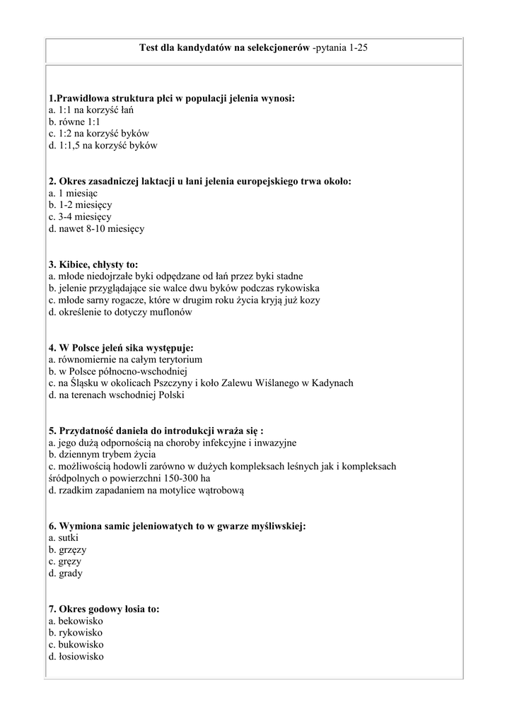Test dla kandydatów na selekcjonerów -pytania 1-25 1.Prawidłowa struktura płci w populacji jelenia wynosi: a. 1:1 na korzyść łań b. równe 1:1 c. 1:2 na korzyść byków d. 1:1,5 na korzyść byków 2. Okres zasadniczej laktacji u łani jelenia europejskiego trwa około: a. 1 miesiąc b. 1-2 miesięcy c. 3-4 miesięcy d. nawet 8-10 miesięcy 3. Kibice, chłysty to: a. młode niedojrzałe byki odpędzane od łań przez byki stadne b. jelenie przyglądające sie walce dwu byków podczas rykowiska c. młode sarny rogacze, które w drugim roku życia kryją już kozy d. określenie to dotyczy muflonów 4. W Polsce jeleń sika występuje: a. równomiernie na całym terytorium b. w Polsce północno-wschodniej c. na Śląsku w okolicach Pszczyny i koło Zalewu Wiślanego w Kadynach d. na terenach wschodniej Polski 5. Przydatność daniela do introdukcji wraża się : a. jego dużą odpornością na choroby infekcyjne i inwazyjne b. dziennym trybem życia c. możliwością hodowli zarówno w dużych kompleksach leśnych jak i kompleksach śródpolnych o powierzchni 150-300 ha d. rzadkim zapadaniem na motylice wątrobową 6. Wymiona samic jeleniowatych to w gwarze myśliwskiej: a. sutki b. grzęzy c. gręzy d. grady 7. Okres godowy łosia to: a. bekowisko b. rykowisko c. bukowisko d. łosiowisko 8. W Polsce roczny przyrost populacji łosia waha się w granicach: a. 20-30 % b. 10-15 % c. 40-50 % d. ponad 70 % 9. Który z gatunków zwierzyny płowej potrafi w poszukiwaniu żeru nurkować pod wodą na głębokość kilku metrów: a. jeleń szlachetny b. jeleń sika c. łoś d. taki gatunek zwierzyny płowej nie istnieje 10. Pęk włosów długości 8-10 cm na napletku rogacza to: a. fartuszek b. kwiat c. kiść d. pędzel 11. Zmiana sukni u sarny następuje: a. dwa razy w roku, wiosną i jesienią b. jeden raz w roku, wiosną c. jeden raz w roku , jesienią d. dwa razy w roku , wiosną i zimą 12. Który z jeleniowatych ma najwyżej wyspecjalizowany przewód pokarmowyprzystosowany do wybiórczego pobierania żeru, jedynie o dużej strawności a. łoś b. daniel c. jeleń d. sarna 13. Sarna polna jest to: a. jeden z pięciu podgatunków sarny występujących na kuli ziemskiej b. forma ekologiczna sarny europejskiej c. odrębny gatunek rodzaju sarna d. żadna z odpowiedzi nie jest prawidłowa 14. Po 6 miesiącach życia młode koźlęta sarny osiągają średnią masę tuszy: a. 5-6 kg b. 8-10 kg c. 15 kg d. 15-20 kg 15. U sarny rozróżnia się trzy podstawowe formy poroża: a. szpicak, szóstak, ósmak b. szpicak, łyżkarz, łopatach c. szpicak, widłak, szóstak d. szpicak, łyżkarz, szóstak 16. Przyjmuje się , że średnia wielkość przyrostu zrealizowanego dla sarny w naszych łowiskach, w odniesieniu do wiosennego stanu liczbowego, wynosi: a. 10-15 % b. 10-30 % c. 40-50 % d. około 60 % 17. Jakie ugrupowania tworzą sarny w okresie jesienno-zimowym: a. jednopłciowe kierdle b. różnopłciowe rudle c. jednopłciowe chmary d. różnopłciowe watahy 18. W populacji jelenia o prawidłowej strukturze płci odstrzał winien wynosić: a. 20-30 % byków; 50-60 % łań; 10-20 % cieląt b. 50 % byków; 40 % łań; 10 % cieląt c 30-40 % byków; 40-50 % łań; 10-30 % cieląt d. 40 % byków; 50 % łań; 10 % cieląt 19. W populacji sarny o prawidłowej strukturze płci odstrzał powinien wynosić: a. 30 % rogacze; 50 % kozy; 20 % koźlęta b. 40 % rogacze; 50 % kozy; 10 % koźlęta c. 50 % rogacze; 40 % kozy; 10 % koźlęta d. 50% rogacze; 30% kozy; 20% koźlęta 20. Cielęta jelenia szlachetnego najczęściej przychodzą na świat w miesiącach: a. maj- czerwiec b. luty- marzec c. lipiec- sierpień d. wrzesień- październik 21. W populacji łosia prawidłowy stosunek płci winien wynosić: a. 1:1,5 na korzyść klęp b. 2:1 na korzyść byków c. równe 1:1 d. 1:3 na korzyść klęp 22. Plamki na sukni charakterystyczne dla większości jeleniowatych nie występują u: a. koźlaków b. łoszaków c. cielaków jelenia d. cielaków daniela 23. Nogi u sarny to w gwarze myśliwskiej: a. biegi b. badyle c. cewki d. skoki 24. W stosunku do samców zwierzyny płowej stosuje się następujące rodzaje odstrzałów: a. selekcyjny, redukcyjny b. redukcyjny, sanitarny c. redukcyjny, selekcyjny, odstrzał samców łownych d. selekcyjny, samców łownych, sanitarny, redukcyjny 25. Liczba osobników , które spośród wszystkich urodzonych w danym roku dożyły do stanu osobników wyrośniętych (od wiosny do wiosny ) to: a. bilans roczny populacji b. śmiertelność zimowa populacji c. przyrost zrealizowany d. naturalna śmiertelność Test dla kandydatów na selekcjonerów -pytania 26-50 26. U jelenia podstawowym sposobem określania wieku jest: a. kolor i rozkład plamek na głowie b. ilość odnóg na każdej z tyk wieńca c. ogólny wygląd sylwetki, kolejność wymiany i stopień starcia zębów d. określenie wieku jest praktycznie niemożliwe 27. Poroże jelenia szlachetnego (wieniec) składa się z dwu tyk na których wyróżnia się odnogi. Ich nazwy ( od najwyższej do najniższej) to: a. opierak, oczniak, nadoczniak, korona lub widlica b. opierak, nadoczniak, oczniak, korona lub widlica c. korona lub widlica, nadoczniak, opierak, oczniak d. oczniak, nadoczniak, opierak, korona lub widlica 28. Pasynki to: a. tyki w porożu rogacza b. wyrostki dłuższe niż 2 cm na wieńcu jelenia c. odnogi na łopacie w porożu łosia d. żadna z odpowiedzi nie jest poprawna 29. Populacja ma poprawną strukturą wiekową jeżeli: a. liczebność osobników w poszczególnych kategoriach wiekowych jest podobna b. dominującą ilościowo osobniki w średnim wieku c. rozkład wiekowy tworzy tzw. piramidę, w której podstawę tworzą osobniki młode d. rozkład wiekowy tworzy tzw. piramidę, w której podstawę tworzą osobniki najstarsze 30. Przyrost zrealizowany w populacji sarny wynosi średnio: a. do 36% stanu wiosennego całości populacji b. około 0,6 koźlęcia od 1 kozy c. przeciętnie 1,5 koźlęcia od