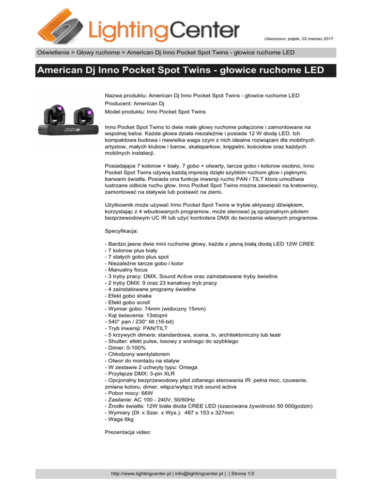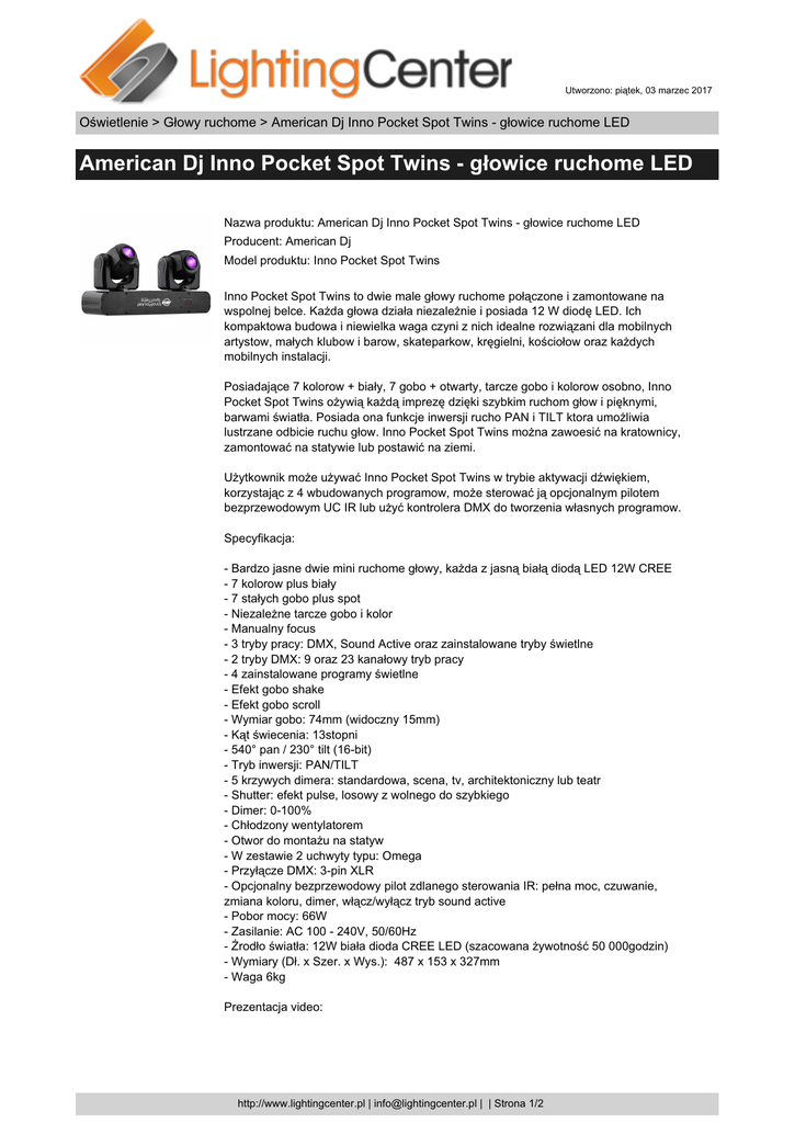 Utworzono: piątek, 03 marzec 2017 Oświetlenie > Głowy ruchome > American Dj Inno Pocket Spot Twins - głowice ruchome LED American Dj Inno Pocket Spot Twins - głowice ruchome LED Nazwa produktu: American Dj Inno Pocket Spot Twins - głowice ruchome LED Producent: American Dj Model produktu: Inno Pocket Spot Twins Inno Pocket Spot Twins to dwie male głowy ruchome połączone i zamontowane na wspolnej belce. Każda głowa działa niezależnie i posiada 12 W diodę LED. Ich kompaktowa budowa i niewielka waga czyni z nich idealne rozwiązani dla mobilnych artystow, małych klubow i barow, skateparkow, kręgielni, kościołow oraz każdych mobilnych instalacji. Posiadające 7 kolorow + biały, 7 gobo + otwarty, tarcze gobo i kolorow osobno, Inno Pocket Spot Twins ożywią każdą imprezę dzięki szybkim ruchom głow i pięknymi, barwami światła. Posiada ona funkcje inwersji rucho PAN i TILT ktora umożliwia lustrzane odbicie ruchu głow. Inno Pocket Spot Twins można zawoesić na kratownicy, zamontować na statywie lub postawić na ziemi. Użytkownik może używać Inno Pocket Spot Twins w trybie aktywacji dźwiękiem, korzystając z 4 wbudowanych programow, może sterować ją opcjonalnym pilotem bezprzewodowym UC IR lub użyć kontrolera DMX do tworzenia własnych programow. Specyfikacja: - Bardzo jasne dwie mini ruchome głowy, każda z jasną białą diodą LED 12W CREE - 7 kolorow plus biały - 7 stałych gobo plus spot - Niezależne tarcze gobo i kolor - Manualny focus - 3 tryby pracy: DMX, Sound Active oraz zainstalowane tryby świetlne - 2 tryby DMX: 9 oraz 23 kanałowy tryb pracy - 4 zainstalowane programy świetlne - Efekt gobo shake - Efekt gobo scroll - Wymiar gobo: 74mm (widoczny 15mm) - Kąt świecenia: 13stopni - 540° pan / 230° tilt (16-bit) - Tryb inwersji: PAN/TILT - 5 krzywych dimera: standardowa, scena, tv, architektoniczny lub teatr - Shutter: efekt pulse, losowy z wolnego do szybkiego - Dimer: 0-100% - Chłodzony wentylatorem - Otwor do montażu na statyw - W zestawie 2 uchwyty typu: Omega - Przyłącze DMX: 3-pin XLR - Opcjonalny bezprzewodowy pilot zdlanego sterowania IR: pełna moc, czuwanie, zmiana koloru, dimer, włącz/wyłącz tryb sound active - Pobor mocy: 66W - Zasilanie: AC 100 - 240V, 50/60Hz - Źrodło światła: 12W biała dioda CREE LED (szacowana żywotność 50 000godzin) - Wymiary (Dł. x Szer. x Wys.): 487 x 153 x 327mm - Waga 6kg Prezentacja video: http://www.lightingcenter.pl | [email protected] | | Strona 1/2 Utworzono: piątek, 03 marzec 2017 Oświetlenie > Głowy ruchome > American Dj Inno Pocket Spot Twins - głowice ruchome LED American Dj Inno Pocket Spot Twins - głowice ruchome LED adjpocket kod:megapromo Cena: 2419.00zł http://www.lightingcenter.pl | [email protected] | | Strona 2/2