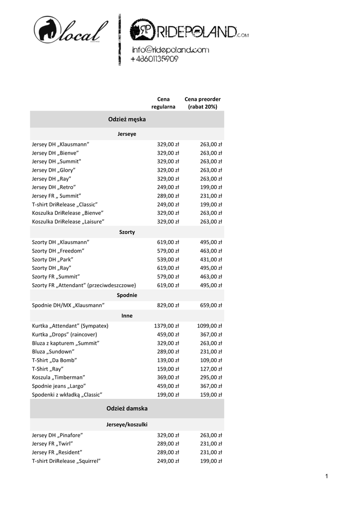 Cena regularna Cena preorder (rabat 20%) Odzież męska Jerseye Jersey DH „Klausmann” Jersey DH „Bienve” Jersey DH „Summit" Jersey DH „Glory” Jersey DH „Ray” Jersey DH „Retro” Jersey FR „ Summit” T-shirt DriRelease „Classic” Koszulka DriRelease „Bienve” Koszulka DriRelease „Laisure” 329,00 zł 329,00 zł 329,00 zł 329,00 zł 329,00 zł 249,00 zł 289,00 zł 249,00 zł 329,00 zł 329,00 zł 263,00 zł 263,00 zł 263,00 zł 263,00 zł 263,00 zł 199,00 zł 231,00 zł 199,00 zł 263,00 zł 263,00 zł 619,00 zł 579,00 zł 539,00 zł 619,00 zł 579,00 zł 619,00 zł 495,00 zł 463,00 zł 431,00 zł 495,00 zł 463,00 zł 495,00 zł 829,00 zł 659,00 zł 1379,00 zł 459,00 zł 329,00 zł 289,00 zł 139,00 zł 159,00 zł 369,00 zł 459,00 zł 199,00 zł 1099,00 zł 367,00 zł 263,00 zł 231,00 zł 109,00 zł 127,00 zł 295,00 zł 367,00 zł 159,00 zł 329,00 zł 289,00 zł 289,00 zł 249,00 zł 263,00 zł 231,00 zł 231,00 zł 199,00 zł Szorty Szorty DH „Klausmann” Szorty DH „Freedom” Szorty DH „Park” Szorty DH „Ray” Szorty FR „Summit” Szorty FR „Attendant” (przeciwdeszczowe) Spodnie Spodnie DH/MX „Klausmann” Inne Kurtka „Attendant” (Sympatex) Kurtka „Drops” (raincover) Bluza z kapturem „Summit” Bluza „Sundown” T-Shirt „Da Bomb” T-Shirt „Ray” Koszula „Timberman” Spodnie jeans „Largo” Spodenki z wkładką „Classic” Odzież damska Jerseye/koszulki Jersey DH „Pinafore” Jersey FR „Twirl” Jersey FR „Resident” T-shirt DriRelease „Squirrel” 1 Szorty Szorty DH „Pebbles” Szorty FR „Valley” Szorty FR „Attendant” (przeciwdeszczowe) 539,00 zł 579,00 zł 619,00 zł 431,00 zł 463,00 zł 495,00 zł 1379,00 zł 289,00 zł 139,00 zł 459,00 zł 199,00 zł 1099,00 zł 231,00 zł 109,00 zł 367,00 zł 159,00 zł 59,00 zł 59,00 zł 49,00 zł 47,00 zł 47,00 zł 39,00 zł 199,00 zł 159,00 zł Inne Kurtka damska „Attendant” (Sympatex) Bluza „Dawn” Koszulka „Resident” Spodnie jeans „Chula” Spodenki z wkładką „Classic” Unisex Skarpety Podkolanówki „Kink” Podkolanówki „Classic” Skarpetki (krótkie)„Classic” Rękawiczki Rekawiczki FR "Bear" ridepoland.com | email: [email protected] | tel: +48601135909 2
