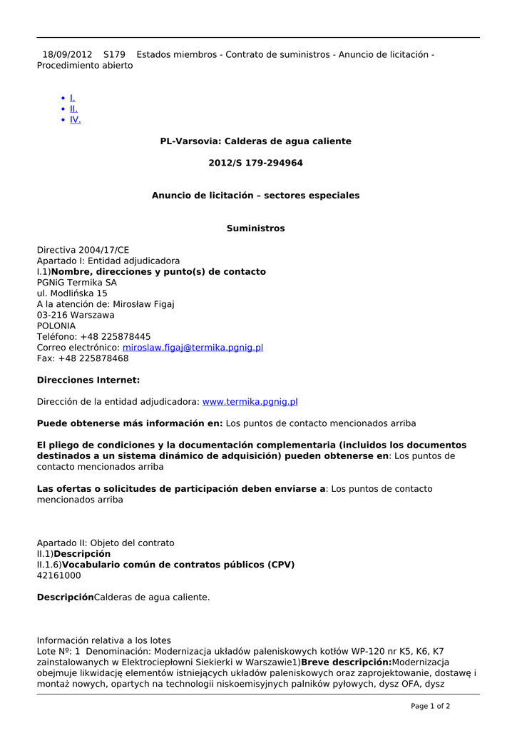 18/09/2012 S179 Estados miembros - Contrato de suministros - Anuncio de licitación Procedimiento abierto I. II. IV. PL-Varsovia: Calderas de agua caliente 2012/S 179-294964 Anuncio de licitación – sectores especiales Suministros Directiva 2004/17/CE Apartado I: Entidad adjudicadora I.1)Nombre, direcciones y punto(s) de contacto PGNiG Termika SA ul. Modlińska 15 A la atención de: Mirosław Figaj 03-216 Warszawa POLONIA Teléfono: +48 225878445 Correo electrónico: [email protected] Fax: +48 225878468 Direcciones Internet: Dirección de la entidad adjudicadora: www.termika.pgnig.pl Puede obtenerse más información en: Los puntos de contacto mencionados arriba El pliego de condiciones y la documentación complementaria (incluidos los documentos destinados a un sistema dinámico de adquisición) pueden obtenerse en: Los puntos de contacto mencionados arriba Las ofertas o solicitudes de participación deben enviarse a: Los puntos de contacto mencionados arriba Apartado II: Objeto del contrato II.1)Descripción II.1.6)Vocabulario común de contratos públicos (CPV) 42161000 DescripciónCalderas de agua caliente. Información relativa a los lotes Lote Nº: 1 Denominación: Modernizacja układów paleniskowych kotłów WP-120 nr K5, K6, K7 zainstalowanych w Elektrociepłowni Siekierki w Warszawie1)Breve descripción:Modernizacja obejmuje likwidację elementów istniejących układów paleniskowych oraz zaprojektowanie, dostawę i montaż nowych, opartych na technologii niskoemisyjnych palników pyłowych, dysz OFA, dysz Page 1 of 2 powietrza osłonowego (jeżeli będą wymagane) oraz układu sterowania i regulacji wymaganych dla osiągnięcia założonych parametrów pracy kotłów ze szczególnym uwzględnieniem redukcji tlenków azotu do poziomu ≤ 380 mg/Nm3. Modernizacja obejmuje także dopasowanie nowego układu do istniejących urządzeń i instalacji poszczególnych kotłów. W ramach realizacji przedmiotu umowy wykonane zostaną wszystkie konieczne prace przygotowawcze, demontażowe, montażowe, diagnostyczne, kontroli jakości, budowlane we wszystkich branżach oraz wykończeniowe. 2)Vocabulario común de contratos públicos (CPV) 42161000 4)Indicación sobre el período distinto de duración o el inicio/la ejecución del contratocomienzo 1.2.2013 ejecución 15.6.2014 Lote Nº: 2 Denominación: Modernizacja układu paleniskowego kotła WP-200 nr K16 zainstalowanego w Elektrociepłowni Siekierki w Warszawie1)Breve descripción:Modernizacja obejmuje likwidację elementów istniejącego układu paleniskowego oraz zaprojektowanie, dostawę i montaż nowego, opartego na technologii niskoemisyjnych palników pyłowych, dysz OFA, dysz powietrza osłonowego (jeżeli będą wymagane) oraz układu sterowania i regulacji wymaganych dla osiągnięcia założonych parametrów pracy kotła ze szczególnym uwzględnieniem redukcji tlenków azotu do poziomu ≤ 380 mg/Nm3. Modernizacja obejmuje także dopasowanie nowego układu do istniejących urządzeń i instalacji kotła. W ramach realizacji przedmiotu umowy wykonane zostaną wszystkie konieczne prace przygotowawcze, demontażowe, montażowe, diagnostyczne, kontroli jakości, budowlane we wszystkich branżach oraz wykończeniowe. 2)Vocabulario común de contratos públicos (CPV) 42161000 4)Indicación sobre el período distinto de duración o el inicio/la ejecución del contratocomienzo 1.2.2013 ejecución 15.6.2015 Apartado IV: Procedimiento IV.3)Información administrativa IV.3.3)Condiciones para la obtención del pliego de condiciones y documentación complementaria IV.3.4)Fecha límite para la recepción de ofertas y solicitudes de participación13.11.2012 12:00 IV.3.5)Lengua(s) en que puede(n) redactarse los proyectos o las solicitudes de participaciónpolaco. Page 2 of 2 Powered by TCPDF (www.tcpdf.org)