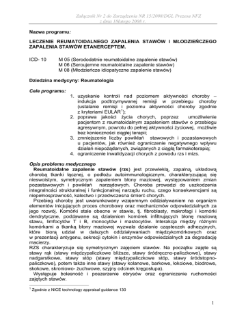 Załącznik Nr 2 do Zarządzenia NR 15/2008/DGL Prezesa NFZ z dnia 18lutego 2008 r. Nazwa programu: LECZENIE REUMATOIDALNEGO ZAPALENIA STAWÓW I MŁODZIEŃCZEGO ZAPALENIA STAWÓW ETANERCEPTEM. ICD- 10 M 05 (Serododatnie reumatoidalne zapalenie stawów) M 06 (Seroujemne reumatoidalne zapalenie stawów) M 08 (Młodzieńcze idiopatyczne zapalenie stawów) Dziedzina medycyny: Reumatologia Cele programu: 1. uzyskanie kontroli nad poziomem aktywności choroby – indukcja podtrzymywanej remisji w przebiegu choroby (ustalanie remisji i poziomu aktywności choroby zgodnie z kryteriami EULAR1); 2. poprawa jakości życia chorych, poprzez umożliwienie pacjentom z reumatoidalnym zapaleniem stawów o przebiegu agresywnym, powrotu do pełnej aktywności życiowej, możliwie bez konieczności ciągłej terapii; 3. zmniejszenie liczby powikłań stawowych i pozastawowych u pacjentów, jak również ograniczenie negatywnego wpływu działań niepożądanych, związanych z ciągłą farmakoterapią; 4. ograniczenie inwalidyzacji chorych z powodu rzs i mizs. Opis problemu medycznego Reumatoidalne zapalenie stawów (rzs) jest przewlekłą, zapalną, układową chorobą tkanki łącznej, o podłożu autoimmunologicznym, charakteryzującą się nieswoistym, symetrycznym zapaleniem błony maziowej, występowaniem zmian pozastawowych i powikłań narządowych. Choroba prowadzi do uszkodzenia integralności strukturalnej i funkcjonalnej narządu ruchu, czego konsekwencjami są niepełnosprawność, kalectwo i przedwczesna śmierć chorych. Przebieg choroby jest uwarunkowany wzajemnym oddziaływaniem na organizm elementów inicjujących proces chorobowy oraz mechanizmów odpowiedzialnych za jego rozwój. Komórki stale obecne w stawie, tj. fibroblasty, makrofagi i komórki dendrytyczne, poddawane są działaniom komórek infiltrujących błonę maziową stawu, limfocytów T i B, monocytów i mastocytów. Interakcja między różnymi komórkami a tkanką błony maziowej wyzwala działanie cząsteczek adhezyjnych, które biorą udział w dalszych oddziaływaniach międzykomórkowych oraz w prezentacji antygenu, sekrecji cytokin i enzymów odpowiedzialnych za degradację macierzy. RZS charakteryzuje się symetrycznym zajęciem stawów. Na początku zajęte są stawy rąk (stawy międzypaliczkowe bliższe, stawy śródręczno-paliczkowe), stawy nadgarstkowe, stawy stóp (stawy międzypaliczkowe stóp, stawy śródstopnopaliczkowe), potem także inne stawy (stawy kolanowe, barkowe, łokciowe, biodrowe, skokowe, skroniowo- żuchwowe, szyjny odcinek kręgosłupa). Występuje bolesność i poszerzenie obrysów oraz ograniczenie ruchomości zajętych stawów. 1 Zgodnie z NICE technology appraisal guidance 130 1 Załącznik Nr 2 do Zarządzenia NR 15/2008/DGL Prezesa NFZ z dnia 18lutego 2008 r. W późnym okresie widoczne są deformacje stawów(podwichnięcia, deformacje typu łabędziej szyjki/palce butonierkowe, odchylenie łokciowe). Choroba atakuje także tkanki okołostawowe oraz pozastawowe. Objawy pozastawowe rzs to: guzki reumatoidalne, zajęcie serca i płuc, objawy oczne, zajęcie układu nerwowego, zespół Felty’ego, zapalenie naczyń, zespół Sjögrena, amyloidoza. Przebieg kliniczny stanowi podstawę do wyodrębnienia następujących typów choroby: - typ samoograniczający – cechuje go łagodny przebieg, rzadkie występowanie czynnika reumatoidalnego , dobra odpowiedź na leki modyfikujące, częściej niż w innych typach występuje pełna remisja choroby; typ z niewielką progresją choroby – słabsza odpowiedź na leczenie lekami modyfikującymi przebieg choroby, stały powolny postęp zmian stawowych; typ z szybką progresją choroby - wysokie miano czynnika reumatoidalnego u większości chorych od początku choroby, często genotyp z obecnością „shared epitopes”, ograniczona odpowiedź na tradycyjne leki modyfikujące, stała szybka progresja zmian i postępująca destrukcja stawów, szybki rozwój niepełnosprawności i inwalidztwa. Młodzieńcze idiopatyczne zapalenie stawów (mizs) jest najczęstszą przewlekłą artropatią w wieku rozwojowym. Pojęcie to jest wspólne dla zapaleń stawów rozpoczynających się przed 16 rokiem życia i trwających co najmniej 6 tygodni. Warunkiem jest wykluczenie innych przyczyn zapaleń stawów jak np. infekcyjne zapalenie stawów, reaktywne zapalenie stawów, alergiczne i toksyczne zapalenie stawów, artropatie występujące w przebiegu chorób nowotworowych, chorób krwi , chorób metabolicznych i in. Obraz kliniczny początkowego okresu choroby (pierwszych 6 miesięcy) warunkuje dalszy jej przebieg. Wyróżniamy 3 podstawowe typy początku mizs: 1. początek uogólniony (ok. 20% chorych), przebiegający z hektyczną gorączką, wysypkami, powiększonymi węzłami chłonnymi oraz wątrobą i/lub śledzioną, z objawami zapalenia stawów i błon surowiczych; 2. początek wielostawowy (ok. 30% chorych) przebiegający z zapaleniem co najmniej 5 stawów, stanami podgorączkowymi, miernym podwyższeniem wskaźników ostrej fazy, obniżeniem wartości Hb, obecnością czynnika reumatoidalnego klasy IgM; 3. początek z zajęciem niewielu stawów ( ok. 50% chorych), który przebiega z zapaleniem 1-4 stawów, brakiem cech uogólnienia procesu, zapaleniem błony naczyniowej przedniego odcinka oka, prawidłowymi zazwyczaj wskaźnikami zapalnymi, obecnością przeciwciał przeciwjądrowych. Przebieg choroby ma charakter przewlekły z nawracającymi okresami zaostrzeń i poprawy. U dzieci, które zachorowały wcześnie często spotyka się zaburzenia rozwojowe. Konsekwencją choroby jest kalectwo narządu ruchu, możliwość zmian w narządzie wzroku, ryzyko rozwoju skrobiawicy a nawet (w przypadku początku uogólnionego) ryzyko zejścia śmiertelnego. U części chorych przebieg mizs jest bardzo agresywny, postępujący i oporny na standardowe leczenie (sterydy , leki modyfikujące przebieg choroby, leki immunosupresyjne, NLPZ) . Dotyczy to zarówno postaci