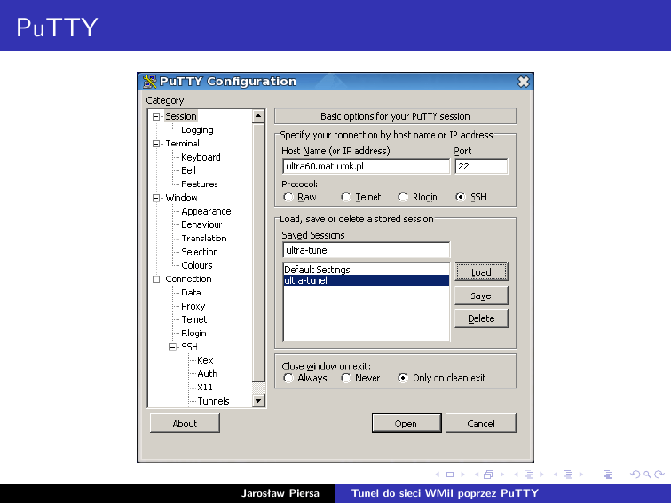 PuTTY Jarosław Piersa Tunel do sieci WMiI poprzez PuTTY PuTTY Jarosław Piersa Tunel do sieci WMiI poprzez PuTTY PuTTY Jarosław Piersa Tunel do sieci WMiI poprzez PuTTY Firefox Jarosław Piersa Tunel do sieci WMiI poprzez PuTTY Firefox Jarosław Piersa Tunel do sieci WMiI poprzez PuTTY Thunderbird Jarosław Piersa Tunel do sieci WMiI poprzez PuTTY Thunderbird Jarosław Piersa Tunel do sieci WMiI poprzez PuTTY Uwagi I Należy się połączyć z hostem ultra60 lub Juliusz (inne nie są dostępne z poza wydziału). I Forwardowany port powinien byc wysoki (p > 1000). I Po modyfikacji ustawień należy zrestartować Firefoxa. I Po zamknięciu tunelu Firefox nie będzie działał, wówczas należy przywrócić domyślne ustawienia połączeń. I Można zainstalować i skonfigurować dodatkową przeglądarkę. Jedna na codzień, druga do pracy z tunelem. Unikniemy każdorazowych modyfikacji ustawień połączeń. I Rozwiązanie jest dość prowizoryczne, na dłuższą metę VPN jest lepszy Jarosław Piersa Tunel do sieci WMiI poprzez PuTTY Linki I http://thinkhole.org/wp/2006/05/10/howto-secure-firefoxand-im-with-putty/ I http://www.mozilla.org/ I https://liferay.mat.umk.pl/group/sls/skwmii Jarosław Piersa Tunel do sieci WMiI poprzez PuTTY