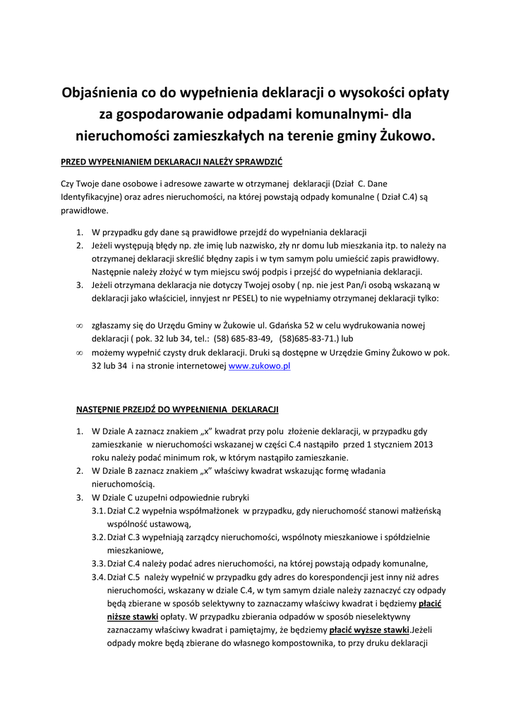 Objaśnienia co do wypełnienia deklaracji o wysokości opłaty za gospodarowanie odpadami komunalnymi- dla nieruchomości zamieszkałych na terenie gminy Żukowo. PRZED WYPEŁNIANIEM DEKLARACJI NALEŻY SPRAWDZIĆ Czy Twoje dane osobowe i adresowe zawarte w otrzymanej deklaracji (Dział C. Dane Identyfikacyjne) oraz adres nieruchomości, na której powstają odpady komunalne ( Dział C.4) są prawidłowe. 1. W przypadku gdy dane są prawidłowe przejdź do wypełniania deklaracji 2. Jeżeli występują błędy np. złe imię lub nazwisko, zły nr domu lub mieszkania itp. to należy na otrzymanej deklaracji skreślić błędny zapis i w tym samym polu umieścić zapis prawidłowy. Następnie należy złożyć w tym miejscu swój podpis i przejść do wypełniania deklaracji. 3. Jeżeli otrzymana deklaracja nie dotyczy Twojej osoby ( np. nie jest Pan/i osobą wskazaną w deklaracji jako właściciel, innyjest nr PESEL) to nie wypełniamy otrzymanej deklaracji tylko: • • zgłaszamy się do Urzędu Gminy w Żukowie ul. Gdańska 52 w celu wydrukowania nowej deklaracji ( pok. 32 lub 34, tel.: (58) 685-83-49, (58)685-83-71.) lub możemy wypełnić czysty druk deklaracji. Druki są dostępne w Urzędzie Gminy Żukowo w pok. 32 lub 34 i na stronie internetowej www.zukowo.pl NASTĘPNIE PRZEJDŹ DO WYPEŁNIENIA DEKLARACJI 1. W Dziale A zaznacz znakiem „x” kwadrat przy polu złożenie deklaracji, w przypadku gdy zamieszkanie w nieruchomości wskazanej w części C.4 nastąpiło przed 1 styczniem 2013 roku należy podać minimum rok, w którym nastąpiło zamieszkanie. 2. W Dziale B zaznacz znakiem „x” właściwy kwadrat wskazując formę władania nieruchomością. 3. W Dziale C uzupełni odpowiednie rubryki 3.1. Dział C.2 wypełnia współmałżonek w przypadku, gdy nieruchomość stanowi małżeńską wspólność ustawową, 3.2. Dział C.3 wypełniają zarządcy nieruchomości, wspólnoty mieszkaniowe i spółdzielnie mieszkaniowe, 3.3. Dział C.4 należy podać adres nieruchomości, na której powstają odpady komunalne, 3.4. Dział C.5 należy wypełnić w przypadku gdy adres do korespondencji jest inny niż adres nieruchomości, wskazany w dziale C.4, w tym samym dziale należy zaznaczyć czy odpady będą zbierane w sposób selektywny to zaznaczamy właściwy kwadrat i będziemy płacić niższe stawki opłaty. W przypadku zbierania odpadów w sposób nieselektywny zaznaczamy właściwy kwadrat i pamiętajmy, że będziemy płacić wyższe stawki.Jeżeli odpady mokre będą zbierane do własnego kompostownika, to przy druku deklaracji otrzymacie Państwo również druk zgłoszenia kompostownika, który należy wypełnić i złożyć wraz z wypełnioną deklaracją. 4. W Dziale D , należy określić ilości i wielkości gospodarstwa domowego jakie występują na Twojej nieruchomości. Przykładowo na nieruchomości mogą występować trzy, dwu lub 2- a cztero osobowe gospodarstwa domowe. Powyżej 4 osób w gospodarstwie domowy stawka pozostaje taka sama. UWAGA- W przypadku gdy ilość osób zameldowanych pod danym adresem będzie wyższa niż ilość osób zamieszkałych- zadeklarowanych do opłaty, to taka deklaracja będzie wymagała wyjasnienia i złożenia oświadczenia przez właściciela nieruchomości o następującej treści „Oświadczam że osoba……………(podać imię i nazwisko) nie przebywa pod adresem (podać adres nieruchomości). Obecnie przebywa ………………..(podać adres obecnie zamieszkania)”. 5. W poz. 58 oblicz sumę należnej opłaty za gospodarowanie odpadami komunalnymi, która stanowi iloczyn ilości gospodarstw domowych i stawki za gospodarstwo domowe w danej kategorii. 6. W Dziale E. zostały podane terminy uiszczania opłaty wyliczonej i podanej w poz. 58 Działu D. 7. W Dziale F. należy podać dane imię i nazwisko oraz nr PESEL współwłaścicieli nieruchomości, którzy wspólnie z osobą składająca deklaracje zamieszkują i tworzą gospodarstwo domowe. W przypadku lokalizacji pojemników na odpady w innym miejscu niż znajduje się nieruchomość określona w dziale C.4, należy podać dokładną lokalizacje tych pojemników z podaniem m.in. nr posesji, w rejonie której pojemniki są zlokalizowane lub inne orientacyjne punkty pozwalające zlokalizować miejsce ustawienia pojemników. Dane te są niezbędne dla firmy, która z ramienia Gminy będzie odbierać odpady od właścicieli nieruchomości zamieszkałych. 8. W dziale G. w poz. 59 podaj imię i nazwisko osoby składającej deklarację, w poz. 60 wpisz datę wypełnienia deklaracji, w poz. 61 podaj nr telefonu pod który będziemy się z Państwem kontaktować w przypadku potrzeby wyjaśnienia nieścisłości danych w deklaracji. W poz. 62 złóż swój czytelny podpis, w przypadku małżeńskiej wspólności ustawowej dla danej nieruchomości w poz. 63 czytelny podpis składa również współmałżonek.
