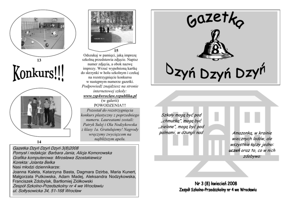 15 13 14 Odszukaj w pamięci, jaką imprezę szkolną przedstawia zdjęcie. Napisz numer zdjęcia, a obok nazwę imprezy. Wrzuć wypełnioną kartkę do skrzynki w holu szkolnym i czekaj na rozstrzygnięcie konkursu w następnym numerze gazetki. Podpowiedź znajdziesz na stronie internetowej szkoły: www.zsp4wroclaw.republika.pl (w galerii) POWODZENIA!!! Pozostał do rozstrzygnięcia konkurs plastyczny z poprzedniego numeru. Laureatami zostali: Patryk Sulej i Ola Nodzykowska z klasy 1a. Gratulujemy! Nagrody wręczymy zwycięzcom na najbliższym apelu. Gazetka Dzyń Dzyń Dzyń 3(8)2008 Pomysł i redakcja: Barbara Jania, Alicja Komorowska Grafika komputerowa: Mirosława Szostakiewicz Korekta: Jolanta Belka Nasi młodzi dziennikarze: Joanna Kaleta, Katarzyna Basta, Dagmara Dzirba, Maria Kunert, Małgorzata Putkowska, Adam Madej, Aleksandra Nodzykowska, Franciszek Zdobylak, Bartłomiej Ziółkowski Zespół Szkolno-Przedszkolny nr 4 we Wrocławiu ul. Sołtysowicka 34, 51-168 Wrocław Szkoły mogą być pod „chmurką”, mogą być „zielone”, mogą być pod palmami, w dżungli nad Amazonką, w krainie wiecznych lodów, ale wszystkie łączy jedno: uczeń oraz to, co w nich zdobywa: PRZYJAŹŃ ŚMIECH I GWAR OPIEKA ŻYCZLIWOŚĆ WIEDZA ZABAWA UMIEJĘTNOŚCI 7 10 BEZPIECZEŃSTWO KOLEŻEŃSTWO A wszystkich uczniów na całej kuli ziemskiej łączy: CIEKAWOŚĆ ZAINTERESOWANIA FIGLE I PSOTY 8 11 SZKOLNE WYMÓWKI NOWE WIADOMOŚCI Wspomnienia Dzyń, Dzyń – prawie najstarsze uczennice wspominają.... Mój pierwszy dzień w szkole Weszłam do szkoły i rozglądałam się po całym budynku. Poszłam dalej i zobaczyłam, że jest w niej sklepik oraz dużo sal. Następnie moja mama zapisała mnie do świetlicy szkolnej. Nagle zadzwonił dzwonek i musiałam iść do swojej klasy. Bardzo się bałam, 9 12 że w szkole będzie trudno i że nie zdołam nauczyć się rzeczy, które zadają nauczyciele. Jednak myliłam się, bo nasza nauczycielka była bardzo bardzo uprzejma i miła. Wychowawczyni oprowadziła nas po całej szkole i podała nam nasz plan lekcji. Bardzo polubiłam moją klasę i następnego dnia z chęcią poszłam do szkoły. Asia Kaleta kl. V 1 4 2 5 3 6 Bardzo się denerwowałam w pierwszy dzień w szkole, lecz wszystko było jak trzeba. Weszłam do sali i usiadłam w ławce z moją koleżanką. Lekcje nie były trudne, bo uczyła nas wspaniała pani. Mimo tego, że to nie zabawa, byłam w świetnym humorze. Chciałabym wrócić do tych czasów. Kasia Basta kl. V „Wspomnienia ze starej szkoły” Pamiętam 1 września przed pięcioma laty, kiedy to po raz pierwszy usłyszałam szkolny dzwonek. Wydaje się, że było to tak niedawno. Szkoła sprawiała wrażenie dużej, szarej i nieprzyjemnej. Mieliśmy wtedy małą salę gimnastyczną, w której odbyło się pasowanie. Biblioteka to malutki, ciemny pokoik, ale przytulny i kolorowy. Jako pierwszą lekturę wypożyczyłam książkę pt. „Plastusiowy pamiętnik”. W świetlicy było wesoło i przyjemnie. Panie organizowały różne zabawy oraz konkursy. Na zielonym boisku za szkołą odbywały się festyny. Naszą starą szkołę z tradycjami odwiedził prezydent Wrocławia. Otwierał, przecinając wstęgę, drzwi nowo wybudowanej sali gimnastycznej. Dzisiaj wiem na pewno, że Szkoła Podstawowa nr 40 to była, jest i będzie moja szkoła. Dagmara Dzirba kl. V „Moja ulubiona szkoła” Bardzo lubię swoją szkołę. Nie jest może duża, ale dzięki temu wszyscy się tu znamy i dlatego jest bezpiecznie. Nasi nauczyciele też są mili, chociaż wymagający. Ja ze wszystkich przedmiotów, jakie mamy, najbardziej lubię w-f i plastykę chociaż z innymi przedmiotami też sobie radzę. Lubię chodzić do szkoły, bo mam tu wielu przyjaciół i znajomych. Większość z nich chodzi ze mną do klasy i najczęściej spotykamy się w szkole. Oprócz przedmiotów obowiązkowych nasza szkoła oferuje również wiele zajęć pozalekcyjnych. Są kółka plastyczne, sportowe, matematyczne, muzyczne, teatralne i wiele innych. Bardzo się cieszę, że chodzę właśnie do tej szkoły. Marysia Kunert kl. V Tak było pięć lat temu, a teraz kolej na naszych najmłodszych oraz ich wrażenia. Cześć! Mam na imię Małgosia. Chodzę do klasy 1a. Wolę chodzić do szkoły, bo w domu niczego się nie nauczę, a tutaj bardzo wiele. W szkole mam dużo przyjaciół, koleżanek i kolegów. Niedługo są ferie wiosenne i pojadę do dziadka i babci na wieś. Z tej okazji życzę Wam mokrego Śmigusa Dyngusa i udanej zabawy. Małgosia Putkowska kl. Ia „Co sądzę o mojej szkole?” Moja szkoła jest fajna. Mamy miłą panią i wysportowaną klasę. Lekcje zintegrowane mają taką zaletę, że można się dużo nauczyć. Najbardziej lubię lekcje niemieckiego. Są zabawy, sporo zadań w ćwiczeniach, czasem śpiewamy (oczywiście po niemiecku). Na lekcjach w-fu najczęściej gramy w dwa ognie i w zbijaka, teraz już przechodzimy do siatkówki, a zaczynaliśmy od gry w „matki i dziecko”. To tyle o lekcjach. Oczywiście przerwy to coś, co bardziej lubimy, bo mamy czas na zabawę, niestety, nie zawsze bezpieczną. No, taka jest prawda, że czasem brakuje nam miejsca na nasz harmider i to skutkuje częstymi wizytami u pani dyrektor na „dywaniku”. Mnie to jeszcze nigdy się nie zdarzyło, ale niektórzy moi koledzy już wiedzą, jak wygląda ten „dywanik”. Jeżeli miałbym mówić o wyglądzie naszej szkoły, powiedziałbym, że jest śliczna. Jest w trakcie remontu i to, co już zostało wyremontowane bardzo mi się podoba. Wygląda na to, że jestem zadowolony z naszej szkoły i wytrzymam w niej pięć lat ☺. Adam Madej kl. Ia Moja szkoła to „40-tka” przy ul. Sołtysowickiej. Szkoła jest parterowa i słoneczna, pośród topoli i sosen. W naszej szkole odbywają się interesujące imprezy, spotykamy się z ciekawymi ludźmi. Nauczyciele organizują nam wyprawy do teatru. Jest dużo różnych zajęć dodatkowych. Nasza szkoła to miejsc