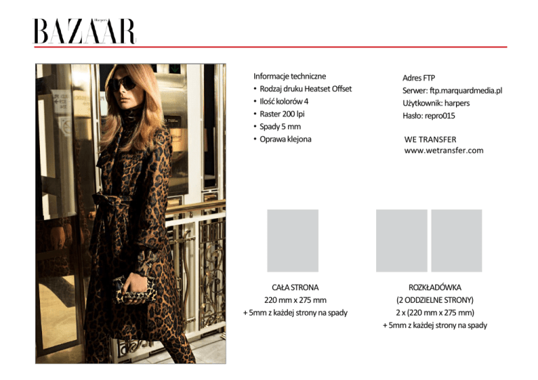 Informacje techniczne • Rodzaj druku Heatset Offset • Ilość kolorów 4 • Raster 200 lpi • Spady 5 mm • Oprawa klejona CAŁA STRONA 220 mm x 275 mm + 5mm z każdej strony na spady Adres FTP Serwer: ftp.marquardmedia.pl Użytkownik: harpers Hasło: repro015 WE TRANSFER www.wetransfer.com ROZKŁADÓWKA (2 ODDZIELNE STRONY) 2 x (220 mm x 275 mm) + 5mm z każdej strony na spady 220x275 227,5x282,5 Specyfikacja techniczna 1. UKŁAD GRAFICZNY 1.1. Każda strona powinna posiadać spady o wielkości 5 mm ze wszystkich stron. 1.2. Ważne elementy tekstowe lub graficzne powinny znajdować się w odległości nie mniejszej niż 7 mm od linii cięcia. 1.3. W przypadku opraw klejonych należy pamiętać, że 2 i 3 strona okładki oraz pierwsza i ostatnia strona wkładu będą miały zaklejone 3-4 mm od strony grzbietu przez klejenie boczne, przez co zmniejsza się efektywny format rozkładówek. Jeżeli nie wprowadzona jest korekta to pojawia się zjawisko „wycięcia” fragmentu obrazu spowodowanego zaklejeniem. Przy czym format strony powinien zostać ten sam, zmianie podlega tylko wielkość obrazu na stronie. 1.4. W przypadku materiałów rozkładówkowych należy pamiętać, że strony będą miały zaklejone 2-3 mm od strony grzbietu przez klejenie boczne. Należy rozsunąć obraz 2 mm w lewo dla strony lewej i 2 mm w prawo dla strony prawej, jeżeli nie została wprowadzona korekta to pojawia się zjawisko „wycięcia” fragmentu obrazu spowodowanego zaklejeniem. 1.5. Dla każdej ze stron należy generować oddzielny plik. Również w przypadku rozkładówek, należy tworzyć oddzielne pliki dla lewej i prawej strony. 1.6. Minimalny stopień pisma drukowanego jednym kolorem wynosi: - dla krojów jednoelementowych 6 pkt. - dla krojów dwuelementowych 7 pkt. Minimalny stopień pisma drukowanego więcej niż jednym kolorem lub w kontrze wynosi: - dla krojów jednoelementowych 8 pkt. - dla krojów dwuelementowych 10 pkt. 1.7. Najmniejsza dopuszczalna grubość linii to 0,2 pkt. Linie wykonane w kontrze lub więcej niż w jednym kolorze powinny mieć grubość nie mniejszą niż 0,75 pkt. 1.8. W celu uzyskania większej głębi czarnego w obszarach apli, należy generować go z 4 kolorów. Zalecane składowe to C=60, M=60, Y=60, K=100. 1.9. Wszystkie elementy graficzne strony muszą być przygotowane w przestrzeni CMYK w oparciu o profil ICC (plik cyfrowy zawierający charakterystykę barwną danego urządzenia. Profil ten jest zgodny z wymaganiami określonymi przez Specyfikację ICC) udostępniony na stronie www.marquard.pl/magazyny/... 1.10. Wszystkie stosowane kolory dodatkowe (spot colours) np. systemu Pantone® muszą być zamienione na CMYK. Specyfikacja techniczna 2. PRZYGOTOWANIE I DOSTARCZENIE MATERIAŁÓW CYFROWYCH 2.1. Strony powinny być przygotowane w postaci plików: - EPS, TIFF dla materiałów montażowych; - EPS, TIFF, PDF (w wersji 1.2, 1.3, 1.4, 1.5), PS (w wersji 1, 2 lub 3) - pliki kompozytowe bez warstw - dla materiałów całostronicowych. 2.2. Rozdzielczość zdjęć zawartych w plikach cyfrowych nie może być niższa niż 300 dpi. Przysłanie grafiki o niższej rozdzielczości oznacza akceptację na obniżenie jakości danego zdjęcia. 2.3. Maksymalne nafarbienie (TAC lub TIL) nie powinno przekraczać 300%. 2.4. Materiały lub ich elementy graficzne nie mogą zawierać dołączonych profili (brak zatagowanych profili). 2.5. Elementy graficzne strony nie mogą zawierać dołączonych komentarzy OPI (Open Prepress Interface). 2.6. Dostarczone pliki w formacie PDF muszą posiadać zdefiniowany trimbox. 2.7. W plikach zapisanych jako EPS wszystkie teksty powinny być zamienione na krzywe. 3. GENEROWANIE PLIKÓW 3.1. Drukarnia zaleca pliki kompozytowe w wersji PDF generowane z aplikacji Adobe, QuarkXpress, Acrobat Distiller w wersji 5.0 lub wyższej. Instrukcja dostępna pod adresem: www.quadgraphics.pl/tresc/Uslugi/Premedia/PlikiPDF 3.2. Pliki PS powinny być sprawdzone programem AdobeDistiller/Reader w celu wykrycia ewentualnych błędów. Postscripty i pdf-y nie powinny zawierać prewek. Wszystkie zdjęcia zawarte w plikach muszą być przygotowane z rozdzielczością 300 dpi. CMYK. 4. NAZEWNICTWO PLIKÓW 4.1. Nazwy plików powinny zawierać nazwę produktu lub Klienta i Tytuł, dla którego zostały przygotowane. 4.2. Nazwy plików nie powinny zawierać polskich znaków, spacji oraz znaków specjalnych (typu / > *). 5. MATERIAŁY WZORCOWE 5.1. Zalecane jest dołączenie proofa kontraktowego do każdej strony. 5.2. Proofy kontraktowe powinny być wykonywane po ostatniej korekcie plików przeznaczonych do druku. 5.3. Do wykonania proofa kontraktowego należy zastosować profil ICC ściągnięty ze strony: www.marquard.pl/magazyny/... 5.4. Na każdym proofiepowinien znajdować się pasek kontrolny. Zalecanym paskiem kontrolnym jest pasek UGRA/FOGRA, który można pobrać ze strony www.marquard.pl/magazyny/... 5.5. Papier wykorzystany do wykonania proofa powinien być jak najbardziej zbliżony do papieru nakładowego pod względem barwy i połysku. Proof musi uwzględniać symulacje podłoża drukowego. 5.6. Jeżeli proof wykonany jest niezgodnie ze specyfikacją to nie stanowi proofa kontraktowego. Materiał dostarczony przez Klienta może stanowić materiał wzorcowy dla maszynisty, ale jest to związane z możliwością uzyskania odmiennej kolorystyki. 5.7. Tylko poprawnie wykonane proofy przechodzą proces certyfikacji (proces kontroli poprawności wykonania proofa, polegający na określeniu różnicy barwy pomiędzy wartościami pomierzonymi na polach paska kontrolnego zamieszczonego na proofie, a wartościami docelowymi. Wartości docelowe określane są na podstawie profilu ICC, w którym wykonany jest proof) w drukarni i są podstawą do reklamacji. Harmonogram 2017 NUMER REKLAMA MATERIAŁY 1 DZIEŃ SPRZEDAŻY 1-2/17 28-lis-16 16-gru-16 03/17 30-sty-17 17-lut-17 04/17 27-lut-17 17-mar-17 05/17 03-kwi-17 21-kwi-17 06/17 27-kwi-17 19-maj-17 7-8/17 29-maj-
