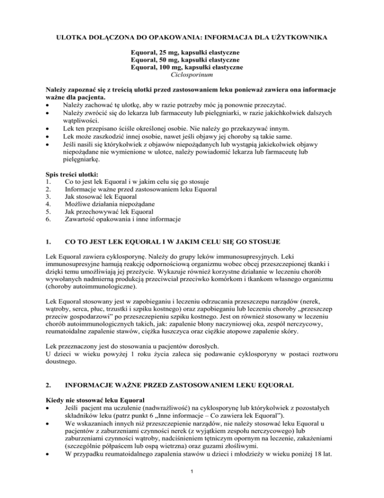 ULOTKA DOŁĄCZONA DO OPAKOWANIA: INFORMACJA DLA UŻYTKOWNIKA Equoral, 25 mg, kapsułki elastyczne Equoral, 50 mg, kapsułki elastyczne Equoral, 100 mg, kapsułki elastyczne Ciclosporinum Należy zapoznać się z treścią ulotki przed zastosowaniem leku ponieważ zawiera ona informacje ważne dla pacjenta. Należy zachować tę ulotkę, aby w razie potrzeby móc ją ponownie przeczytać. Należy zwrócić się do lekarza lub farmaceuty lub pielęgniarki, w razie jakichkolwiek dalszych wątpliwości. Lek ten przepisano ściśle określonej osobie. Nie należy go przekazywać innym. Lek może zaszkodzić innej osobie, nawet jeśli objawy jej choroby są takie same. Jeśli nasili się którykolwiek z objawów niepożądanych lub wystąpią jakiekolwiek objawy niepożądane nie wymienione w ulotce, należy powiadomić lekarza lub farmaceutę lub pielęgniarkę. Spis treści ulotki: 1. Co to jest lek Equoral i w jakim celu się go stosuje 2. Informacje ważne przed zastosowaniem leku Equoral 3. Jak stosować lek Equoral 4. Możliwe działania niepożądane 5. Jak przechowywać lek Equoral 6. Zawartość opakowania i inne informacje 1. CO TO JEST LEK EQUORAL I W JAKIM CELU SIĘ GO STOSUJE Lek Equoral zawiera cyklosporynę. Należy do grupy leków immunosupresyjnych. Leki immunosupresyjne hamują reakcję odpornościową organizmu wobec obcej przeszczepionej tkanki i dzięki temu umożliwiają jej przeżycie. Wykazuje również korzystne działanie w leczeniu chorób wywołanych nadmierną produkcją przeciwciał przeciwko komórkom i tkankom własnego organizmu (choroby autoimmunologiczne). Lek Equoral stosowany jest w zapobieganiu i leczeniu odrzucania przeszczepu narządów (nerek, wątroby, serca, płuc, trzustki i szpiku kostnego) oraz zapobieganiu lub leczeniu choroby „przeszczep przeciw gospodarzowi” po przeszczepieniu szpiku kostnego. Jest on również stosowany w leczeniu chorób autoimmunologicznych takich, jak: zapalenie błony naczyniowej oka, zespół nerczycowy, reumatoidalne zapalenie stawów, ciężka łuszczyca oraz ciężkie atopowe zapalenie skóry. Lek przeznaczony jest do stosowania u pacjentów dorosłych. U dzieci w wieku powyżej 1 roku życia zaleca się podawanie cyklosporyny w postaci roztworu doustnego. 2. INFORMACJE WAŻNE PRZED ZASTOSOWANIEM LEKU EQUORAL Kiedy nie stosować leku Equoral Jeśli pacjent ma uczulenie (nadwrażliwość) na cyklosporynę lub którykolwiek z pozostałych składników leku (patrz punkt 6 „Inne informacje – Co zawiera lek Equoral”). We wskazaniach innych niż przeszczepienie narządów, nie należy stosować leku Equoral u pacjentów z zaburzeniami czynności nerek (z wyjątkiem zespołu nerczycowego) lub zaburzeniami czynności wątroby, nadciśnieniem tętniczym opornym na leczenie, zakażeniami (szczególnie półpaścem lub ospą wietrzna) oraz guzami złośliwymi. W przypadku reumatoidalnego zapalenia stawów u dzieci i młodzieży w wieku poniżej 18 lat. 1 W czasie ciąży. Lek Equoral może być stosowany w czasie ciąży jedynie w przypadku bezwzględnej konieczności. W okresie karmienia piersią. Jeżeli pacjent jest leczony takrolimusem. Jeśli pacjent jest leczony rozuwastatyną. Ostrzeżenia i środki ostrożności Cyklosporyna może być przepisywana wyłącznie przez lekarzy mających doświadczenie w leczeniu immunosupresyjnym, którzy mogą zapewnić właściwą obserwację podczas leczenia, w tym regularne badanie lekarskie, pomiar ciśnienia krwi oraz kontrolę parametrów laboratoryjnych, na podstawie których określa się bezpieczeństwo stosowania leku. Tak, jak inne leki immunosupresyjne, cyklosporyna zwiększa ryzyko rozwoju chłoniaków i innych nowotworów złośliwych, szczególnie nowotworów skóry. Ze względu na potencjalne ryzyko wystąpienia nowotworów złośliwych skóry u osób leczonych lekami immunosupresyjnymi, pacjenci przyjmujący lek Equoral powinni unikać ekspozycji na światło słoneczne przez stosowanie odzieży ochronnej oraz filtrów przeciwsłonecznych o wysokim wskaźniku ochrony. Pacjenci nie powinni być także poddawani działaniu promieniowania UVB lub fotochemioterapii (PUVA). Nie należy podawać leku pacjentom z zaburzeniem czynności nerek z wyjątkiem pacjentów z zespołem nerczycowym z dopuszczalnym stopniem uszkodzenia nerek, niewyrównanym nadciśnieniem tętniczym, trudnymi do opanowania zakażeniami lub nowotworami złośliwymi. Tak, jak inne leki immunosupresyjne, cyklosporyna zwiększa ryzyko rozwoju różnych zakażeń bakteryjnych, grzybiczych, pasożytniczych i wirusowych. Niektóre zakażenia mogą być ciężkie i (lub) prowadzić do zgonu pacjenta. Należy zgłaszać lekarzowi wszelkie objawy zakażenia. Częstym i potencjalnie ciężkim powikłaniem w pierwszych kilku tygodniach leczenia lekiem Equoral może być zwiększone stężenia mocznika i kreatyniny w surowicy. Wymienione zmiany czynnościowe są zależne od dawki i przemijające. Lek Equoral może także powodować zależne od dawki i przemijające zwiększenie stężenia bilirubiny w surowicy, a niekiedy też aktywności enzymów wątrobowych. Dlatego należy dokładnie monitorować parametry określające czynność nerek i wątroby. W przypadku nieprawidłowych wartości lekarz może uznać za konieczne zmniejszenie dawki. W czasie leczenia lekiem Equoral należy regularnie kontrolować ciśnienie tętnicze krwi. W przypadku wystąpienia nadciśnienia tętniczego, lekarz zastosuje odpowiednie leczenie obniżające ciśnienie. Przed leczeniem oraz po zakończeniu pierwszego miesiąca leczenia wskazane jest oznaczenie stężenia lipidów, ponieważ donoszono, że cyklosporyna może w rzadkich przypadkach powodować przemijające, nieznaczne zwiększenie ich stężenia we krwi. W razie stwierdzenia zwiększenia stężenia lipidów, lekarz rozważy ograniczenie spożycia tłuszczów i jeżeli to wskazane, zmniejszenie dawki cyklosporyny. Cyklosporyna zwiększa ryzyko wystąpienia zwiększonego s