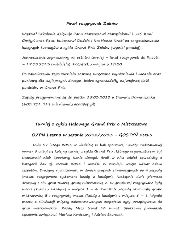 Finał rozgrywek Żaków Wydział Szkolenia dziękuje Panu Mateuszowi Matysiakowi i UKS Kani Gostyń oraz Panu Łukaszowi Dudzie i Krobiance Krobi za zorganizowanie kolejnych turniejów z cyklu Grand Prix Żaków (wyniki poniżej). Jednocześnie zapraszamy na ostatni turniej – finał rozgrywek do Racotu – 17.03.2013 (niedziela). Początek zmagań o 10.00 Po zakończeniu tego turnieju zostaną wręczone wyróżnienia i medale oraz puchary dla najlepszych drużyn, które zgromadziły największą ilość punktów w Grand Prix. Zapisy przyjmowane są do piątku 15.03.2013 u Dawida Dominiczaka (600 701 718 lub [email protected]) Turniej z cyklu Halowego Grand Prix o Mistrzostwo OZPN Leszno w sezonie 2012/2013 - GOSTYŃ 2013 Dnia 17 lutego 2013 w niedzielę w hali sportowej Szkoły Podstawowej numer 5 odbył się kolejny turniej z cyklu Grand Prix, którego organizatorem był Uczniowski Klub Sportowy Kania Gostyń. Brali w nim udział zawodnicy z kategorii Żak tj. rocznik 2004 i młodsi. W turnieju wzięło udział osiem zespołów. Drużyny rywalizowały w dwóch grupach eliminacyjnych po 4 zespoły (mecze rozgrywane systemem każdy z każdym). Następnie dwie pierwsze drużyny z obu grup tworzą grupę mistrzowską A. W grupie tej rozgrywane były mecze (każdy z każdym) o miejsca 1 – 4. Pozostałe zespoły utworzyły grupę mistrzowską B i rozgrywały mecze (każdy z każdym) o miejsca 5 – 8. Wyniki meczu z eliminacji między zainteresowanymi zespołami były przepisywane do grup mistrzowskich. Każdy Mecz trwał 10 minut. sędziowie związkowi: Mariusz Konieczny i Adrian Skorczak. Spotkania prowadzili MECZE W GRUPACH ELIMINACYJNYCH L.p. 1. 2. 3. 4. 5. 6. 7. 8. 9. 10. 11. 12. Mecze UKS Czwórka Kościan – PKS Racot Junior Drobnin – Sparta Miejska Górka UKS Kania I Gostyń – Krobianka Krobia UKS Kania II Gostyń – FA Leszno UKS Czwórka Kościan - Krobianka Krobia Junior Drobnin - FA Leszno PKS Racot - UKS Kania I Gostyń Sparta Miejska Górka - UKS Kania II Gostyń PKS Racot - Krobianka Krobia Sparta Miejska Górka - FA Leszno UKS Czwórka Kościan – UKS Kania I Gostyń Junior Drobnin - UKS Kania II Gostyń Miejsce 1 2 3 4 Grupa 1 UKS Kania I Gostyń Krobianka Krobia UKS Czwórka Kościan PKS Racot Wynik 2–0 2–0 3–1 0–1 1–2 0–0 0–2 0–1 0–0 0–2 1–4 0-3 Grupa 2 Football Academy Leszno UKS Kania II Gostyń Junior Drobnin Sparta Miejska Górka MECZE W GRUPACH MISTRZOWSKICH UKS Czwórka Kościan – Sparta Miejska Górka PKS Racot – Junior Drobnin UKS Kania I Gostyń – UKS Kania II Gostyń Krobianka Krobia – FA Leszno UKS Czwórka Kościan – Junior Drobnin PKS Racot – Sparta Miejska Górka Krobianka Krobia – UKS Kania II Gostyń UKS Kania I Gostyń – FA Leszno Ostateczna klasyfikacja turnieju: 1. UKS Kania I Gostyń 2. Football Academy Leszno 3. UKS Kania I Gostyń 4. Krobianka Krobia 5. Junior Drobnin 1-0 0–2 1–0 0–1 0–2 0–1 0–1 1-0 6. UKS Czwórka Kościan 7. Sparta Miejska Górka 8. PKS Racot Królem strzelców turnieju został Jędrzej Wosiak, strzelec pięciu bramek dla UKS Kani Gostyń. Bramki dla gostyniaków strzelali również: Szymon Klauza – 3, Kacper Korytny - 2, Krzysztof Nowak -1 oraz Wojciech Krawiec - 2, Jan Mucha - 1, Hubert Kopaszewski - 1, Patryk Młynarczyk - 1. TURNIEJ Z CYKLU HALOWEGO GRAND PRIX O MISTRZOSTWO OZPN LESZNO W SEZONIE 2012/13 W kategorii „Żak” (rocznik 2004 i młodsi) MECZE W GRUPACH ELIMINACYJNYCH L.p. Godzina Mecze Wynik 1. 10:00 UKS Czwórka Kościan – PKS Racot 2:0 2. 10:12 Krobianka Krobia – KS Ludwinowo 3:0 3. 10:24 UKS Kania I- Junior Drobnin 1:1 4. 10:36 UKS Kania II- Sparta Miejska Górka 1:0 5. 10:48 UKS Czwórka Kościan- UKS Kania Gostyń I 2:0 6. 11:00 Krobianka Krobia – UKS Kania Gostyń II 0:0 7. 11:12 PKS Racot – Junior Drobnin 0:0 8. 11:24 KS Ludwinowo – Sparta Miejska Górka 2:1 9. 11:36 Junior Drobnin- UKS Czwórka Kościan 1:1 10. 11:48 Krobianka Krobia- Sparta Miejska Górka 1:0 11. 12:00 PKS Racot- UKS Kania Gostyń I 0:3 12. 12:12 KS Ludwinowo- UKS Kania Gostyń II 0:0 Miejsce Grupa 1 Grupa 2 1 UKS Czwórka Kościan Krobianka Krobia 2 UKS Kania I Gostyń UKS Kania Gostyń II 3 Junior Drobnin KS Ludwinowo 4 PKS Racot Sparta Miejska Górka MECZE W GRUPACH MISTRZOWSKICH 13. 14. 15. 16. 12:40 3 miejsce z gr. 1- 4 miejsce z grupy 2 12:52 Junior Drobnin- Sparta Miejska Górka 4 miejsce z gr. 1 – 3 miejsce z gr 2 13:04 PKS Racot- KS Ludwinowo 1 miejsce z gr. 1- 2 miejsce z gr 2 13:16 UKS Czwórka Kościan- UKS Kania Gostyń II 2 miejsce z gr.1- 1 miejsce z gr. 2 UKS Kania Gostyń- Krobianka Krobia 1:0 2:2 2:1 2:0 17. 18. 19. 20. 13:28 3 miejsce z gr. 1- 3 miejsce z gr.2 13:40 Junior Drobnin- KS Ludwinowo 4 miejsce z gr. 1- 4 miejsce z gr. 2 13:52 PKS Racot- Sparta Miejska Górka 1 miejsce z gr 1- 1 miejsce z gr 2 14:04 UKS Czwórka Koscian- Krobianka Krobia 2 miejsce z gr. 1- 2 miejsce z gr. 2 1:1 1:0 2:0 2:0 UKS Kania Gostyń I-UKS Kania Gostyń II Ostateczna klasyfikacja turnieju: 1. UKS Czwórka Kościan 2. UKS Kania I Gostyń 3. UKS Kania II Gostyń 4. Krobianka Krobia 5. KS Ludwinowo 6. PKS Racot 7. Junior Drobnin 8. Sparta Miejska Górka Pozdrawiam Organizator Duda Łukasz