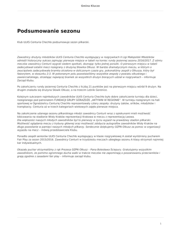 Gmina Klucze Podsumowanie sezonu Klub ULKS Centuria Chechło podsumowuje sezon piłkarski. Zawodnicy drużyny młodzików ULKS Centuria Chechło występujący w rozgrywkach II Ligi Małopolski Młodzików odnieśli historyczny sukces zajmując pierwsze miejsce w tabeli na koniec rundy jesiennej sezonu 2016/2017. Z ośmiu meczów zawodnicy Centurii wygrali siedem spotkań, doznając tylko jednej porażki. O pierwszym miejscu w tabeli zadecydował ostatni mecz rozegrany z drużyną Słowika Olkusz. W bardzo dramatycznym meczu, w którym o zwycięstwie zadecydowała bramka strzelona w doliczonym czasie gry, pokonaliśmy zespół z Olkusza, który był faworytem, w stosunku 2:3. W pokonanym polu pozostawiliśmy wszystkie zespoły z powiatu olkuskiego i zawierciańskiego, strzelając najwięcej bramek ze wszystkich drużyn biorących udział w rozgrywkach – informuje Zarząd Klubu. Po zakończeniu rundy jesiennej Centuria Chechło z liczbą 21 punktów jest na pierwszym miejscu wśród 9 drużyn. Na drugim znalazła się drużyna Słowik Olkusz, a na trzecim Leśnik Gorenice. Kolejnym sukcesem najmłodszych zawodników ULKS Centuria Chechło było dobre zakończenie turnieju dla dzieci, rozegranego pod patronatem FUNDACJI GRUPY GÓRAŻDŻE „AKTYWNI W REGIONIE”. W turnieju rozegranym na hali sportowej w Ogrodzieńcu Centurię Chechło reprezentowały cztery zespoły: drużyny żaków, orlików, młodzików i trampkarzy. Centuria aż w trzech kategoriach wiekowych zajęła pierwsze miejsca. Na zakończenie udanego sezonu piłkarskiego młodzi zawodnicy Centurii wraz z opiekunami mieli możliwość kibicowania na stadionie Wisły Kraków reprezentacji Krakowa w meczu z reprezentacją Lwowa. Dla większości naszych młodych zawodników był to pierwszy w życiu wyjazd na prawdziwy stadion piłkarski. Możliwość oglądania meczu z trybuny głównej oraz możliwość zdobycia autografów zawodników Wisły Kraków na długo pozostanie w pamięci naszych młodych piłkarzy. Serdecznie dziękujemy OZPN Olkusz za pomoc w organizacji wyjazdu na mecz – mówią przedstawiciele Klubu. Ponadto zespół seniorów ULKS Centuria Chechło występujący w klasie rozgrywkowej A został wyróżniony pucharem Fair Play za sezon 2015/2016. Zawodnicy Centurii w trzydziestu meczach ubiegłego sezonu A klasy otrzymali najmniej kar indywidualnych. Okazały puchar otrzymaliśmy z rąk Prezesa OZPN Olkusz – Pana Bolesława Ściepury. Gratulujemy wszystkim zawodnikom, że pomimo ogromnego ducha walki w trakcie meczów nie zapominają o poszanowaniu przeciwników i grają zgodnie z zasadami fair play – informuje zarząd klubu. 1