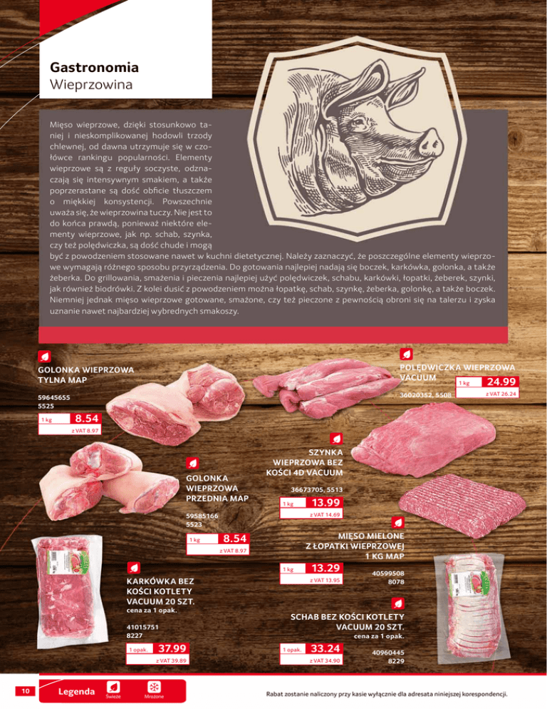 Gastronomia Wieprzowina Mięso wieprzowe, dzięki stosunkowo taniej i nieskomplikowanej hodowli trzody chlewnej, od dawna utrzymuje się w czołówce rankingu popularności. Elementy wieprzowe są z reguły soczyste, odznaczają się intensywnym smakiem, a także poprzerastane są dość obficie tłuszczem o miękkiej konsystencji. Powszechnie uważa się, że wieprzowina tuczy. Nie jest to do końca prawdą, ponieważ niektóre elementy wieprzowe, jak np. schab, szynka, czy też polędwiczka, są dość chude i mogą być z powodzeniem stosowane nawet w kuchni dietetycznej. Należy zaznaczyć, że poszczególne elementy wieprzowe wymagają różnego sposobu przyrządzenia. Do gotowania najlepiej nadają się boczek, karkówka, golonka, a także żeberka. Do grillowania, smażenia i pieczenia najlepiej użyć polędwiczek, schabu, karkówki, łopatki, żeberek, szynki, jak również biodrówki. Z kolei dusić z powodzeniem można łopatkę, schab, szynkę, żeberka, golonkę, a także boczek. Niemniej jednak mięso wieprzowe gotowane, smażone, czy też pieczone z pewnością obroni się na talerzu i zyska uznanie nawet najbardziej wybrednych smakoszy. GOLONKA WIEPRZOWA TYLNA MAP POLĘDWICZKA WIEPRZOWA VACUUM 59645655 5525 36020352, 5508 1 kg 1 kg 24.99 z VAT 26.24 8.54 z VAT 8.97 GOLONKA WIEPRZOWA PRZEDNIA MAP SZYNKA WIEPRZOWA BEZ KOŚCI 4D VACUUM 36673705, 5513 1 kg 1 kg MIĘSO MIELONE Z ŁOPATKI WIEPRZOWEJ 1 KG MAP 8.54 z VAT 8.97 1 kg KARKÓWKA BEZ KOŚCI KOTLETY VACUUM 20 SZT. cena za 1 opak. 41015751 8227 1 opak. 37.99 z VAT 39.89 10 Legenda Świeże Mrożone 13.99 z VAT 14.69 59585166 5523 13.29 z VAT 13.95 40599508 8078 SCHAB BEZ KOŚCI KOTLETY VACUUM 20 SZT. cena za 1 opak. 1 opak. 33.24 z VAT 34.90 40960445 8229 Rabat zostanie naliczony przy kasie wyłącznie dla adresata niniejszej korespondencji.