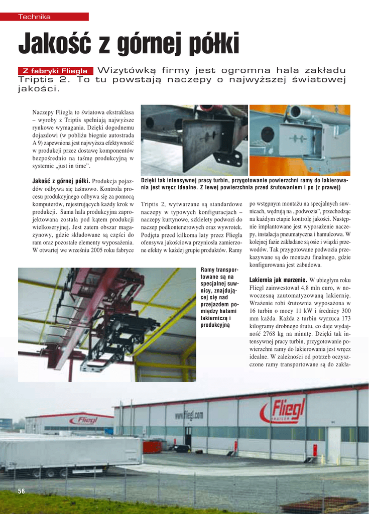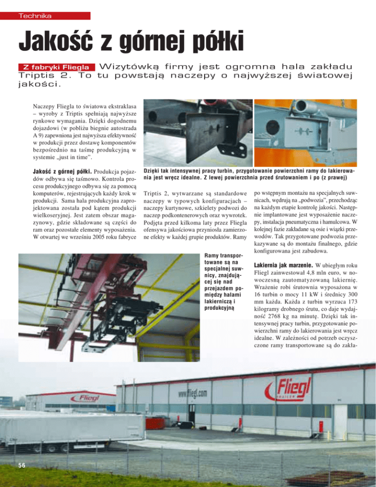 Technika Jakość z górnej półki Wizytówką firmy jest ogromna hala zakładu Triptis 2. To tu powstają naczepy o najwyższej światowej jakości. Z fabryki Fliegla Naczepy Fliegla to światowa ekstraklasa – wyroby z Triptis spełniają najwyższe rynkowe wymagania. Dzięki dogodnemu dojazdowi (w pobliżu biegnie autostrada A 9) zapewniona jest najwyższa efektywność w produkcji przez dostawę komponentów bezpośrednio na taśmę produkcyjną w systemie „just in time”. Jakość z górnej półki. Produkcja pojaz− dów odbywa się taśmowo. Kontrola pro− cesu produkcyjnego odbywa się za pomocą komputerów, rejestrujących każdy krok w produkcji. Sama hala produkcyjna zapro− jektowana została pod kątem produkcji wielkoseryjnej. Jest zatem obszar maga− zynowy, gdzie składowane są części do ram oraz pozostałe elementy wyposażenia. W otwartej we wrześniu 2005 roku fabryce Dzięki tak intensywnej pracy turbin, przygotowanie powierzchni ramy do lakierowa− nia jest wręcz idealne. Z lewej powierzchnia przed śrutowaniem i po (z prawej) Triptis 2, wytwarzane są standardowe naczepy w typowych konfiguracjach – naczepy kurtynowe, szkielety podwozi do naczep podkontenerowych oraz wywrotek. Podjęta przed kilkoma laty przez Fliegla ofensywa jakościowa przyniosła zamierzo− ne efekty w każdej grupie produktów. Ramy Ramy transpor− towane są na specjalnej suw− nicy, znajdują− cej się nad przejazdem po− między halami lakierniczą i produkcyjną 56 po wstępnym montażu na specjalnych suw− nicach, wędrują na „podwozia”, przechodząc na każdym etapie kontrolę jakości. Następ− nie implantowane jest wyposażenie nacze− py, instalacja pneumatyczna i hamulcowa. W kolejnej fazie zakładane są osie i wiązki prze− wodów. Tak przygotowane podwozia prze− kazywane są do montażu finalnego, gdzie konfigurowana jest zabudowa. Lakiernia jak marzenie. W ubiegłym roku Fliegl zainwestował 4,8 mln euro, w no− woczesną zautomatyzowaną lakiernię. Wrażenie robi śrutownia wyposażona w 16 turbin o mocy 11 kW i średnicy 300 mm każda. Każda z turbin wyrzuca 173 kilogramy drobnego śrutu, co daje wydaj− ność 2768 kg na minutę. Dzięki tak in− tensywnej pracy turbin, przygotowanie po− wierzchni ramy do lakierowania jest wręcz idealne. W zależności od potrzeb oczysz− czone ramy transportowane są do zakła− du Triptis 1, bądź lakierowane i transpor− towane na specjalnej suwnicy, znajdują− cej się nad przejazdem pomiędzy halami lakierniczą i produkcyjną do dalszego montażu. Ciekawostką jest system prze− jazdu pomiędzy halami, odbywający się dzięki uchylaniu ścian obydwu hal. Kon− strukcja przypomina „postawiony na gło− wie” most zwodzony. Całe urządzenie może być obsługiwane przez jedną osobę. Pełna kontrola. W zakładzie Triptis 1, będącym „protoplastą” nowoczesnej fabryki, dziś produkowane są pojazdy specjalistyczne – niskopodwoziowe, także z wysuwem teleskopowym i skrętnymi osiami, wywrotki specjalistyczne – podwozia podkontenerowe, przyczepy do przewozu maszyn budowlanych i rolniczych. Każdy pojazd posiada dokumen− tację (Produktionsauftrag) przechowywaną w firmie przez okres 10 lat. Każdy detal montażu Produkcja pojazdów odbywa się taśmowo a kontrola procesu produkcyjnego odbywa się za pomocą komputerów jest zapisany wraz z nazwiskiem osoby, która montażu dokonała. Ułatwia to kontrolę nad pro− dukcją i ewentualne postępowanie w przypad− ku reklamacji. Fliegl produkuje też, jako pod− wykonawca, specjalistyczne podwozia pod za− budowy, także dla uznanych na europej− skim rynku producentów naczep. W za− kładzie Triptis 1 w dwóch komorach od− bywa się lakierowanie metodą tradycyjną, manualnie. Jest to konieczne, przy różnych kształtach i wymiarach poszczególnych ele− mentów. Po lakierowaniu następuje mon− taż końcowy. Podczas naszej wizyty z za− kładzie odbywała się m. in. produkcja przy− czep do przewozu kontenerów przeznaczo− nych dla elektrowni jądrowej na Litwie. Innowacyjne wywrotki W drugiej połowie października w bawarskim To− eging miał miejsce dynamiczny pokaz nowych pojazdów firmy Fliegl (przyczep ASW i naczep ASS) o unikalnym, przesuwanym systemie rozładunku Fliegl Do trudnego terenu. Często zdarza się, że towary trzeba przewozić i rozładowy− wać na trudnych do manewrów terenach, o dużym kącie natarcia czy spadku. W ta− kich właśnie warunkach idealnie spraw− dza się technika Fliegla – przyczep i na− czep ASW i ASS. Ich stabilność gwarantuje niskie po− łożenie punktu ciężkości. W miejscach, gdzie klasyczna wywrotka może się wy− wrócić podczas rozładunku, ASW stoi pewnie. Mogliśmy się o tym przekonać podczas pokazu dynamicznego. W szranki stanęło kilka pojazdów o różnych konfiguracjach – przyczep, naczep o tradycyjnym, teleskopowym roz− ładunku oznaczonym we Flieglu jako Stone Master i tych z rozładunkiem przesuwnym ASW i ASS. Znalazł się również pojazd Iveco z zabudową ASW. Na specjalnie wykonanej górce pró− bowano rozładować Stone Mastera i Ive− co z zabudową ASW. Z próby tej zwy− cięsko wyszło Iveco bez problemu opróż− niając załadowaną do skrzyni ziemię. Niestety nie udało się to Stone Masterowi. Przy− czepa po lekkim uniesieniu skrzyni przechyliła się pod niebezpiecznym kątem i musiano zaniechać rozładunku. W innej z prób moż− Tu powstają nacze− py o najwyższej światowej jakości 57 57 Rynek zaczyna ożywać Rozmowa z Heribertem Gosebrinkiem, dyrektorem fir− my Fliegl, odpowiedzialnym za rynki Europy Środkowo− Wschodniej Truck Auto.pl: Jak ocenia pan sytuacje na rynkach Europy Środkowo−Wschodniej? Heribert Gosebrink: Obecna recesja utrzyma się jeszcze co najmniej przez pół roku. Najbliższe, zimowe miesiące nie przyniosą poprawy na rynku. Należy jednak spodzie− wać się już w lut