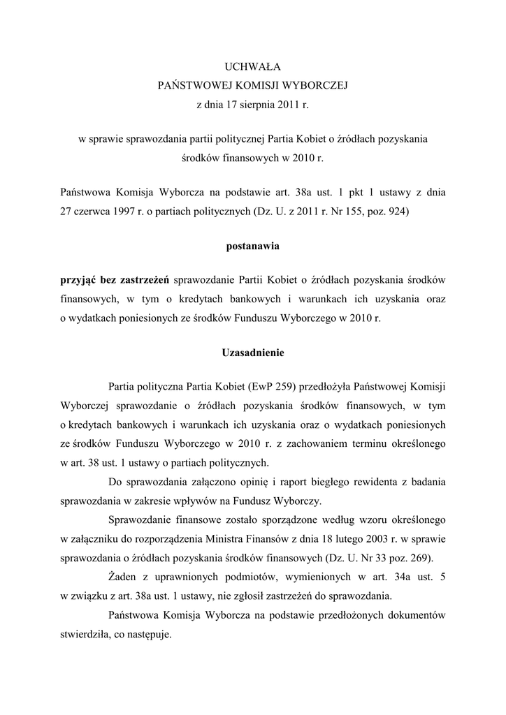 UCHWAŁA PAŃSTWOWEJ KOMISJI WYBORCZEJ z dnia 17 sierpnia 2011 r. w sprawie sprawozdania partii politycznej Partia Kobiet o źródłach pozyskania środków finansowych w 2010 r. Państwowa Komisja Wyborcza na podstawie art. 38a ust. 1 pkt 1 ustawy z dnia 27 czerwca 1997 r. o partiach politycznych (Dz. U. z 2011 r. Nr 155, poz. 924) postanawia przyjąć bez zastrzeżeń sprawozdanie Partii Kobiet o źródłach pozyskania środków finansowych, w tym o kredytach bankowych i warunkach ich uzyskania oraz o wydatkach poniesionych ze środków Funduszu Wyborczego w 2010 r. Uzasadnienie Partia polityczna Partia Kobiet (EwP 259) przedłożyła Państwowej Komisji Wyborczej sprawozdanie o źródłach pozyskania środków finansowych, w tym o kredytach bankowych i warunkach ich uzyskania oraz o wydatkach poniesionych ze środków Funduszu Wyborczego w 2010 r. z zachowaniem terminu określonego w art. 38 ust. 1 ustawy o partiach politycznych. Do sprawozdania załączono opinię i raport biegłego rewidenta z badania sprawozdania w zakresie wpływów na Fundusz Wyborczy. Sprawozdanie finansowe zostało sporządzone według wzoru określonego w załączniku do rozporządzenia Ministra Finansów z dnia 18 lutego 2003 r. w sprawie sprawozdania o źródłach pozyskania środków finansowych (Dz. U. Nr 33 poz. 269). Żaden z uprawnionych podmiotów, wymienionych w art. 34a ust. 5 w związku z art. 38a ust. 1 ustawy, nie zgłosił zastrzeżeń do sprawozdania. Państwowa Komisja Wyborcza na podstawie przedłożonych dokumentów stwierdziła, co następuje. 2 W sprawozdaniu o źródłach pozyskania środków finansowych (z wyłączeniem Funduszu Wyborczego) Partia wykazała, że w 2010 r. uzyskała przychody w łącznej kwocie 30 455 zł. Środki te były gromadzone na rachunku bankowym w ING Bank Śląski S.A. w Katowicach nr rach. 53 1050 1025 1000 0023 1754 9422. Oprócz powyższego Partia posiadała także rachunki pomocnicze na potrzeby swoich struktur regionalnych. Wpłaty na rzecz Partii były dokonywane z tytułu: − składek członkowskich w kwocie nieprzekraczającej od jednego wpłacającego w jednym roku minimalnego wynagrodzenia za pracę: 22 320 zł, − darowizn: 6 010 zł, − wpisowego: 2 125 zł. W związku z tym, że Partia nie załączyła do sprawozdania wykazu osób opłacających wpisowe, Państwowa Komisja Wyborcza w trybie art. 38a ust. 1 w związku z art. 34a ust. 2 ustawy zwróciła się do organu statutowego Partii o uzupełnienie tego braku, czemu Partia uczyniła zadość. Wpłaty dokonane na rachunek Partii były dokonywane przez obywateli polskich mających stałe miejsce zamieszkania na terenie Rzeczypospolitej Polskiej, mieszczą się w dopuszczalnym limicie wpłat od jednej osoby, określonym w art. 25 ust. 4 ustawy o partiach politycznych, a ich forma jest zgodna z określoną w art. 25 ust. 5 ustawy. Partia nie pozyskała w 2010 roku środków finansowych z innych źródeł ani wartości niepieniężnych. W okresie sprawozdawczym Partia Kobiet posiadała wyodrębniony rachunek Funduszu Wyborczego prowadzony przez ING Bank Śląski SA w Katowicach o numerze 33 1050 1025 1000 0023 2154 1720. Stan środków finansowych Funduszu Wyborczego w dniu 1 stycznia 2010 r. wynosił 5 108,32 zł. W 2010 r. na rachunku Funduszu Wyborczego odnotowano jedynie przychody pochodzące z odsetek od środków zgromadzonych na tym rachunku w kwocie 166,33 zł. Partia Kobiet w okresie sprawozdawczym nie poniosła żadnych wydatków z rachunku Funduszu Wyborczego. 3 Saldo rachunku Funduszu Wyborczego w dniu 31 grudnia 2010 r. wyniosło 5 274,65 zł. Państwowa Komisja Wyborcza, po ustaleniu powyższego na podstawie sprawozdania finansowego Partii, dokumentów do niego załączonych, opinii i raportu biegłego rewidenta oraz przedłożonych przez Partię wyjaśnień, postanowiła jak w sentencji. Od niniejszego postanowienia nie przysługuje środek prawny. Przewodniczący Państwowej Komisji Wyborczej: Stefan J. Jaworski Zastępcy Przewodniczącego Państwowej Komisji Wyborczej: Jan Kacprzak, Stanisław Kosmal Członkowie Państwowej Komisji Wyborczej: Andrzej Kisielewicz, Janusz Niemcewicz, Włodzimierz Ryms, Stanisław Zabłocki