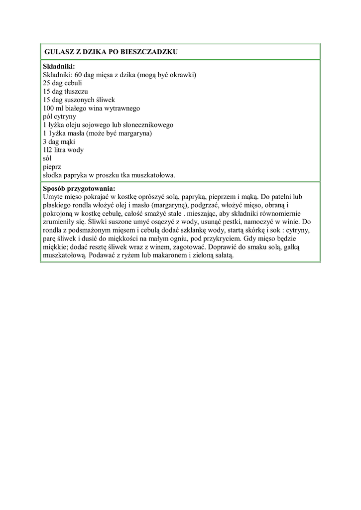GULASZ Z DZIKA PO BIESZCZADZKU Składniki: Składniki: 60 dag mięsa z dzika (mogą być okrawki) 25 dag cebuli 15 dag tłuszczu 15 dag suszonych śliwek 100 ml białego wina wytrawnego pól cytryny 1 łyżka oleju sojowego lub słonecznikowego 1 1yżka masła (może być margaryna) 3 dag mąki 1l2 litra wody sól pieprz słodka papryka w proszku tka muszkatołowa. Sposób przygotowania: Umyte mięso pokrajać w kostkę oprószyć solą, papryką, pieprzem i mąką. Do patelni lub płaskiego rondla włożyć olej i masło (margarynę), podgrzać, włożyć mięso, obraną i pokrojoną w kostkę cebulę, całość smażyć stale . mieszając, aby składniki równomiernie zrumieniły się. Śliwki suszone umyć osączyć z wody, usunąć pestki, namoczyć w winie. Do rondla z podsmażonym mięsem i cebulą dodać szklankę wody, startą skórkę i sok : cytryny, parę śliwek i dusić do miękkości na małym ogniu, pod przykryciem. Gdy mięso będzie miękkie; dodać resztę śliwek wraz z winem, zagotować. Doprawić do smaku solą, gałką muszkatołową. Podawać z ryżem lub makaronem i zieloną sałatą.