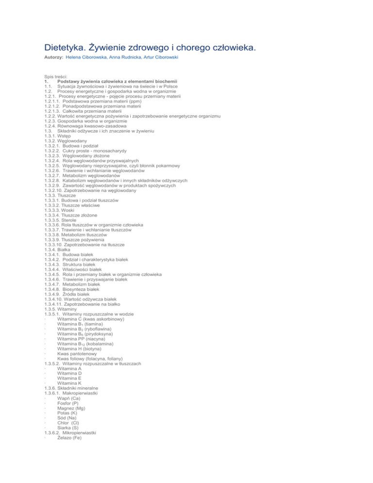 Dietetyka. Żywienie zdrowego i chorego człowieka. Autorzy: Helena Ciborowska, Anna Rudnicka, Artur Ciborowski Spis treści: 1. Podstawy żywienia człowieka z elementami biochemii 1.1. Sytuacja żywnościowa i żywieniowa na świecie i w Polsce 1.2. Procesy energetyczne i gospodarka wodna w organizmie 1.2.1. Procesy energetyczne - pojęcie procesu przemiany materii 1.2.1.1. Podstawowa przemiana materii (ppm) 1.2.1.2. Ponadpodstawowa przemiana materii 1.2.1.3. Całkowita przemiana materii 1.2.2. Wartość energetyczna pożywienia i zapotrzebowanie energetyczne organizmu 1.2.3. Gospodarka wodna w organizmie 1.2.4. Równowaga kwasowo-zasadowa 1.3. Składniki odżywcze i ich znaczenie w żywieniu 1.3.1. Wstęp 1.3.2. Węglowodany 1.3.2.1. Budowa i podział 1.3.2.2. Cukry proste - monosacharydy 1.3.2.3. Węglowodany złożone 1.3.2.4. Rola węglowodanów przyswajalnych 1.3.2.5. Węglowodany nieprzyswajalne, czyli błonnik pokarmowy 1.3.2.6. Trawienie i wchłanianie węglowodanów 1.3.2.7. Metabolizm węglowodanów 1.3.2.8. Katabolizm węglowodanów i innych składników odżywczych 1.3.2.9. Zawartość węglowodanów w produktach spożywczych 1.3.2.10. Zapotrzebowanie na węglowodany 1.3.3. Tłuszcze 1.3.3.1. Budowa i podział tłuszczów 1.3.3.2. Tłuszcze właściwe 1.3.3.3. Woski 1.3.3.4. Tłuszcze złożone 1.3.3.5. Sterole 1.3.3.6. Rola tłuszczów w organizmie człowieka 1.3.3.7. Trawienie i wchłanianie tłuszczów 1.3.3.8. Metabolizm tłuszczów 1.3.3.9. Tłuszcze pożywienia 1.3.3.10. Zapotrzebowanie na tłuszcze 1.3.4. Białka 1.3.4.1. Budowa białek 1.3.4.2. Podział i charakterystyka białek 1.3.4.3. Struktura białek 1.3.4.4. Właściwości białek 1.3.4.5. Rola i przemiany białek w organizmie człowieka 1.3.4.6. Trawienie i przyswajanie białek 1.3.4.7. Metabolizm białek 1.3.4.8. Biosynteza białek 1.3.4.9. Źródła białek 1.3.4.10. Wartość odżywcza białek 1.3.4.11. Zapotrzebowanie na białko 1.3.5. Witaminy 1.3.5.1. Witaminy rozpuszczalne w wodzie · Witamina C (kwas askorbinowy) · Witamina B1 (tiamina) · Witamina B2 (ryboflawina) · Witamina B6 (pirydoksyna) · Witamina PP (niacyna) · Witamina B12 (kobalamina) · Witamina H (biotyna) · Kwas pantotenowy · Kwas foliowy (folacyna, foliany) 1.3.5.2. Witaminy rozpuszczalne w tłuszczach · Witamina A · Witamina D · Witamina E · Witamina K 1.3.6. Składniki mineralne 1.3.6.1. Makropierwiastki · Wapń (Ca) · Fosfor (P) · Magnez (Mg) · Potas (K) · Sód (Na) · Chlor (Cl) · Siarka (S) 1.3.6.2. Mikropierwiastki · Żelazo (Fe) 1.4. Normy żywienia i wyżywienia 1.4.1. Pojęcie norm żywienia i wyżywienia 1.4.2. Podział produktów spożywczych 1.4.3. Charakterystyka wartości odżywczej 12 grup produktów spożywczych 1.4.4. Wskaźnik jakości żywieniowej 1.4.5. Produkty zamienne 1.5. Zasady planowania i oceny żywienia różnych grup ludności 1.5.1. Planowanie jadłospisów okresowych 1.5.2. Średnia norma żywienia i wyżywienia dla grupy mieszanej 1.5.3. Metody oceny jadłospisów 1.5.4. Zasady żywienia różnych grup ludności 1.5.5. Metody oceny stanu odżywienia społeczeństwa 1.6. Żywność funkcjonalna 1.6.1. Probiotyki i prebiotyki 1.6.2. Synbiotyki 1.7. Żywność genetycznie modyfikowana 1.8. Nutrigenomika - żywienie a genom człowieka 1.9. Bezpieczeństwo i higiena żywności w świetle ustawodawstwa 1.10.Edukacja żywieniowa 2. Klasyfikacja i charakterystyka diet 2.1. Podstawy klasyfikacji diet 2.2. Dieta podstawowa 2.3. Dieta bogatoresztkowa 2.4. Dieta łatwo strawna 2.5. Dieta łatwo strawna z ograniczeniem tłuszczu 2.6. Dieta łatwo strawna z ograniczeniem substancji pobudzających wydzielanie soku żołądkowego 2.7. Dieta o zmienionej konsystencji 2.7.1. Dieta papkowata 2.7.2. Dieta płynna 2.7.3. Dieta płynna wzmocniona 2.7.4. Dieta do żywienia przez zgłębnik lub przetokę 2.7.5. Dieta kleikowa 2.8. Dieta ubogoenegetyczna 2.9. Dieta o kontrolowanej zawartości kwasów tłuszczowych 2.10.Dieta łatwo strawna bogato białkowa 2.11.Dieta z ograniczeniem łatwo przyswajalnych węglowodanów 2.12.Dieta łatwo strawna niskobiałkowa 2.13.Praktyczne wdrażanie klasyfikacji diet zalecanej przez Instytut Żywności i Żywienia 3. Żywienie w wybranych chorobach 3.1. Żywienie dietetyczne w chorobach układu pokarmowego 3.1.1. Żywienie w chorobach układu pokarmowego 3.1.1.1. Żywienie w chorobie refluksowej 3.1.2. Żywienie w nieżytach żołądka · Ostry nieżyt żołądka · Przewlekły nieżyt żołądka 3.1.3. Żywienie w chorobie wrzodowej żołądka i dwunastnicy 3.1.4. Żywienie w chorobach jelita cienkiego i grubego · Żywienie w ostrym nieżycie jelit · Żywienie w przewlekłym nieżycie jelit · Żywienie w zaparciu nawykowym · Żywienie we wrzodziejącym zapaleniu jelita grubego · Żywienie w chorobie Leśniowskiego-Crohna · Żywienie w zespole nadwrażliwości jelita grubego 3.1.5. Żywienie w chorobach miąższu wątroby · Żywienie w przewlekłych chorobach wątroby bez cech encefalopatii · Żywienie w okresie niewyrównywania niewydolności wątroby – encefalopatia wątrobowa 3.1.6. Żywienie w zapaleniu pęcherzyka żółciowego i dróg żółciowych · Ostre zapalenie pęcherzyka żółciowego · Przewlekłe zapalenie pęcherzyka żółciowego i dróg żółciowych 3.1.7. Żywienie w kamicy żółciowej 3.1.8. Żywienie w zapaleniu trzustki · Ostre zapalenie trzustki · Przewlekłe zapalenie trzustki 3.2. Żywienie po zabiegach chirurgicznych 3.3. Leczenie żywieniowe 3.4. Żywienie dietetyczne w chorobach układu moczowego 3.4.1. Żywienie w zapaleniu kłębuszków nerkowych · Ostre kłębuszkowe zapalenie nerek · Żywienie w przewlekłym kłębuszkowym zapaleniu nerek 3.4.2. Żywienie w niewydolności nerek · Ostra niewydolność nerek · Przewlekła niewydolność nerek · Zalecenia żywieniowe dla pacjentów z przewlekłą niewydolnością nerek w okresie dializacyjnym · Żywienie w nefropatii cukrzycowej · Żywienie po przeszczepie nerki 3.4.3. Żywieni