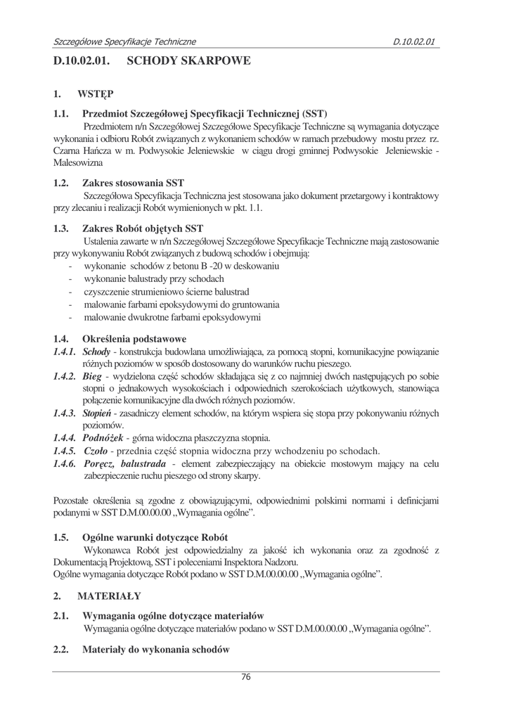 D.10.02.01. 1. SCHODY SKARPOWE WST P 1.1. Przedmiot Szczegółowej Specyfikacji Technicznej (SST) Przedmiotem n/n Szczegółowej Szczegółowe Specyfikacje Techniczne s wymagania dotycz ce wykonania i odbioru Robót zwi zanych z wykonaniem schodów w ramach przebudowy mostu przez rz. Czarna Ha cza w m. Podwysokie Jeleniewskie w ci gu drogi gminnej Podwysokie Jeleniewskie Malesowizna 1.2. Zakres stosowania SST Szczegółowa Specyfikacja Techniczna jest stosowana jako dokument przetargowy i kontraktowy przy zlecaniu i realizacji Robót wymienionych w pkt. 1.1. 1.3. Zakres Robót obj tych SST Ustalenia zawarte w n/n Szczegółowej Szczegółowe Specyfikacje Techniczne maj zastosowanie przy wykonywaniu Robót zwi zanych z budow schodów i obejmuj : - wykonanie schodów z betonu B -20 w deskowaniu - wykonanie balustrady przy schodach - czyszczenie strumieniowo cierne balustrad - malowanie farbami epoksydowymi do gruntowania - malowanie dwukrotne farbami epoksydowymi 1.4. Okre lenia podstawowe 1.4.1. Schody - konstrukcja budowlana umo liwiaj ca, za pomoc stopni, komunikacyjne powi zanie ró nych poziomów w sposób dostosowany do warunków ruchu pieszego. 1.4.2. Bieg - wydzielona cz schodów składaj ca si z co najmniej dwóch nast puj cych po sobie stopni o jednakowych wysoko ciach i odpowiednich szeroko ciach u ytkowych, stanowi ca poł czenie komunikacyjne dla dwóch ró nych poziomów. 1.4.3. Stopie - zasadniczy element schodów, na którym wspiera si stopa przy pokonywaniu ró nych poziomów. 1.4.4. Podnó ek - górna widoczna płaszczyzna stopnia. 1.4.5. Czoło - przednia cz stopnia widoczna przy wchodzeniu po schodach. 1.4.6. Por cz, balustrada - element zabezpieczaj cy na obiekcie mostowym maj cy na celu zabezpieczenie ruchu pieszego od strony skarpy. Pozostałe okre lenia s zgodne z obowi zuj cymi, odpowiednimi polskimi normami i definicjami podanymi w SST D.M.00.00.00 „Wymagania ogólne”. 1.5. Ogólne warunki dotycz ce Robót Wykonawca Robót jest odpowiedzialny za jako ich wykonania oraz za zgodno Dokumentacj Projektow , SST i poleceniami Inspektora Nadzoru. Ogólne wymagania dotycz ce Robót podano w SST D.M.00.00.00 „Wymagania ogólne”. 2. MATERIAŁY 2.1. Wymagania ogólne dotycz ce materiałów Wymagania ogólne dotycz ce materiałów podano w SST D.M.00.00.00 „Wymagania ogólne”. 2.2. Materiały do wykonania schodów z Materiałami do wykonania schodów zgodnie z zasadami n/n Szczegółowej Szczegółowe Specyfikacje Techniczne s : - stopnie z betonu B20 2.2.1. Zaprawa cementowa Zaprawa cementowa powinna spełnia wymagania podane w PN-B-14501 [4]. 2.2.2. Kruszywo Zastosowane kruszywo powinno spełnia wymagania PN-B-11111 [2] i PN-B-11113 [3]. 2.2.3. Materiały na balustrady Materiały do wykonania por czy powinny odpowiada wymaganiom nast puj cych norm: a) rury stalowe bez szwu na por cze i słupki ∅ 57/3,2mm i 38/3,2mm- PN-H-74219, PN-H74220, Materiały na balustrady powinny by zabezpieczone powłokami malarskimi. 2.2.4. Materiały do wykonania zabezpieczenia antykorozyjnego Materiały stosowane do wykonania zabezpieczenia antykorozyjnego winny posiada wa n aprobat techniczn IBDiM. • Zestaw farb - farby z aprobat IBDiM , ł czna grubo warstw farby podkładowej i nawierzchniowej winna wynosi min. 250 µm. 3. 3.1. SPRZ T Wymagania ogólne dotycz ce sprz tu Wymagania ogólne dotycz ce sprz tu podano w SST D.M.00.00.00 „Wymagania ogólne”. 3.2. Sprz t do budowy schodów Ze wzgl du na niewielki zakres Robót, prace przy budowie schodów powinny by wykonywane r cznie, przy u yciu drobnego sprz tu pomocniczego. Przy wykonywaniu schodów mo na stosowa ubijaki, wibratory płytowe i inne zaakceptowane przez Inspektora Nadzoru urz dzenia. 4. 4.1. TRANSPORT Wymagania ogólne dla transportu Wymagania ogólne dla transportu podano w SST D.M.00.00.00 „Wymagania ogólne”. 4.2. Transport kruszywa Transport kruszywa powinien odbywa si w warunkach zabezpieczaj cych je przed zanieczyszczeniem i zmieszaniem z innymi asortymentami kruszywa lub jego frakcjami. 4.3. Transport materiałów na balustrady Materiały na balustrady mo na przewozi dowolnymi rodkami transportu w warunkach zabezpieczaj cych je przed korozj , uszkodzeniami i pomieszaniem. 5. WYKONANIE ROBÓT 5.1. Ogólne zasady wykonywania Robót Ogólne zasady wykonywania Robót podano w SST D.M.00.00.00 „Wymagania ogólne”. Wykonawca przedstawi Inspektorowi Nadzoru do akceptacji projekt organizacji i harmonogram Robót, uwzgl dniaj ce warunki, w jakich wykonywane b d Roboty zwi zane z budow schodów. 5.2. Monta balustrad Balustrady nale y wykona w warsztacie. Nale y je zabezpieczy antykorozyjnie zgodnie z zasadami zabezpieczenia antykorozyjnego konstrukcji stalowych i uwag zawartych w n\n SST. Słupki balustrad nale y zamocowa w betonowanym fundamencie . Po wykonaniu monta u, uszkodzone fragmenty powłoki antykorozyjnej nale y zabezpieczy farb gruntuj c i mi dzywarstwow , a nast pnie cało pomalowa farb nawierzchniow . − Kolorystyka powinna by uzgodniona z Inwestorem Nadzoru. Szczegóły konstrukcyjne zamieszczono w Dokumentacji Projektowej. 6. KONTROLA JAKO CI ROBÓT 6.1. Ogólne zasady kontroli jako ci Robót Ogólne zasady kontroli jako ci Robót podano w SST D.M.00.00.00 „Wymagania ogólne”. 6.2. Kontrola przed przyst pieniem do Robót Przed przyst pieniem do Robót Wykonawca powinien uzyska od producentów za wiadczenia o jako ci (aprobaty techniczne) oraz wykona badania materiałów przeznaczonych do wykonania Robót i przedstawi ich wyniki Inspektorowi Nadzoru w celu akceptacji materiałów. 6.3. Kontrola w trakcie i po wykonaniu Robót 6.3.1. Kontrola prawidłowo ci wykonania schodów Kontrola wykonania schodów polega na sprawdzeniu zgodno ci z wymaganiami podanymi w Dokumentacji Projektowej - na podstawie ogl dzin i pomiarów. 6.3.2. Badania wykonywania balustrad Materiały dostarczone na budow do wykonania balustrad z za wiadczeniem o jako ci (aprobat ) producenta powinny by sprawdzone w zakresie 