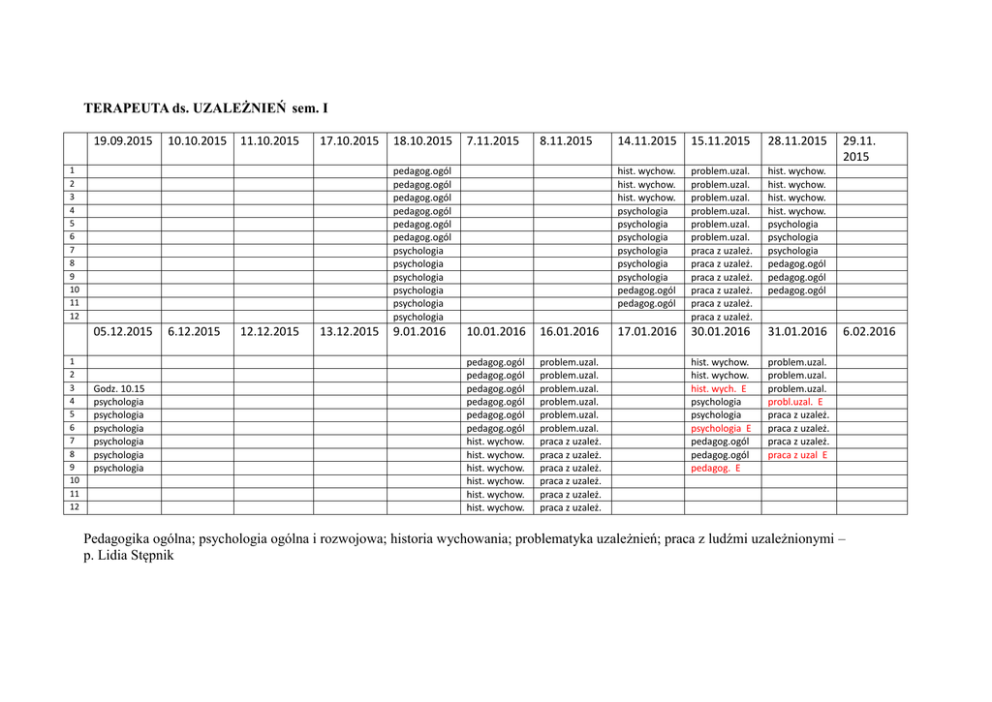 TERAPEUTA ds. UZALEŻNIEŃ sem. I 19.09.2015 10.10.2015 11.10.2015 17.10.2015 1 2 3 4 5 6 7 8 9 10 11 12 7.11.2015 8.11.2015 pedagog.ogól pedagog.ogól pedagog.ogól pedagog.ogól pedagog.ogól pedagog.ogól psychologia psychologia psychologia psychologia psychologia psychologia 05.12.2015 1 2 3 4 5 6 7 8 9 10 11 12 18.10.2015 Godz. 10.15 psychologia psychologia psychologia psychologia psychologia psychologia 6.12.2015 12.12.2015 13.12.2015 9.01.2016 10.01.2016 16.01.2016 pedagog.ogól pedagog.ogól pedagog.ogól pedagog.ogól pedagog.ogól pedagog.ogól hist. wychow. hist. wychow. hist. wychow. hist. wychow. hist. wychow. hist. wychow. problem.uzal. problem.uzal. problem.uzal. problem.uzal. problem.uzal. problem.uzal. praca z uzależ. praca z uzależ. praca z uzależ. praca z uzależ. praca z uzależ. praca z uzależ. 14.11.2015 15.11.2015 28.11.2015 hist. wychow. hist. wychow. hist. wychow. psychologia psychologia psychologia psychologia psychologia psychologia pedagog.ogól pedagog.ogól problem.uzal. problem.uzal. problem.uzal. problem.uzal. problem.uzal. problem.uzal. praca z uzależ. praca z uzależ. praca z uzależ. praca z uzależ. praca z uzależ. praca z uzależ. hist. wychow. hist. wychow. hist. wychow. hist. wychow. psychologia psychologia psychologia pedagog.ogól pedagog.ogól pedagog.ogól 17.01.2016 30.01.2016 31.01.2016 hist. wychow. hist. wychow. hist. wych. E psychologia psychologia psychologia E pedagog.ogól pedagog.ogól pedagog. E problem.uzal. problem.uzal. problem.uzal. probl.uzal. E praca z uzależ. praca z uzależ. praca z uzależ. praca z uzal E 29.11. 2015 6.02.2016 Pedagogika ogólna; psychologia ogólna i rozwojowa; historia wychowania; problematyka uzależnień; praca z ludźmi uzależnionymi – p. Lidia Stępnik