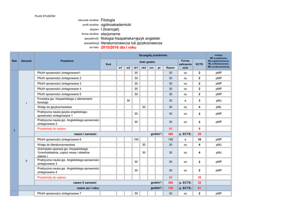 PLAN STUDIÓW kierunek studiów: profil studiów: stopień: forma studiów: specjalność: specjalizacja od roku: Filologia ogólnoakademicki I (licencjat) stacjonarne filologia hiszpańska+język angielski literaturoznawcza lub językoznawcza 2015/2016 dla I roku Szczegóły przedmiotu Rok Semestr Przedmiot Kod w1 I w2 ck1 ck2 cm pr PNJH sprawności zintegrowane1 30 30 oc 2 pMP PNJH sprawności zintegrowane 2 30 30 oc 2 pMP PNJH sprawności zintegrowane 3 30 30 oc 2 pMP PNJH sprawności zintegrowane 4 30 30 oc 2 pMP PNJH sprawności zintegrowane 5 30 30 oc 2 pMP 30 e 3 pMJ 30 oc 4 pML Fonetyka jęz. hiszpańskiego z elementami fonologii 30 Wstęp do językoznawstwa 30 Praktyczna nauka języka angielskiegosprawności zintegrowane 1 30 30 oc 2 pMP Praktyczna nauka jęz. Angielskiego-sprawności zintegrowane 2 30 30 oc 2 pMP Przedmioty do wyboru I 90 godzin*: razem I semestr: PNJH sprawności zintegrowane 6 II ECTS Razem Forma zaliczenia oc/e ilość godzin moduły: MP-z.praktyczne, MJ-z.językoznawcze, ML-z.literaturoznaw, MK-z.kulturoznawcze Wstęp do literaturoznawstwa Gramatyka opisowa jęz. hiszpańskiego 1(morfoskładnia, części mowy i składnia zdania.) Praktyczna nauka jęz. Angielskiego-sprawności zintegrowane 3 Praktyczna nauka jęz. Angielskiego-sprawności zintegrowane 4 8 360 p. ECTS: 29 150 e 10 pMP 30 30 oc 4 pMJ 30 30 oc 4 pMJ 30 30 oc 2 pMP 30 30 oc 2 pMP 150 Przedmioty do wyboru 90 razem II semestr: razem po I roku: PNJH sprawności zintegrowane 7 30 10 godzin*: 360 p. ECTS: 32 godzin*: 720 p. ECTS: 61 30 oc 2 pMP III PNJH sprawności zintegrowane 8 30 30 oc 2 pMP PNJH sprawności zintegrowane 9 30 30 oc 2 pMP PNJH sprawności zintegrowane 10 30 30 oc 2 pMP 30 oc 4 pMJ 30 e 3 pMJ 60 oc 4 pML 30 oc 2 pMP Gramatyka opisowa języka hiszpańskiego 2 30 Wstęp do leksykologii języka hiszpańskiego Historia literatury hiszpańskiej 1 30 60 Praktyczna nauka języka angielskiego 3 30 Przedmioty do wyboru II godzin*: razem III semestr: PNJH sprawności zintegrowane 11 120 pMP 30 oc 4 pMJ 60 e 4 pML 30 oc 2 pMP Przedmioty do wyboru ( B) 60 oc 5 pMW Przedmioty do wyboru 120 30 60 Praktyczna nauka jęz. Angielskiego-sprawności zintegrowane 5 30 razem po II roku : 7 godzin*: 420 p. ECTS: 30 godzin*: 840 p. ECTS: 60 PNJH sprawności zintegrowane 12 30 30 oc 2 PNJH sprawności zintegrowane 13 30 30 oc 2 PNJH sprawności zintegrowane 14 30 30 oc 2 PNJH sprawności zintegrowane 15 30 30 oc 2 pMP Gramatyka kontrastywna hiszp. - pol. 30 30 e 3 pMJ Historia literatury hispanoamerykańskiej 1 30 30 oc 3 pML 30 oc 2 pMU 30 oc 2 pMJ 30 e 4 pMP 30 oc 2 pML 30 oc 3 pMJ 30 oc 4 pMSJ/pMSL 360 p. ECTS: 31 120 e 8 pMP 30 oc 2 pMJ Podstawy dydaktyki jęz. hiszpańskiego 30 Teoretyczne podstawy traduktologii 30 Praktyczna nauka jęz. Angielskiego-sprawności zintegrowane 5 Wstęp do literatury autorów pochodzenia latynoskiego w USA 30 30 Gramatyka kontrastywna ang. - hiszp. 30 Przedmioty modułu specjalizacyjnego godzin*: razem V semestr: PNJH sprawności zintegrowane 16 Historia jęz. hiszpańskiego z elementami gramatyki historycznej VI 30 8 razem IV semestr: III 420 e Historia literatury hiszpańskiej 2 V 9 120 Gramatyka opisowa języka hiszpańskiego 3 IV 150 120 30 Historia literatury hispanoamerykańskiej 2 VI Praktyczna nauka jęz. Angielskiego-sprawności zintegrowane 6 Przedmioty do wyboru ( praktyki zawodowe)* 30 30 e 3 pML 30 oc 4 pMP 120 oc 4 pMP 30 oc 8 pMSJ/pMSL godzin*: 360 p. ECTS: 29 godzin*: 720 p. ECTS: 60 2280 p. ECTS: 181 30 120 Przedmioty modułu specjalizacyjnego razem VI semestr: razem po III roku : RAZEM W CIĄGU TOKU STUDIÓW: godzin**: Rok Semestr na którym można realizować Przedmioty ruchome grupy OBOWIĄZKOWEJ (AR, przedmiot B,C) (zaznaczony (Wszystkie przedmioty są wymagane do zakończenia studiów) jest sem preferowanym ) Szczegóły przedmiotu ilość godzin KOD Forma zaliczenia w1 w2 ck1 ck2 wr cm pr Wybór ogólnouczelniany ( C ) 30 3 pMW 1,2,3,4,5,6 Przedmioty do wyboru (B) 60 5 pMW WF 30 30 oc 1 pMW 1,3 Kultura i cywilizacja Hiszpanii 1 30 30 oc 2 pMK 2,4 Kultura i cywilizacja Hiszpanii 2 30 30 oc 2 pMK 1,3 Historia Hiszpanii 30 30 e 3 pMK 1,3 Historia filozofii 1 30 30 oc 3 pMK 2,4 Historia filozofii 2 30 30 e 3 pMK 2,4 Wstęp do historii i kultury USA 30 30 oc 2 pMK 3,5 Historia i kultura USA 30 30 oc 2 pMK 3,5 Kultura i cywilizacja Ameryki Łacińskiej 1 30 30 oc 2 pMK 4,6 Kultura i cywilizacja Ameryki Łacińskiej 2 30 e 3 pMK 3,5 Metodyka nauczania i gramatyka pedagogiczna języka angielskiego 1 30 30 oc 2 pMU 4,6 Metodyka nauczania i gramatyka pedagogiczna języka angielskiego 1 30 30 oc 2 3,5 Łacina 1 30 30 oc 2 4,6 Łacina 2 30 30 oc 2 30 RAZEM W CIĄGU TOKU STUDIÓW: III ECTS Razem 1,2,3,4,5,6 1, 2,3,4 Rok WF moduły: MP-z.praktyczne, MJ-z.językoznawcze, ML-z.literaturoznaw, MK-z.kulturoznawcze, MU-z.ogólnouczeln. Semestr na Przedmioty modułu specjalizacyjnego (MSJ): którym można realizować specjalizacja przedmiot JĘZYKOZNAWCZA (S) (zaznaczony (Wszystkie przedmioty są wymagane do zakończenia studiów) jest sem godzin: Szczegóły przedmiotu KOD ilość godzin s Razem Forma zaliczenia ECTS moduły: MS-m.specjalizacyjne: J-z.językoznawcze 5 Seminarium licencjackie 1 30 30 oc 4 pMSJ 6 Seminarium licencjackie 2 30 30 oc 1 pMSJ 6 Egzamin licencjacki 2 6 Praca licencjacka 5 RAZEM W CIĄGU TOKU STUDIÓW: godzin: 60 510 p. ECTS: 12 p. ECTS: 39 pMP Rok III Semestr na którym można Przedmioty modułu specjalizacyjnego (MSL): realizować specjalizacja przedmiot LITERATUROZNAWCZA (S) (zaznaczony (Wszystkie przedmioty są wymagane do zakończenia studiów) jest sem preferowanym Szczegóły przedmiotu KOD ilość godzin s Razem ECTS Forma zaliczenia moduły: MS-m.specjalizacyjne: K-z.kulturoznawcze Lliteraturoznawcze J 5 Seminarium licencjackie 1 30 30 oc 4 pMSL 6 Seminarium licencjackie 2 30 30 oc 1 pMSL 6 Egzamin licencjacki 2 6 Praca licencjacka 5 RAZEM W CIĄGU TOKU STUDIÓW: godzin: 60 p. ECTS: 12 *Przedmiot realizowany w dowolnym semestrze. Wpi