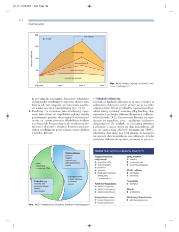 R_14 31.08.2011 15:06 Page 112 112 Kosmeceutyki 200 faza regresji † p < 0,01 † Wskaźnik nawilżania 150 † krem kontrolny C 100 † krem kontrolny B krem kontrolny A 50 kontrola bez leczenia 0 Wyjściowo Dzień 1 Dzień 4 (z zewnàtrz do wewnàtrz). Połàczenie składników okluzyjnych i nawil˝ajàcych zapewnia zło˝one działanie w zakresie osiàgania i utrzymywania nawil˝enia naskórkowego i funkcji bariery (ryc. 14.3). ❖ Emolienty (tu rozumiane jako nawil˝acze), opisywane jako zdolne do wypełniania p´kni´ç mi´dzy przerwanymi grupami złuszczajàcych si´ keratynocytów, sà trzecim głównym składnikiem Êrodków nawil˝ajàcych. Przyczyniajà si´ do zwi´kszenia skutecznoÊci klinicznej i elegancji kosmetycznej produktu nawil˝ajàcego przez nadanie skórze gładkiej i mi´kkiej faktury. bariera naskórkowa → zmniejszona TEWL Efekt okluzyjny wazelina żółta pochodne silikonu lanolina olej mineralny Efekt nawilżający gliceryna mocznik mleczan sodu glikol propylenowy sorbitol przyciąganie wody ze skóry właściwej do warstwy rogowej Ryc. 14.3 Podstawowe składniki środków nawilżających Dzień 7 Ryc. 14.2 Analiza regresji wybranych kremów nawilżających • Składniki okluzyjne Czynniki o działaniu okluzyjnym sà cz´sto tłuste i sà najbardziej efektywne, kiedy stosuje si´ je na lekko wilgotnà skór´. WÊród przykładów tego rodzaju składników nale˝y wymieniç: wazelin´ ˝ółtà, lanolin´, oleje mineralne i pochodne silikonu (dimetykon, cyklometykon) (ramka 14.2). Zastosowanie lanoliny jest ograniczone jej zapachem, cenà i mo˝liwym działaniem alergizujàcym. Ze wzgl´du na korzystnà struktur´ („odczucia”), cz´sto u˝ywa si´ oleju mineralnego, ale ma on ograniczonà zdolnoÊç zmniejszania TEWL. OkreÊlenie „bez oleju” (oil free) oznacza, ˝e kosmetyk nie zawiera oleju mineralnego ani roÊlinnego. Z kolei pochodne silikonu nie sà tłuste, a stosowane pojedyn- Ramka 14.2 Czynniki o działaniu okluzyjnym Węglowodorowe oleje/woski ❖ wazelina żółta ❖ olej mineralny ❖ parafina ❖ skwalen ❖ pochodne silikonu: dimetykon cyklometykon Alkohole tłuszczowe ❖ alkohol cetylowy ❖ alkohol stearylowy ❖ alkohol lanolinowy Kwasy tłuszczowe ❖ kwas stearynowy ❖ kwas lanolinowy Estry wosków ❖ lanolina ❖ wosk pszczeli ❖ stearynian stearylu Woski roślinne ❖ karnauba ❖ kandelilla Fosfolipidy ❖ lecytyna Sterole ❖ cholesterol Alkohole poliwodorowe ❖ glikol propylenowy