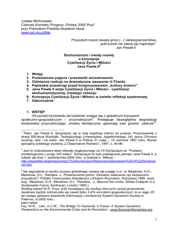 Lesław Michnowski Członek Komitetu Prognoz „Polska 2000 Plus” przy Prezydium Polskiej Akademii Nauk www.psl.org.pl/kte Przyszłym losom świata grozi (...) niebezpieczeństwo, jeśli ludzie nie staną się mądrzejsi1. Jan Paweł II Ekohumanizm i trwały rozwój a koncepcja Cywilizacji Życia i Miłości Jana Pawła II2 1. 2. 3. 4. 5. Wstęp Podstawowe pojęcia i przesłanki wnioskowania Odmienne reakcje na dramatyczne wezwanie U-Thanta Papieskie przestrogi przed kontynuowaniem „kultury śmierci” Jana Pawła II wizja Cywilizacji Życia i Miłości - cywilizacji ekohumanistycznej, trwałego rozwoju 6. Koncepcja Cywilizacji Życia i Miłości w świetle refleksji systemowej 7. Zakończenie 1. WSTĘP Od ponad trzydziestu lat ludzkość zmaga się z globalnym kryzysem: społeczno-gospodarczym i przyrodniczym3. Postępuje bezwględna degradacja środowiska przyrodniczego, zmiany klimatyczne ujawniają swe groźne „oblicze”4. 1 Patrz: Jan Paweł II, Spotykamy się w imię wspólnej miłości do prawdy, Przemówienie z okazji 600-lecia Wydziału Teologicznego Uniwersytetu Jagiellońskiego, (w) Jezus Chrystus wczoraj, dziś i na wieki, Jan Paweł II w Polsce 31 maja – 10 czerwca 1997 roku, Numer specjalny polskiego wydania „L’Osservatore Romano”, 1997, s. 94-96. 2 Jest to rozbudowany tekst referatu wygłoszonego na VII Sympozjum pt. "Postawy proekologiczne u progu XXI wieku". Sympozjum to było poświęcone pamięci Jana Pawła II, a odbyło się dnia 1. października 2005 roku. w Sułowie k. Milicza http://republika.pl/gimnazjumisp/7%20sympozjum/Ramowy%20program%20VII%20Sympozj um.doc 3 Na zagrożenia w wyniku kryzysu globalnego zwraca się uwagę m.in. w: Meadows, D.H., Meadows, D.L., Randers, J., Przekraczanie granic. Globalne załamanie czy bezpieczna przyszłość?, Polskie Towarzystwo Współpracy z Klubem Rzymskim, Warszawa 1995. (wyd. ang.: Meadows, D.H., Meadows, D.L., Randers, J., Beyond the Limits, Global Collapse or a Sustainable Future, Earthscan, London 1993.) Według badań W.R. Feya: jeśli rozwijająca się według obecnych zasad gospodarka światowa będzie odznaczała się nawet tylko 3-4% wzrostem gospodarczym, to w ciągu 25 lat nastąpi globalna katastrofa (informacja z konferencji System Dynamics Society w Palermo, w 2002 roku.; patrz także: Fey, W.R., Lam, A.C.W., The Bridge To Humanity 's Future: A System Dynamics Perspective on the Environmental Crisis and its Resolution - www.EcocosmDynamics.org 1 Szybciej wyczerpujemy źródła zasobów naturalnych, aniżeli zapewniamy dostęp do alternatywnych ich źródeł5. Narasta społeczne rozwarstwienie. Wzrasta zagrożenia obronnym terroryzmem i wojną o dostęp do deficytowych zasobów życia – naturalnych i przyrodniczych.. Nasilają się inne zachowania patologiczne. W Polsce obserwujemy radykalnie odmienne, od dobroczynnych zapowiadanych w 1989 roku przez liberalnych polityków - skutki systemowej transformacji „do normalności”6. Kryzys ten jest skutkiem niedostosowania światowej społeczności do życia wspomaganego wysoko rozwiniętą nauką i techniką. Jest on głównie skutkiem braku możliwości eliminowania negatywnych następstw szybko, wraz z rozwojem naukowotechnicznym, postępującej moralnej degradacji dotychczasowych form życia - już niezgodnych z nowymi jego uwarunkowaniami. O ile generalnie uznaliśmy już konieczność ochrony środowiska przyrodniczego, jako warunku przetrwania Ludzkości, o tyle teza - iż dla jej życia i trwałego rozwoju niezbędna jest także ochrona środowiska społecznego wysoko już rozwiniętej części światowej społeczności - wydaje się nie być wciąż powszechnie akceptowaną.. Obserwujemy zatem obecnie dwie jakościowo odmienne koncepcje przezwyciężania tego kryzysu. Pierwsza z nich - ewidentnie wciąż jeszcze dominująca, socjal-darwinistyczna, liberalna - to koncepcja ochrony środowiska przyrodniczego kosztem słabszej części światowej społeczności. Polega ona na stymulowaniu bezrobocia, obniżaniu poziomu konsumpcji i zdolności obronnych, a nawet na fizycznym eliminowaniu słabszych konkurentów do deficytowych zasobów. Jest ona oparta na zasadzie „wzrostu silnych kosztem ich słabszego społecznego środowiska7”.. Podstawę tej liberalnej koncepcji stanowi – moim zdaniem - fałszywe przekonanie, iż Ziemia jest „przeciążona” nadmierną ilością ludzi, których znaczna 4 Według Raportu Pentagonu, zmiany klimatyczne jakie mogą zajść w świecie w ciągu najbliższych 20 lat stanowią większe zagrożenie niż terroryzm. Patrz: Now the Pentagon tells Bush: climate change will destroy us http://observer.guardian.co.uk/international/story/0,6903,1153513,00.html . 5 Na zagrożenie dla środowiska przyrodniczego, jakie stanowi wzrost gospodarczy Chin realizowany w oparciu o technologie odznaczające się wysokim stopniem degradacji środowiska zwraca się uwagę w: Brown, L. R., Eco-Economy: Building an Economy for the Earth, W. W. Norton & Co., New York 2001. 6 Słynny strajk w Stoczni Gdańskiej, w 1980 roku, którego następstwem stała się zmiana systemu politycznego i społeczno-gospodarczego Polski dokonywany był pod hasłem (autorstwa Stefana Kisielewskiego): „Socjalizm tak, wypaczenia nie”. Tak Lech Wałęsa wspominał swe wystąpienie do strajkujących - mówił im wówczas: Ta droga prowadzi do zerwania systemu, do zerwania rynków zbytu, zerwania kooperacji i od nowa budowania. Przypomniał on zarazem, to czego wówczas strajkującym nie powiedział: (…) ta droga to prowadzi do tego, co dziś mamy. (…) no tak, zwyciężyliście, pójdziecie na bezrobocie.” Patrz: Rozmowa z Lechem Wałęsą, Niezagospodarowane zwycięstwo, Polskie Radio, program I, 31 VIII 2005, godz. 07:15 7 Wszystkie wyróżnienia w tym tekście – LM. 2 część jest jakoby zbędną „w służbie kapitału”. A zarazem, iż można poprzez komputerową automatyzację i innymi formami „sztucznej inteligencji”, zastępo