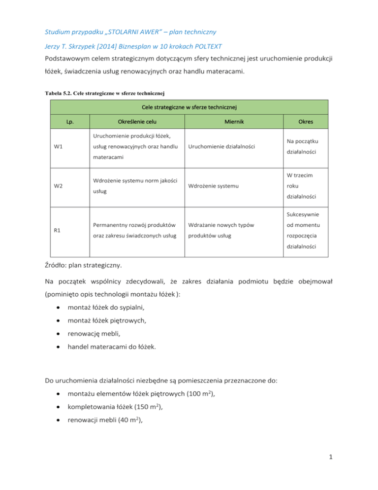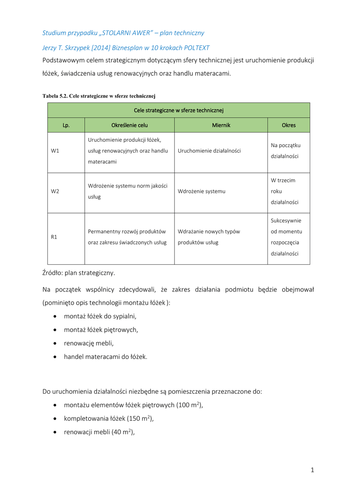 Studium przypadku „STOLARNI AWER” – plan techniczny Jerzy T. Skrzypek [2014] Biznesplan w 10 krokach POLTEXT Podstawowym celem strategicznym dotyczącym sfery technicznej jest uruchomienie produkcji łóżek, świadczenia usług renowacyjnych oraz handlu materacami. Tabela 5.2. Cele strategiczne w sferze technicznej Cele strategiczne w sferze technicznej Lp. Określenie celu Miernik Uruchomienie produkcji łóżek, W1 usług renowacyjnych oraz handlu Uruchomienie działalności materacami W2 Wdrożenie systemu norm jakości usług Okres Na początku działalności W trzecim Wdrożenie systemu roku działalności Sukcesywnie R1 Permanentny rozwój produktów Wdrażanie nowych typów od momentu oraz zakresu świadczonych usług produktów usług rozpoczęcia działalności Źródło: plan strategiczny. Na początek wspólnicy zdecydowali, że zakres działania podmiotu będzie obejmował (pominięto opis technologii montażu łóżek ): montaż łóżek do sypialni, montaż łóżek piętrowych, renowację mebli, handel materacami do łóżek. Do uruchomienia działalności niezbędne są pomieszczenia przeznaczone do: montażu elementów łóżek piętrowych (100 m2), kompletowania łóżek (150 m2), renowacji mebli (40 m2), 1 Studium przypadku „STOLARNI AWER” – plan techniczny Jerzy T. Skrzypek [2014] Biznesplan w 10 krokach POLTEXT magazynowania produktów gotowych oraz materiałów (łóżka zmontowane, elementy do montażu łóżek, meble do renowacji, materace) o powierzchni 200 m2. Niezbędne jest także dysponowanie powierzchnią biurową o powierzchni 100 m2. Produkcja łóżek piętrowych Montaż łózek (100 m2) (150 m2) Biuro (100 m2) Renowacja mebli (40 m2) Magazyn (200 m2) Rysunek 5.4. Zapotrzebowanie na powierzchnię magazynową Początkowo wspólnicy rozważali remont pomieszczeń po starej stolarni, ale wkrótce okazało się, że na obrzeżach miasta można wynająć halę o wystarczającej powierzchni (600 m2) i standardzie za 20 zł/m2. Oznacza to, że „STOARNIA AWER” będzie jedynie dzierżawcą pomieszczeń, a więc będzie ponosić koszty najmu. Uruchomienie działalności produkcyjnej, usługowej i handlowej wymaga poniesienia nakładów inwestycyjnych na zakup: urządzeń do produkcji elementów łóżek, urządzeń do montażu łóżek, urządzeń do renowacji mebli, sprzętu komputerowego z peryferiami, środków transportu wewnętrznego, 2 Studium przypadku „STOLARNI AWER” – plan techniczny Jerzy T. Skrzypek [2014] Biznesplan w 10 krokach POLTEXT umeblowania pomieszczeń. Zapytania ofertowe skierowane do wybranych producentów maszyn i urządzeń niezbędnych w stolarni pozwoliły oszacować koszt ich zakupu na 260 000 zł. Zaplanowano wydatki na sprzęt komputerowy i urządzenia peryferyjne. Wynoszą one odpowiednio 28 000 zł i 12 000 zł. Transport wewnętrzny będzie obsługiwany przez dwa typy wózków widłowych, które zostaną zakupione za 35 000 zł. Umeblowanie stolarni i biura to wydatek rzędu 25 000 zł. Ponadto będzie konieczne zakupienie oprogramowania do pracy w chmurze. Natomiast projekt łóżek zostanie wniesiony aportem przez Ewę Rawską. Na zakup specjalistycznego oprogramowania trzeba będzie wydać 8 000 zł. Wartość projektów łóżek oszacowano na 150 000 zł. Wspomniane wcześniej wydatki i koszty wprowadzono do aplikacji „Plan finansowy” w sekcji „Dane wejściowe”. Nakłady inwestycyjne pokazano przy tym w zakładce „AKTYWA TRWAŁE”. W rezultacie łączne nakłady na aktywa trwałe pokazano w tabeli 5.3. 3 Studium przypadku „STOLARNI AWER” – plan techniczny Jerzy T. Skrzypek [2014] Biznesplan w 10 krokach POLTEXT Tabela 5.3. Nakłady inwestycyjne na aktywa trwałe Aktywa trwałe - założenia Grunty grunty prawo wieczystego użytkowania gruntów Budynki i budowle Hala produkcyjna Hala magazynowa Urządzenia techniczne i maszyny Maszyny stolarskie Sprzęt komputerowy Urządzenia peryferyjne Środki transportu Wózki widłowe Inne środki trwałe Meblew stolarni i biurze Wart.niematerialne i prawne Autorskie prawa majątkowe (projekt łóżek) Licencje na specjalistyczne oprogramowanie NAKŁADY I DOTACJE Naklady inwestycyjne START 0,00 0,00 0,00 0,00 0,00 0,00 580 000,00 540 000,00 28 000,00 12 000,00 35 000,00 35 000,00 25 000,00 25 000,00 158 000,00 150 000,00 8 000,00 START 798 000,00 Źródło: obliczenia własne. Łączne nakłady inwestycyjne wyniosą na początek 798 000 zł. Powinny one zapewnić zdolność produkcyjną, umożliwiającą: montaż 500 łóżek do sypialni (w skali roku), montaż 1000 łóżek piętrowych (w skali roku), renowację 40 zabytkowych mebli (w skali roku), sprzedaż 700 materacy (w skali roku). Natomiast koszty dzierżawy pomieszczeń zostaną wykazane w zakładce „Koszty” w pozycji usługi obce. Koszty generować będą również materiały i surowce zużywane w trakcji montażu łóżek i świadczeniu usług renowacyjnych. Ich poziom obliczono na podstawie uprzednio przyjętych wartości współczynników materiałochłonności, określanych jako udział kosztów materiałów i surowców w każdej złotówce przychodów ze sprzedaży (koszty dotyczą tylko produktów i usług sprzedanych). 4 Studium przypadku „STOLARNI AWER” – plan techniczny Jerzy T. Skrzypek [2014] Biznesplan w 10 krokach POLTEXT Tabela 5.4. Koszty w sferze technicznej (I rok funkcjonowania) ZAŁOŻENIA Zużycie materiałów i energii Współczynnik chłonoości - łóżka do sypialni Współczynnik chłonoości - łózka piętrowe Współczynnik chłonoości - renowacja mebli Założenia - usługi obce Usługi obce START 1/I kw. 1/II kw. 1/III kw. 1/IV kw. 0,00 65 000,00 65 000,00 75 500,00 75 500,00 0,00 0,35 0,35 0,35 0,35 0,00 0,30 0,30 0,30 0,30 0,00 0,40 0,40 0,40 0,40 START 1/I kw. 1/II kw. 1/III kw. 1/IV kw. 0,00 36 000,00 36 000,00 36 000,00 36 000,00 Źródło: obliczenia własne. 5