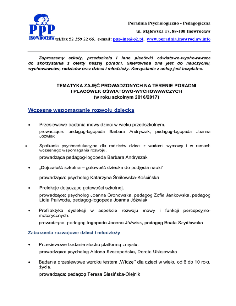 Poradnia Psychologiczno - Pedagogiczna ul. Mątewska 17, 88-100 Inowrocław tel/fax 52 359 22 66, e-mail: [email protected], www.poradnia.inowroclaw.info Zapraszamy szkoły, przedszkola i inne placówki oświatowo-wychowawcze do skorzystania z oferty naszej poradni. Skierowana ona jest do nauczycieli, wychowawców, rodziców oraz dzieci i młodzieży. Korzystanie z usług jest bezpłatne. TEMATYKA ZAJĘĆ PROWADZONYCH NA TERENIE PORADNI I PLACÓWEK OŚWIATOWO-WYCHOWAWCZYCH (w roku szkolnym 2016/2017) Wczesne wspomaganie rozwoju dziecka Przesiewowe badania mowy dzieci w wieku przedszkolnym. prowadzące: Jóźwiak pedagog-logopeda Barbara Andryszak, pedagog-logopeda Joanna Spotkania psychoedukacyjne dla rodziców dzieci z wadami wymowy i w ramach wczesnego wspomagania rozwoju. prowadząca pedagog-logopeda Barbara Andryszak „Dojrzałość szkolna – gotowość dziecka do podjęcia nauki” prowadząca: psycholog Katarzyna Śmiłowska-Kościńska Prelekcje dotyczące gotowości szkolnej. prowadzące: psycholog Joanna Gronowska, pedagog Zofia Jankowska, pedagog Lidia Paliwoda, pedagog-logopeda Joanna Jóźwiak Profilaktyka dysleksji w aspekcie rozwoju mowy i funkcji percepcyjnomotorycznych. prowadzące: pedagog-logopeda Joanna Jóźwiak, pedagog Beata Szydłowska Zaburzenia rozwojowe dzieci i młodzieży Przesiewowe badanie słuchu platformą zmysłu. prowadząca: psycholog Aldona Szczepańska, Dorota Uklejewska Badania przesiewowe wzroku testem „Widzę’’ dla dzieci w wieku od 6 do 10 roku życia. prowadząca: pedagog Teresa Ślesińska-Olejnik Terapia logopedyczna indywidualna dla dzieci z zaburzeniami mowy. prowadzące: pedagog-logopeda Barbara Andryszak, pedagog-logopeda Joanna Jóźwiak Praca z dzieckiem dyslektycznym w domu – konsultacje dla rodziców. prowadząca: pedagog Beata Szydłowska Indywidualna i grupowa terapia uczniów z trudnościami w czytaniu i pisaniu. Prowadząca: pedagog Zofia Jankowska Praca z uczniem z dysleksją rozwojową w szkole i w domu. prowadzące: pedagog Teresa Ślesińska-Olejnik, psycholog Beata Krykwińska Terapia dla dzieci i młodzieży ze specyficznymi trudnościami w nauce (dysleksja, dysgrafia, dysortografia). prowadzące: pedagog Beata Szydłowska, pedagog Teresa Ślesińska-Olejnik, pedagog-logopeda Joanna Jóźwiak, psycholog Beata Krykwińska Psychoterapia młodzieży. prowadzące: psycholog Joanna Gronowska, psycholog Agnieszka Rabazińska, psycholog Magdalena Gawlak Psychoterapia dzieci. prowadzące: psycholog Magdalena Gawlak, psycholog Anna Derwich Grupowa terapia psychologiczna dla młodzieży z fobią szkolną i społeczną. prowadząca: psycholog Joanna Gronowska Warsztaty dla nauczycieli i rodziców –„Depresja u dzieci szkolna i społeczna”. i młodzieży”, „Fobia prowadząca: psycholog Joanna Gronowska „Metody pracy z dzieckiem z ADHD’’. Warsztaty dla nauczycieli. prowadzące: psycholog Alina Woźniak, psycholog Magdalena Gawlak „Dziecko z ADHD’’. Warsztaty dla rodziców. prowadzące: psycholog Alina Woźniak, psycholog Magdalena Gawlak „Wybrane zaburzenia psychiczne u dzieci i młodzieży: depresja, zaburzenia odżywiania, fobia społeczna, ADHD a funkcjonowanie w szkole”. Warsztaty dla nauczycieli. prowadzące: psycholog Katarzyna Śmiłowska-Kościńska, psycholog Magdalena Gawlak „Metody pracy z uczniem słabo widzącym i niewidomym. prowadzące: pedagog Teresa Ślesińska-Olejnik, psycholog Beata Krykwińska „Rozwój mowy, a dysleksja u dzieci.” prowadzące: pedagog-logopeda Joanna Jóźwiak, pedagog Beata Szydłowska „Lepiej piszę, lepiej czytam”. prowadząca: pedagog Zofia Jankowska Zajęcia wspomagające rozwój dziecka sześcioletniego z wykorzystaniem metody Paula Denisona oraz relaksacji. metodą origami prowadząca: pedagog Zofia Jankowska Wspomaganie procesu wychowawczego Zajęcia profilaktyczne „cyberprzemoc” dla dzieci przedszkolnych i uczniów klas I szkoły podstawowej. prowadzące: pedagog Tamara Chorążewska, psycholog Teresa Czajkowska „Atrakcyjny chłopak, atrakcyjna dziewczyna atrakcyjność?”. – kl. VI i gimnazjum – od czego zależy nasza prowadzące: pedagog Tamara Chorążewska, psycholog Teresa Czajkowska Co czujemy i przeżywamy. Uczymy się rozpoznawania i nazywania uczuć. prowadzące: pedagog Tamara Chorążewska, psycholog Teresa Czajkowska Co nowego i ważnego pojawia się w okresie dojrzewania – prelekcja. prowadzące: pedagog Tamara Chorążewska, psycholog Teresa Czajkowska Szkoła dla rodziców i wychowawców. Warsztaty psychoedukacyjne. prowadzące: pedagog Lidia Paliwoda, psycholog Teresa Czajkowska „Komunikacja między nauczycielem a rodzicem”. prowadząca: psycholog Katarzyna Śmiłowska-Kościńska „Stres – objawy, przyczyny, jak sobie z nim radzić”. prowadząca: psycholog Katarzyna Śmiłowska-Kościńska „Emocje pod kontrolą – jak pomóc dziecku zrozumieć i lepiej radzić sobie z własnymi emocjami”. prowadząca: psycholog Katarzyna Śmiłowska-Kościńska „Co pomaga, a co przeszkadza uczyć się”. prowadząca: psycholog Katarzyna Śmiłowska-Kościńska „Prawidłowe komunikowanie się podstawą dobrych relacji w domu i w szkole”. prowadząca: psycholog Katarzyna Śmiłowska-Kościńska „Mobbing i bullying – formy przemocy rówieśniczej”. prowadząca: psycholog Katarzyna Śmiłowska-Kościńska „Rola domu rodzinnego w wychowaniu dzieci i młodzieży”. prowadząca: pedagog Zofia Jankowska „Trudności wychowawcze przyczyny i sposoby rozwiązania”. prowadząca: pedagog Zofia Jankowska „Rola rodziców w wychowaniu i edukacji dzieci”. prowadząca: pedagog Zofia Jankowska Warsztaty dla nauczycieli: Nadpobudliwe czy nieposłuszne? Rozróżnienie objawów nadpobudliwości od zachowań niepożądanych. Strategie radzenia sobie. Norma a patologia. Norma rozwojowa a zaburzenia rozwoju. Kiedy szukać pomocy? Rodzicu idź z dzieckiem do poradni! Jak wygląda proces diagnostyczny? Znaczenie terminów i z