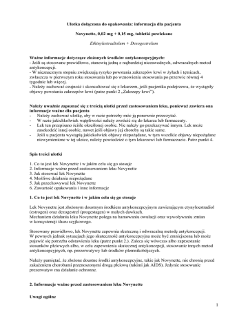 Ulotka dołączona do opakowania: informacja dla pacjenta Novynette, 0,02 mg + 0,15 mg, tabletki powlekane Ethinylestradiolum + Desogestrelum Ważne informacje dotyczące złożonych środków antykoncepcyjnych: - Jeśli są stosowane prawidłowo, stanowią jedną z najbardziej niezawodnych, odwracalnych metod antykoncepcji. - W nieznacznym stopniu zwiększają ryzyko powstania zakrzepów krwi w żyłach i tętnicach, zwłaszcza w pierwszym roku stosowania lub po wznowieniu stosowania po przerwie równej 4 tygodnie lub więcej. - Należy zachować czujność i skonsultować się z lekarzem, jeśli pacjentka podejrzewa, że wystąpiły objawy powstania zakrzepów krwi (patrz punkt 2 „Zakrzepy krwi”). Należy uważnie zapoznać się z treścią ulotki przed zastosowaniem leku, ponieważ zawiera ona informacje ważne dla pacjenta - Należy zachować ulotkę, aby w razie potrzeby móc ją ponownie przeczytać. - W razie jakichkolwiek wątpliwości należy zwrócić się do lekarza lub farmaceuty. - Lek ten przepisano ściśle określonej osobie. Nie należy go przekazywać innym. Lek może zaszkodzić innej osobie, nawet jeśli objawy jej choroby są takie same. - Jeśli u pacjenta wystąpią jakiekolwiek objawy niepożądane, w tym wszelkie objawy niepożądane niewymienione w tej ulotce, należy powiedzieć o tym lekarzowi lub farmaceucie. Patrz punkt 4. Spis treści ulotki 1. Co to jest lek Novynette i w jakim celu się go stosuje 2. Informacje ważne przed zastosowaniem leku Novynette 3. Jak stosować lek Novynette 4. Możliwe działania niepożądane 5. Jak przechowywać lek Novynette 6. Zawartość opakowania i inne informacje 1. Co to jest lek Novynette i w jakim celu się go stosuje Lek Novynette jest złożonym doustnym środkiem antykoncepcyjnym zawierającym etynyloestradiol (estrogen) oraz dezogestrel (progestagen) w małych dawkach. Mechanizm działania leku Novynette polega na hamowaniu owulacji oraz wywoływaniu zmian w konsystencji śluzu szyjkowego. Stosowany prawidłowo, lek Novynette zapewnia skuteczną i odwracalną metodę antykoncepcji. W pewnych jednak sytuacjach jego skuteczność antykoncepcyjna może być zmniejszona lub może pojawić się potrzeba odstawienia leku (patrz punkt 2.). Zaleca się wówczas albo zaprzestanie stosunków płciowych albo, w celu zapewnienia skutecznej antykoncepcji, stosowanie innych metod antykoncepcyjnych, np. prezerwatywy lub środków plemnikobójczych. Należy pamiętać, że złożone doustne środki antykoncepcyjne, takie jak Novynette, nie chronią przed zakażeniem chorobami przenoszonymi drogą płciową (takimi jak AIDS). Jedynie stosowanie prezerwatyw ma działanie ochronne. 2. Informacje ważne przed zastosowaniem leku Novynette Uwagi ogólne 1 Przed rozpoczęciem przyjmowania leku Novynette należy zapoznać się z informacjami dotyczącymi zakrzepów krwi (zakrzepica) w punkcie 2. Jest szczególnie ważne, aby zapoznać się z objawami wystąpienia zakrzepów krwi (patrz punkt 2 „Zakrzepy krwi”). Zanim będzie można rozpocząć stosowanie leku Novynette, lekarz zada pacjentce kilka pytań na temat zdrowia oraz na temat zdrowia bliskich krewnych. Lekarz zmierzy także ciśnienie krwi i, zależnie od indywidualnego przypadku, może także przeprowadzić niektóre inne badania. Kiedy nie stosować leku Novynette Nie należy stosować leku Novynette, jeśli u pacjentki występuje jakikolwiek z wymienionych poniżej stanów. Jeśli u pacjentki występuje jakikolwiek z wymienionych poniżej stanów, należy poinformować o tym lekarza. Lekarz omówi z pacjentką, jaki inny środek zapobiegania ciąży będzie bardziej odpowiedni. - Jeśli pacjentka ma uczulenie na etynyloestradiol lub dezogestrel lub którykolwiek z pozostałych składników tego leku (wymienionych w punkcie 6); może wystąpić świąd, wysypka lub obrzęk; - Jeśli u pacjentki obecnie występuje (lub kiedykolwiek występował) zakrzep krwi w naczyniach krwionośnych nóg (zakrzepica żył głębokich), w płucach (zatorowość płucna) lub w innych narządach; - Jeśli pacjentka wie, że ma zaburzenia wpływające na krzepliwość krwi - na przykład niedobór białka C, niedobór białka S, niedobór antytrombiny III, obecność czynnika V Leiden lub przeciwciał antyfosfolipidowych; - Jeśli pacjentka wymaga zabiegu chirurgicznego lub nie będzie chodziła przez długi czas (patrz punkt „Zakrzepy krwi”); - Jeśli pacjentka przeszła zawał mięśnia sercowego lub udar; - Jeśli pacjentka choruje (lub chorowała w przeszłości) na dusznicę bolesną (choroba, która powoduje silny ból w klatce piersiowej i może być pierwszym objawem zawału mięśnia sercowego) lub przemijający napad niedokrwienny (przemijające objawy udaru); - Jeśli pacjentka choruje na jakąkolwiek z poniższych chorób, które mogą zwiększać ryzyko powstania zakrzepu w tętnicy: - ciężka cukrzyca z uszkodzeniem naczyń krwionośnych, - bardzo wysokie ciśnienie krwi, - bardzo wysokie stężenie tłuszczów we krwi (cholesterolu lub triglicerydów), - chorobę nazywaną hiperhomocysteinemią; - Jeśli u pacjentki występuje (lub występował w przeszłości) rodzaj migreny nazywany „migreną z aurą”; - Jeśli u pacjentki występuje lub występowało w przeszłości zapalenie trzustki; - Jeśli u pacjentki występują lub występowały w przeszłości choroby wątroby, a nie doszło do powrotu czynności wątroby do normy; - Jeśli u pacjentki występują lub występowały w przeszłości nowotwory wątroby; - Jeśli u pacjentki występują, występowały w przeszłości lub podejrzewa się występowanie nowotworów. narządów płciowych lub piersi; - Jeśli u pacjentki występuje krwawienie z pochwy o nieustalonej przyczynie; - Jeśli u pacjentki występuje ciąża. Ostrzeżenia i środki ostrożności Przed rozpoczęciem stosowania leku Novynette należy omówić to z lekarzem lub farmaceutą. Kiedy należy skontaktować się z lekarzem? Należy natychmiast zg