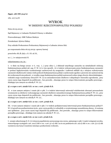 Sygn. akt IIK 314/12 1Ds. 107/12/D WYROK W IMIENIU RZECZYPOSPOLITEJ POLSKIEJ Dnia 06.03.2013r. Sąd Rejonowy w Lubaniu Wydział II Karny w składzie: Przewodniczący: SSR Tuliusz Stabryn Protokolant: Sylwia Oleksy Przy udziale Prokuratora Prokuratury Rejonowej w Lubaniu Artura Idzi. po rozpoznaniu dnia 06.03.2013r. sprawy karnej przeciwko: S. Z. (1), s. S. i B. zd. B., ur. (...) w miejscowości N. oskarżonemu o to, że : I. w dniu 09 lutego 2012r. w L. woj. (...) przy ulicy (...) dokonał umyślnego zamachu na nietykalność cielesną funkcjonariusza policji mł. asp. P. W. (1) w ten sposób , iż w trakcie wykonywania przez funkcjonariusza czynności w postaci legitymowania wymienionego zachowywał się arogancko i usiłował oddalić się z miejsca wykonywania czynności służbowych i mimo wielu poleceń funkcjonariusza policji o zachowanie zgodne z prawem nie zastosował się do wydawanych mu poleceń , w wyniku czego funkcjonariusz policji zastosował wobec niego chwyty obezwładniające , wskutek czego wymieniony chwycił P. W. (1) za umundurowanie służbowe i odepchnął w kierunku ogrodzenia , przy czym czynu tego dopuścił się publicznie , bez powodu , okazując przez to rażące lekceważenie porządku prawnego , działając tym samym na szkodę P. W. (1) , tj. o czyn z art. 222§1 k.k. w zw. z art. 57a§1 k.k. II. w tym samym miejscu i czasie jak w pkt. I w trakcie interwencji znieważył wielokrotnie słowami powszechnie uważanymi za obelżywe wykonującego czynności służbowe umundurowanego funkcjonariusza policji P. W. (1) , przy czym czynu tego dopuścił się publicznie , bez powodu , okazując przez to rażące lekceważenie porządku prawnego , działając tym samym na szkodę P. W. (1) , tj. o czyn z art. 226§1 k.k. w zw. z art. 57a§1 k.k. III. w tym samym miejscu i czasie jak w pkt. I w trakcie podejmowanej interwencji przez funkcjonariusza policji P. W. (1) groził mu pozbawieniem życia , przy czym groźby te wzbudziły u wymienionego uzasadnioną obawę , iż zostaną one spełnione , przy czym czynu tego dopuścił się publicznie , bez powodu , okazując przez to rażące lekceważenie porządku prawnego , działając tym samym na szkodę P. W. (1) , tj. o czyn z art. 190§1 k.k. w zw z art. 57a§1 k.k. I. uznaje oskarżonego S. Z. (1) winnym popełnienia zarzucanego mu czynu, opisanego w pkt. I części wstępnej wyroku, stanowiącego występek z art. 222 § 1kk w zw. z art. 57 a § 1kk i za to na podstawie art. 222 § 1kk w zw. z art. 57 a § 1kk wymierza mu karę 6 (sześciu) miesięcy pozbawienia wolności, II. uznaje oskarżonego S. Z. (1) winnym popełnienia zarzucanego mu czynu, opisanego w pkt. II części wstępnej wyroku, stanowiącego występek z art. 226 § 1kk w zw. z art. 57 a § 1kk i za to na podstawie art. 226§ 1kk w zw. z art. 57 a § 1kk wymierza mu karę 6 (sześciu) miesięcy pozbawienia wolności, III. uznaje oskarżonego S. Z. (1) winnym popełnienia zarzucanego mu czynu, opisanego w pkt. III części wstępnej wyroku, stanowiącego występek z art. 190 § 1kk w zw. z art. 57 a § 1kk i za to na podstawie art. 190 § 1kk w zw. z ar. 57 a § 1kk wymierza mu karę 6 (sześciu) miesięcy pozbawienia wolności, IV. na podstawie art. 85 kk i art. 86 § 1kk łączy orzeczone wobec oskarżonego S. Z. (1) kary pozbawienia wolności i wymierza mu karę łączną 1 (jednego) roku pozbawienia wolności, V. na podstawie art. 69 § 1 i 2kk i art. 70 § 1pkt. 1kk warunkowo zawiesza oskarżonemu S. Z. (1) wykonanie orzeczonej kary łącznej pozbawienia wolności na okres próby wynoszący 3 (trzy) lata, VI. na podstawie art. 57a § 2kk zasądza od oskarżonego S. Z. (1) na rzecz pokrzywdzonego P. W. (1) nawiązki: - za I czyn w kwocie 800 (osiemset) złotych, - za II czyn w kwocie 600 (sześćset) złotych, - za III czyn w kwocie 800 (osiemset) złotych, płatne po uprawomocnieniu się wyroku, VII. na podstawie art. 624§1 kpk i art. 17 ust. 1 ustawy z dnia 23.06.1973r. o opłatach w sprawach karnych, zwalnia oskarżonego od ponoszenia kosztów w niniejszej sprawie i nie wymierza mu opłaty karnej. Uzasadnienie. S. Z. (1) w dniu 8 lutego 2012 roku uczestniczył w kolizji drogowej w okolicach stacji benzynowej w J., w której jego pojazd O. (...) o nr rej (...) uległ uszkodzeniu. Na miejsce zdarzenia wezwano patrol Policji w składzie (...). Policjanci stwierdzili, iż sprawcą kolizji był S. Z. (1), który nie zgodził się z ich decyzją i odmówił przyjęcia mandatu. W związku z niesprawnością jego pojazdu, P. W. (1) nakazał mu zabezpieczyć pojazd i zakazał dalszego poruszania się nim. Następnego dnia około godziny 14.00, S. Z. (1) udał się swoim samochodem, do Komendy Powiatowej Policji w L., ze skarga na P. W. (1). Dyżurny odesłał go jednak do Prokuratury Rejonowej w L.Razem ze S. Z. (1) była jego konkubina T. V. (1), obywatelka Republiki Czech. Po opuszczeniu budynku KPP, wsiedli do niesprawnego samochodu i udali się do Prokuratury. Przejeżdżając przez Plac (...), zostali zauważeni przez patrol ruchu drogowego w składzie (...). Policjanci rozpoznając uszkodzony pojazd, którym kierujący nie miał prawa się poruszać postanowili dokonać jego kontroli w związku, z czym udali się za nim, przejeżdżając przez centrum miasta. Dowód: zeznania świadka P. W. k. 95-96, 2-4; zeznania świadka B. I. k. 94-95, 8-9; zeznania świadka T. V. k. 121-122; wyjaśnienia oskarżonego S. Z. k. 92, 23-25. Po skręceniu O. w ul. (...) zauważyli, iż pojazd zatrzymuje się na wysokości budynku Prokuratury Rejonowej w L.. Kierujący radiowozem P. W. (1) zatrzymał się za samochodem S. Z. (1), który w tym czasie wysiadał ze swojego auta. P. W. (1) wysiadł również i podszedł do niego przedstawiając się i prosząc o dokumenty pojazdu oraz prawo jazdy. Jednocześnie przedstawił powód kontroli. Z samochodu wysiadła również T. V. (1), która podeszła do Z. i złapała go za rękę. S. Z. (1) odmówił okazania żądanych