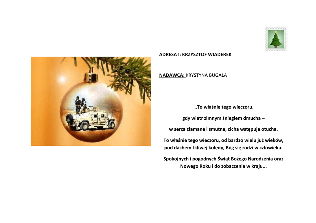 ADRESAT: KRZYSZTOF WIADEREK NADAWCA: KRYSTYNA BUGAŁA …To właśnie tego wieczoru, gdy wiatr zimnym śniegiem dmucha – w serca złamane i smutne, cicha wstępuje otucha. To właśnie tego wieczoru, od bardzo wielu już wieków, pod dachem tkliwej kolędy, Bóg się rodzi w człowieku. Spokojnych i pogodnych Świąt Bożego Narodzenia oraz Nowego Roku i do zobaczenia w kraju...