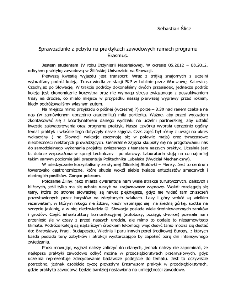 Sebastian Ślisz Sprawozdanie z pobytu na praktykach zawodowych ramach programu Erasmus. Jestem studentem IV roku Inżynierii Materiałowej. W okresie 05.2012 – 08.2012. odbyłem praktykę zawodową w Żilińskiej Univerzicie na Słowacji. Pierwszą kwestią wyjazdu jest transport. Wraz z trójką znajomych z uczelni wybraliśmy podróż koleją. Trasa wiodła ze stacji PKP w Lublinie przez Warszawę, Katowice, Czechy,aż po Słowację. W trakcie podróży dokonaliśmy dwóch przesiadek, jednakże podróż koleją jest ekonomicznie korzystna oraz nie wymaga stresu związanego z poszukiwaniem trasy na drodze, co miało miejsce w przypadku naszej pierwszej wyprawy przed rokiem, kiedy podróżowaliśmy własnym autem. Na miejscu mimo przyjazdu o późnej (wczesnej ?) porze – 3.30 nad ranem czekała na nas (w zamówionym uprzednio akademiku) miła portierka. Ważne, aby przed wyjazdem zkontakować się z koordynatorem danego wydziału na uczelni partnerskiej, aby ustalić kwestie zakwaterowania oraz programu praktyk. Nasza czwórka wybrała uprzednio ogólny temat praktyk i właśnie tego dotyczyły nasze zajęcia. Czas zajęć był różny z uwagi na okres wakacyjny ( na Słowacji wakacje zaczynają się w połowie maja) oraz tymczasowe nieobecności niektórych prowadzących. Generalnie zajęcia skupiały się na przgotowaniu nas do samodzielnego wykonania projektu związanego z tematem naszych praktyk. Uczelnia jest b. dobrze wyposażona w sprzęt techniczny i pomiarowy. Laboratoria stoją na co najmniej takim samym poziomie jaki prezentuje Politechnika Lubelska (Wydział Mechaniczny). W miedzyczasie korzystaliśmy ze słynnej Żilińskiej Stołówki – Menzy. Jest to centrum towarzysko gastronomiczne, które skupia wokół siebie tysiące entuzjastów smacznych i niedrogich posiłków. Gorąco polecam. Położenie Żiliny, jako miasta gwarantuje nam wiele atrakcji turystycznych, dalszych i bliższych, jeśli tylko ma się ochotę ruszyć na krajoznawcze wyprawy. Wokół rozciągają się tatry, które po stronie słowackiej są nawet piękniejsze, gdyż nie widać tam zniszczeń pozostawionych przez turystów na zdeptanych szlakach. Lasy i góry wokół są wielkim rezerwatem, w którym nikogo nie ździwi, kiedy wspinając się na średną górkę, spotka na szczycie jaskinię, a w niej niedźwiedzia ☺. Słowacja posiada wiele średniowiecznych zamków i grodów. Część infrastruktury komunikacyjnej (autobusy, pociągi, dworce) pozwala nam przenieść się w czasy z przed naszych urodzin, ale mimo to dodaje to niesamowitego klimatu. Podróże koleją są najtańszym środkiem lokomocji więc dosyć tanio można się dostać do: Bratysławy, Pragi, Budapesztu, Wiednia i paru innych pereł środkowej Europy, z których każda posiada tony zabytków i atrakcji wystarczające by zapełnić parę dni intensywnego zwiedzania. Podsumowując, wyjazd należy zaliczyć do udanych, jednak należy nie zapominać, że najlepsze praktyki zawodowe odbyć można w przedsiębiorstwach przemysłowych, gdyż uczelnia reprezentuje zdecydowanie badawcze podejście do tematu. Jest to oczywiście potrzebne, jednak osobiście życzę przyszłym Erasmusom praktyk w przedsiębiorstwach, gdzie praktyka zawodowa będzie bardziej nastawiona na umiejętności zawodowe. Poniżej zamieszczam zdjęcia z wyjazdu.
