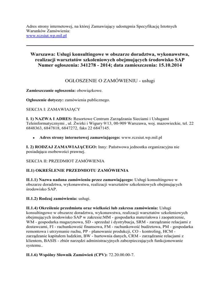 Adres strony internetowej, na której Zamawiający udostępnia Specyfikację Istotnych Warunków Zamówienia: www.rczsiut.wp.mil.pl Warszawa: Usługi konsultingowe w obszarze doradztwa, wykonawstwa, realizacji warsztatów szkoleniowych obejmujących środowisko SAP Numer ogłoszenia: 341278 - 2014; data zamieszczenia: 15.10.2014 OGŁOSZENIE O ZAMÓWIENIU - usługi Zamieszczanie ogłoszenia: obowiązkowe. Ogłoszenie dotyczy: zamówienia publicznego. SEKCJA I: ZAMAWIAJĄCY I. 1) NAZWA I ADRES: Resortowe Centrum Zarządzania Sieciami i Usługami Teleinformatycznymi , ul. Żwirki i Wigury 9/13, 00-909 Warszawa, woj. mazowieckie, tel. 22 6848363, 6847818, 6847272, faks 22 6847145. Adres strony internetowej zamawiającego: www.rczsiut.wp.mil.pl I. 2) RODZAJ ZAMAWIAJĄCEGO: Inny: Państwowa jednostka organizacyjna nie posiadająca osobowości prawnej. SEKCJA II: PRZEDMIOT ZAMÓWIENIA II.1) OKREŚLENIE PRZEDMIOTU ZAMÓWIENIA II.1.1) Nazwa nadana zamówieniu przez zamawiającego: Usługi konsultingowe w obszarze doradztwa, wykonawstwa, realizacji warsztatów szkoleniowych obejmujących środowisko SAP. II.1.2) Rodzaj zamówienia: usługi. II.1.4) Określenie przedmiotu oraz wielkości lub zakresu zamówienia: Usługi konsultingowe w obszarze doradztwa, wykonawstwa, realizacji warsztatów szkoleniowych obejmujących środowisko SAP w zakresie:MM - gospodarka materiałowa i zaopatrzenie, WM - gospodarka magazynowa, SD - sprzedaż i dystrybucja, SRM - zarządzanie relacjami z dostawcami, FI - rachunkowość finansowa, FM - rachunkowość budżetowa, PM - gospodarka remontowa i utrzymanie ruchu, PP - planowanie produkcji, CO - kontroling, HCM zarządzanie kapitałem ludzkim, BW - hurtownia danych, CRM - zarządzanie relacjami z klientem, BASIS - zbiór narzędzi administracyjnych zabezpieczających funkcjonowanie systemu.. II.1.6) Wspólny Słownik Zamówień (CPV): 72.20.00.00-7. II.1.7) Czy dopuszcza się złożenie oferty częściowej: nie. II.1.8) Czy dopuszcza się złożenie oferty wariantowej: nie. II.2) CZAS TRWANIA ZAMÓWIENIA LUB TERMIN WYKONANIA: Okres w miesiącach: 36. SEKCJA III: INFORMACJE O CHARAKTERZE PRAWNYM, EKONOMICZNYM, FINANSOWYM I TECHNICZNYM III.1) WADIUM Informacja na temat wadium: Zamawiający żąda zabezpieczenia ofert wadium w wysokości 10 000,00 zł (słownie złotych: dziesięć tysięcy 00/100) III.2) ZALICZKI III.3) WARUNKI UDZIAŁU W POSTĘPOWANIU ORAZ OPIS SPOSOBU DOKONYWANIA OCENY SPEŁNIANIA TYCH WARUNKÓW III.3.4) Osoby zdolne do wykonania zamówienia Opis sposobu dokonywania oceny spełniania tego warunku o O udzielenie zamówienia mogą ubiegać się Wykonawcy, którzy spełniają wymagania określone w art. 22 ust. 1 ustawy z dnia 29 stycznia 2004r. - Prawo zamówień publicznych a w szczególności dotyczące dysponowania osobami zdolnymi do wykonania zamówienia. Wykonawca spełni warunek w sytuacji gdy zapewni w składzie zespołu realizacyjnego co najmniej: a) po 1 (jednym) konsultancie wiodącym do każdego z modułów funkcjonalnych SAP: MM, WM, SD, SRM, FI, FM, PM, PP, CO, HCM, BW, który:brał udział w min. 3 (trzech) zakończonych projektach, w tym przynajmniej w jednym na stanowisku kierownika projektu, obejmujących wdrożenie rozwiązania informatycznego SAP w organizacji wielooddziałowej, tj. min. 3 (trzech) oddziałów, w której dokonano integracji przynajmniej 2 (dwóch) modułów funkcjonalnych SAP: MM, WM, SD, SRM, FI, FM, PM, PP, CO, HCM, BW; posiada certyfikat co najmniej SAP CERTIFIED APPLICATION ASSOCIATE dotyczący modułu funkcjonalnego, w zakresie którego pełni on rolę konsultanta wiodącego oraz dodatkowo co najmniej 1 (jeden) konsultant musi posiadać przynajmniej certyfikat Metodyki ASAP lub SAP CERTIFIED TECHNOLOGY PROFFESSIONAL - SOLUTION MANAGER; posiada poświadczenie bezpieczeństwa o klauzuli nie niższej niż zastrzeżone lub pisemne upoważnienie kierownika jednostki organizacyjnej umożliwiające dostęp do informacji niejawnej o klauzuli zastrzeżone a także odbyte i udokumentowane szkolenie w zakresie ochrony informacji niejawnych. b) po 1 (jednym) konsultancie zadaniowym do każdego z modułów funkcjonalnych SAP: MM, WM, SD, SRM, FI, FM, PM, PP, CO, HCM, BW, który:brał udział w min. 1 (jednym) zakończonym projekcie, obejmującym wdrożenie rozwiązania informatycznego SAP w organizacji wielooddziałowej, tj. min. 3 (trzech) oddziałów, w której dokonano integracji przynajmniej 2 (dwóch) modułów funkcjonalnych SAP: MM, WM, SD, SRM, FI, FM, PM, PP, CO, HCM, BW; posiada certyfikat co najmniej SAP CERTIFIED APPLICATION ASSOCIATE dotyczący modułu funkcjonalnego, w zakresie którego pełni on rolę konsultanta zadaniowego oraz dodatkowo co najmniej 1 (jeden) konsultant musi posiadać przynajmniej certyfikat Metodyki ASAP lub SAP CERTIFIED TECHNOLOGY PROFFESSIONAL - SOLUTION MANAGER; posiada poświadczenie bezpieczeństwa o klauzuli nie niższej niż zastrzeżone lub pisemne upoważnienie kierownika jednostki organizacyjnej umożliwiające dostęp do informacji niejawnej o klauzuli zastrzeżone a także odbyte i udokumentowane szkolenie w zakresie ochrony informacji niejawnych; c) 2 (dwóch) konsultantów posiadających 3 letnie doświadczenie w programowaniu w języku ABAP, z których: każdy brał udział w min. 4 (czterech) projektach obejmujących wdrożenie rozwiązania informatycznego SAP w organizacji wielooddziałowej, tj. min. 3 (trzech) oddziałów, w której dokonano integracji przynajmniej 2 (dwóch) modułów funkcjonalnych SAP: MM, WM, SD, SRM, FI, FM, PM, PP, CO, HCM, BW; każdy z konsultantów ABAP powinien posiadać certyfikat SAP CERTIFIED DEVELOPMENT - ABAP; co najmniej 1 (jeden) z konsultantów (programistów) języka ABAP musi posiadać 2 letnie doświadczenie i potwierdzony udział w projektach obejmujących wdrożenie modułu HCM; każdy musi posiadać poświadczenie bezpieczeństwa o klauzuli nie niższej niż zastrzeżone lub pisemne upoważnienie kierownika jednostki organizacyjnej 