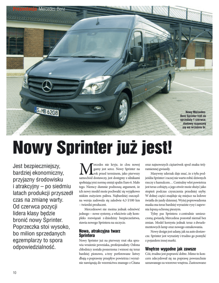 Prezentacja Mercedes-Benz Nowy MercedesBenz Sprinter trafi do sprzedaży 1 czerwca; dostawy rozpoczną się we wrześniu br. Nowy Sprinter już jest! Jest bezpieczniejszy, bardziej ekonomiczny, przyjazny środowisku i atrakcyjny – po siedmiu latach produkcji przyszedł czas na zmianę warty. Od czerwca pozycji lidera klasy będzie bronić nowy Sprinter. Poprzeczka stoi wysoko, bo milion sprzedanych egzemplarzy to spora odpowiedzialność. 10 M ercedes nie kryje, że clou nowej gamy jest serce. Nowy Sprinter na rok przed terminem, jako pierwszy samochód dostawczy, jest dostępny z silnikami spełniającymi normę emisji spalin Euro 6. Mało tego. Niemcy dumnie podnoszą argument, że ich nowy model może pochwalić się wyjątkowo niskim zużyciem paliwa. Najbardziej oszczędna wersja zadowala się zaledwie 6,3 l/100 km – twierdzi producent. Mercedesowi nie można jednak odmówić jednego – nowe systemy, a właściwie cały kompleks rozwiązań z dziedziny bezpieczeństwa, stawia nowego Sprintera na szczycie. Nowa, atrakcyjna twarz Sprintera Nowy Sprinter już na pierwszy rzut oka sprawia wrażenie pewniaka, profesjonalisty. Osłona chłodnicy została poszerzona i wznosi się teraz bardziej pionowo, a trzy perforowane listwy dbają o poprawny przepływ powietrza i wyraźnie nawiązują do wzornictwa znanego z Citana oraz najnowszych ciężarówek spod znaku trójramiennej gwiazdy. Masywny zderzak daje znać, że z tyłu podjeżdża Sprinter i raczej nie warto robić dziwnych rzeczy z hamulcem… Centralny wlot powietrza jest teraz cofnięty, a jego otwór może służyć jako stopień podczas czyszczenia przedniej szyby. W dolnej części znajduje się miejsce na ledowe światła do jazdy dziennej. Wyżej poprowadzona maska ma teraz bardziej wyraziste rysy i zapewnia lepszą ochronę pieszym. Tylny pas Sprintera z centralnie umieszczoną gwiazdą Mercedesa pozostał niemal bez zmian. Model korzysta jednak teraz z dwuelementowych lamp oraz nowego oznakowania. Nowy design jest udany, jak na auto dostawcze. Sprinter jest wyrazisty i trudno go pomylić z pojazdem innej marki. Wnętrze wygodne jak zawsze Cóż, trudno jest poprawić dobre. Mimo to koncern zdecydował się na poprawę powszechnie uznawanego za wzorowe wnętrza. Zastosowano nowe pokrycia i tapicerkę foteli. Grubszy wieniec kierownicy jeszcze lepiej leży w dłoniach, a kratki wentylacyjne wyróżniają się chromowanymi aplikacjami. Przeprojektowana została także dźwignia zmiany biegów. Sprinter został wyposażony w nową generację nagłośnienia, oferującą zestaw telefoniczny Bluetooth (wraz z klawiaturą i książką telefoniczną) oraz system nawigacji Becker MAP PILOT. Podczas jazdy czuć jakość. Elementy wykończenia wnętrza są precyzyjnie spasowane. W trakcie pokonywania nierówności nie ma mowy o trzeszczeniu czy skrzypieniu. Przejrzyście rozmieszczone instrumenty i wyraźnie oznaczone przyciski znajdują się w zasięgu ręki. W krytycznym momencie każdy detal ma tu znaczenie – choćby dlatego w samochodach Mercedes-Benz podświetlany włącznik świateł awaryjnych umieszczony jest na szczycie konsoli środkowej. Zewnętrzne lusterka po lewej i prawej stronie mają osobne zwierciadła szerokokątne, a ich obudowy są zoptymalizowane pod kątem aerodynamiki w celu zniwelowania skłonności do zabrudzeń. Wysoki komfort jazdy i niski poziom hałasu oraz wydajne ogrzewanie i wentylacja sprawiają, że nawet długa podróż jest przyjemna, a liczne schowki ułatwiają organizację podczas codziennej pracy. Precyzyjny układ kierowniczy i stosunkowo niewielka średnica zawracania zapewniają maksymalne bezpieczeństwo oraz wygodę prowadzenia Warto też dodać, że wyjątkowo wygodnie siedzi się w fotelu kierowcy. Szerokie podłokietniki pozwalają na podparcie rąk w trakcie dłuższych tras. A dobrze wyciszona kabina zapewnia wysoki poziom komfortu akustycznego. pracuje z wielką kulturą. Jest niebywale cichy. Auto w pełnym zakresie rwie do przodu. Podczas jazdy po autostradzie „ściana” w postaci powierzchni czołowej sprintera bez problemu osiąga 140 km/h (autostrada niemiecka, nie było ograniczeń). Natomiast 129-konna wersja na papierze wypada nieznacznie gorzej. Jednak w zabudowie typu furgon sprawdza się wręcz koncertowo. 305 Nm i owe 129 koni pozwalaj Sprinterem jeździć niemal tak dynamiczne, jak średniej klasy autem osobowym. Nie ma obawy, że zabraknie mocy w sytuacji awaryjnej. Ale jednocześnie podczas precyzyjnego manewrowania Sprinterem można manewrować niemal co do milimetra. Warto dodać, że układ wtrysku commonrail generuje maksymalne ciśnienie 1800 barów. Za dostarczanie paliwa odpowiadają wtryskiwacze magnetyczne z 7-otworowymi dyszami, a w układzie doładowania pracuje dwustopniowa turbosprężarka. Poddaliśmy weryfikacji podczas krótkich testów spalanie nowego Sprintera. Deklarowane 6,3 litra brzmi bowiem jak bajka. Wyniki średnie obliczane przez komputery pokładowe dwóch testowanych modeli były rzeczywiście obiecujące. Zarówno w przypadku wersji moc- niejszej i słabszej na wyświetlaczu pojawiał się wynik 9,1 – 9,3 litra, jako średnie spalanie na 100 km. Warto jednak podkreślić, że większa część testu była poprowadzona autostradami, gdzie auta rozwijały spore prędkości – 120-140 km/h. Częściowo były także załadowane. 6-cylindrowy król Królewską klasą jest silnik V6 OM 642 o pojemności 3 litrów. To jedyna V-szóstka pod maską europejskiego vana. Jego długoskokowa konstrukcja (średnica x skok: 83 x 92 mm) wykorzystuje aluminiową skrzynię korbową o stopniu rozwarcia cylindrów równym 72 st. Przesunięcie czopów korbowych i zastosowanie wałka wyrównoważającego skutkuje wyjątkowo aksamitną kulturą pracy. O technicznym wyrafinowaniu jednostki świadczy też komplet czterech napędzanych łańcuchem wałków rozrządu oraz system wtrysku common-rail z piezoelektrycznymi wtryskiwaczami o 8-otworowych dyszach.