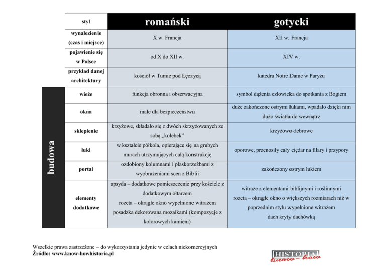 romański gotycki X w. Francja XII w. Francja od X do XII w. XIV w. kościół w Tumie pod Łęczycą katedra Notre Dame w Paryżu wieże funkcja obronna i obserwacyjna symbol dążenia człowieka do spotkania z Bogiem okna małe dla bezpieczeństwa styl wynalezienie (czas i miejsce) pojawienie się w Polsce przykład danej architektury budowa sklepienie łuki portal krzyżowe, składało się z dwóch skrzyżowanych ze sobą „kolebek” w kształcie półkola, opierające się na grubych murach utrzymujących całą konstrukcję ozdobiony kolumnami i płaskorzeźbami z wyobrażeniami scen z Biblii apsyda – dodatkowe pomieszczenie przy kościele z elementy dodatkowe dodatkowym ołtarzem rozeta – okrągłe okno wypełnione witrażem posadzka dekorowana mozaikami (kompozycje z kolorowych kamieni) Wszelkie prawa zastrzeżone – do wykorzystania jedynie w celach niekomercyjnych Źródło: www.know-howhistoria.pl duże zakończone ostrymi łukami, wpadało dzięki nim dużo światła do wewnątrz krzyżowo-żebrowe oporowe, przenosiły cały ciężar na filary i przypory zakończony ostrym łukiem witraże z elementami biblijnymi i roślinnymi rozeta – okrągłe okno o większych rozmiarach niż w poprzednim stylu wypełnione witrażem dach kryty dachówką