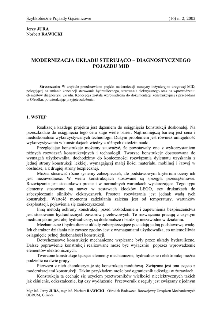 Szybkobieżne Pojazdy Gąsienicowe (16) nr 2, 2002 Jerzy JURA Norbert RAWICKI MODERNIZACJA UKŁADU STERUJĄCO – DIAGNOSTYCZNEGO POJAZDU MID Streszczenie: W artykule przedstawiono projekt modernizacji maszyny inżynieryjno-drogowej MID, polegającej na zmianie koncepcji sterowania hydraulicznego, sterowania elektrycznego oraz na wprowadzeniu elementów diagnostyki układu. Koncepcja została wprowadzona do dokumentacji konstrukcyjnej i przebadana w Ośrodku, potwierdzając przyjęte założenia . 1. WSTĘP Realizacja każdego projektu jest dążeniem do osiągnięcia konstrukcji doskonałej. Na przeszkodzie do osiągnięcia tego celu staje wiele barier. Najtrudniejszą barierą jest cena i niedoskonałość wykorzystywanych technologii. Dużym problemem jest również umiejętność wykorzystywania w konstrukcjach wiedzy z różnych dziedzin nauki. Przeglądając konstrukcje możemy zauważyć, że powstawały one z wykorzystaniem różnych rozwiązań konstrukcyjnych i technologii. Tworząc konstrukcję dostosowaną do wymagań użytkownika, dochodzimy do konieczności rozwiązania dylematu uzyskania z jednej strony konstrukcji lekkiej, wymagającej małej ilości materiału, mobilnej i łatwej w obsłudze, a z drugiej strony bezpiecznej. Można stosować różne systemy zabezpieczeń, ale podstawowym kryterium oceny ich jest niezawodność. W wielu konstrukcjach stosowane są sprzęgła przeciążeniowe. Rozwiązanie jest stosunkowo proste i w normalnych warunkach wystarczające. Tego typu elementy stosowane są nawet w zestawach klocków LEGO, czy drukarkach do zabezpieczania silników elektrycznych. Prostota rozwiązania jest jednak wadą tych konstrukcji. Wartość momentu zadziałania zależna jest od temperatury, warunków eksploatacji, pojawienia się zanieczyszczeń. Inną metodą ochrony konstrukcji przed uszkodzeniem i zapewnienia bezpieczeństwa jest stosowanie hydraulicznych zaworów przelewowych. Te rozwiązania pracują z czystym medium jakim jest olej hydrauliczny, są doskonalsze i bardziej niezawodne w działaniu. Mechaniczne i hydrauliczne układy zabezpieczające posiadają jedną podstawową wadę. Ich charakter działania nie zawsze zgodny jest z wymaganiami użytkownika, co uniemożliwia osiągnięcie pełnej doskonałości konstrukcji. Dotychczasowe konstrukcje mechaniczne wspierane były przez układy hydrauliczne. Dalsze poprawienie konstrukcji realizowane może być wyłącznie poprzez wprowadzenie elementów elektronicznych. Tworzone konstrukcje łączące elementy mechaniczne, hydrauliczne i elektronikę można podzielić na dwie grupy. Pierwsza z nich charakteryzuje się konstrukcją modułową. Związana jest ona często z modernizacjami konstrukcji. Takim przykładem może być ogranicznik udźwigu w żurawiach. Konstrukcja ta cechuje się użyciem przetworników wielkości nieelektrycznych takich jak ciśnienie, odkształcenie, kąt czy wydłużenie. Przetwornik z reguły jest związany z jednym Mgr inż. Jerzy JURA, mgr inż. Norbert RAWICKI - Ośrodek Badawczo-Rozwojowy Urządzeń Mechanicznych OBRUM, Gliwice Jerzy JURA, Norbert RAWICKI zabezpieczeniem i nie jest wykorzystywany do innych celów. Przetwarzane sygnały są dwustanowe, a wartości ciągłe poddawane są komparacji w celu uzyskania sygnałów dwustanowych. Druga grupa rozwiązań związana jest z zastosowaniem wielu nowych technologii. Konstrukcje te pojawiły się najwcześniej w przemyśle kosmiczno – wojskowym. Rozwiązania były drogie i nie stosowane ani w przemyśle cywilnym, ani w rozwiązaniach dla polskiej armii. Wprowadzenie nowych technologii do rozwiązań cywilnych pozwoliło dokonać modernizacji jednego z ciekawszych pojazdów inżynieryjnych użytkowanych przez polską armię – maszyny inżynieryjno-drogowej MID. 2. KRÓTKA CHARAKTERYSTYKA WYROBU Czołgi saperskie takie jak MID charakteryzują się różnorodnym wyposażeniem i osprzętem inżynieryjnym, co zapewnia realizację zadań stojących przed wojskami saperskimi związanymi z inżynieryjnym zabezpieczeniem ruchu i manewrów wojsk oraz prac ratunkowo-ewakuacyjnych. Pojazdy tego typu, oprócz wykonywania zadań na współczesnym polu walki, odgrywają dużą rolę w niesieniu pomocy technicznej na terenach objętych klęskami żywiołowymi lub katastrofami. Coraz częściej wykorzystywane są również w trakcie misji pokojowych. Dzięki wyposażeniu pojazdu MID w lemiesz spycharkowy (ustawiany do pracy w dwóch położeniach: czołowym lub w strzałę), wyciągarkę główną i pomocniczą, manipulator z wymiennym osprzętem, takim jak łyżka koparkowa, zrywak zębowy, chwytak szczękowy, zawiesie linowe, urządzenia do cięcia i spawania gazowego i elektrycznego, skrzynię ładunkową i urządzenia sztywnego holu oraz z możliwością podłączenia dodatkowego osprzętu hydraulicznego jak: młot hydrauliczny, wiertnica hydrauliczna, nożyce hydrauliczne czy piłą hydrauliczna, jest on w stanie wykonać większość postawionych mu zadań. Rys.1. Widok ogólny pojazdu MID Do napędu i sterowania większości osprzętu służy układ hydrauliczny wraz ze sterowaniem elektrycznym. Sprawność i niezawodność działania wymagają aby pojazd posiadał nowoczesne sterowanie i diagnostykę układu, która jest jednym z istotnych problemów w wyrobie. Modernizacja układu sterująco-diagnostycznego pojazdu MID 3. ZAŁOŻENIA DO MODERNIZACJI WYROBU Podstawowymi założeniami do modernizacji były: wprowadzenie nowych technologii, zastąpienie starych i nie produkowanych zespołów nowymi, wprowadzenie diagnostyki zespołów hydraulicznych, przystosowanie układu sterowania osprzętem do zdalnego sterowania, obniżenie wagi oraz kosztów zakupu podzespołów układu hydraulicznego, skrócenie procesów montażu i uruchomienia dających w efekcie obniżenie pracochłonności. 4. UKŁAD HYDRAULICZNY PRZED MODERNIZACJĄ Układ hydrauliczny przed modernizacją zasilany był z 2 pomp tłoczkowych A7V060DRS i A7V107DRS wsp